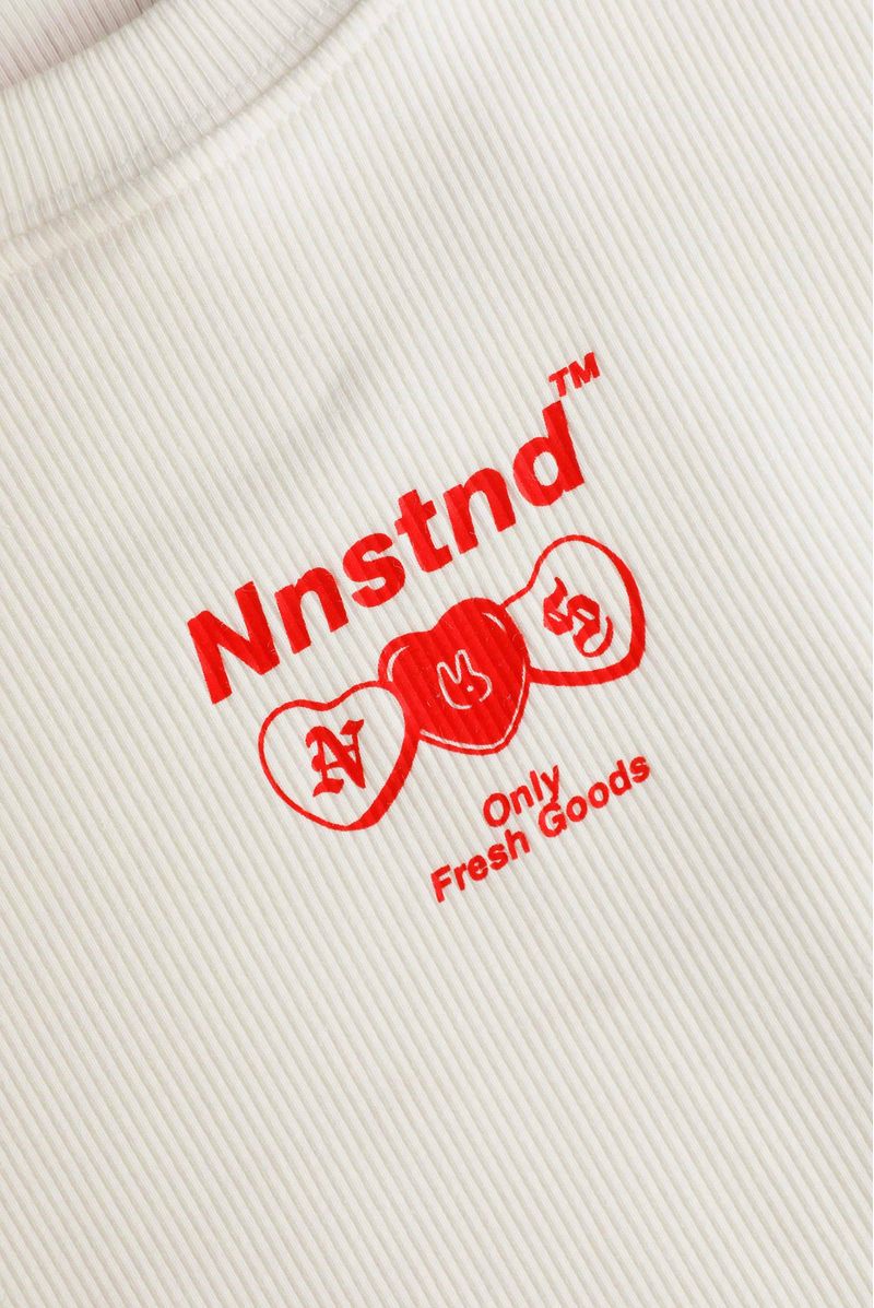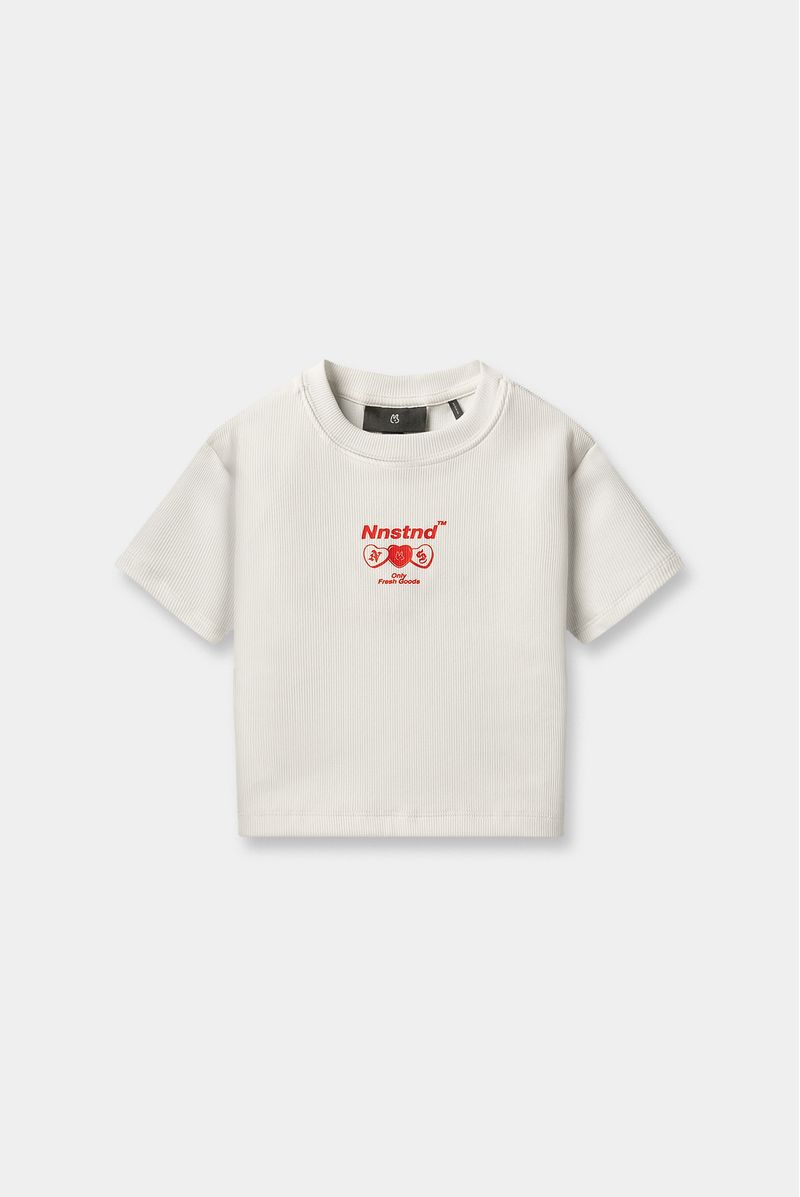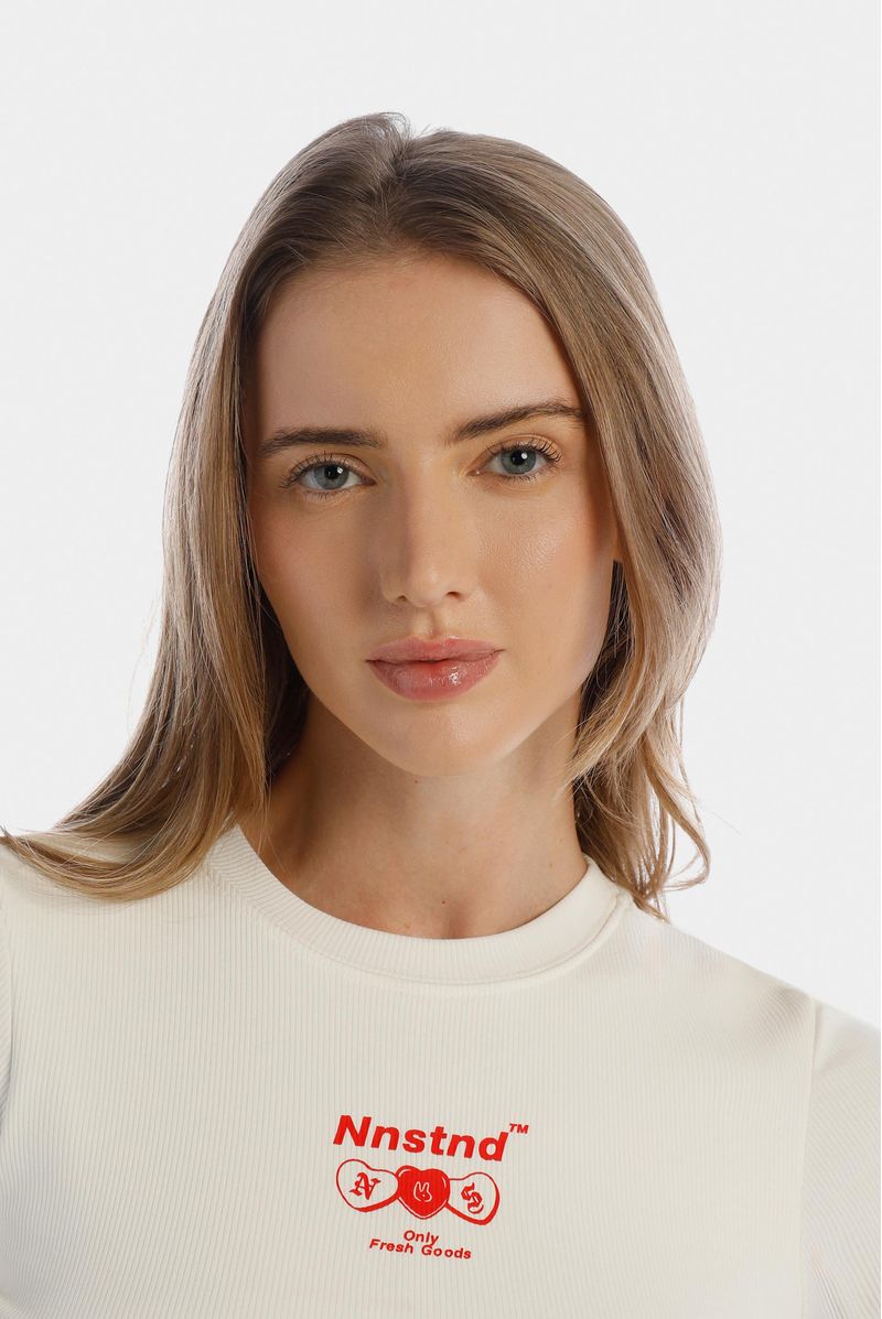 Camiseta marfil confeccionada en un rib 1X1 con elastano de 270 gramos. La prenda tiene textos e ilustraciones pequeñas en plastisol rojo en delantero y posterior.