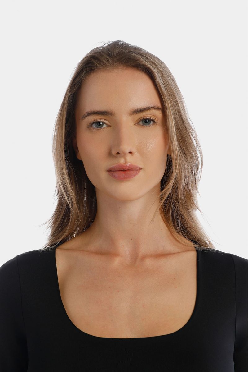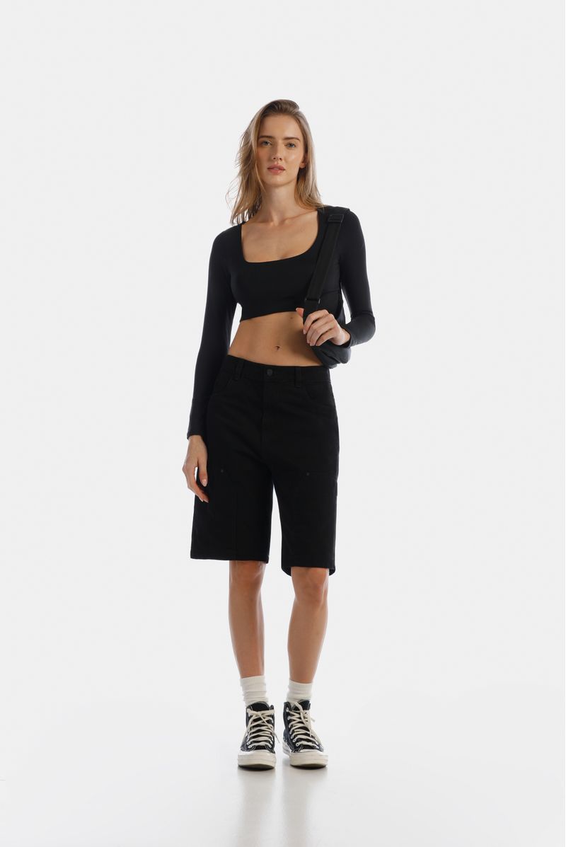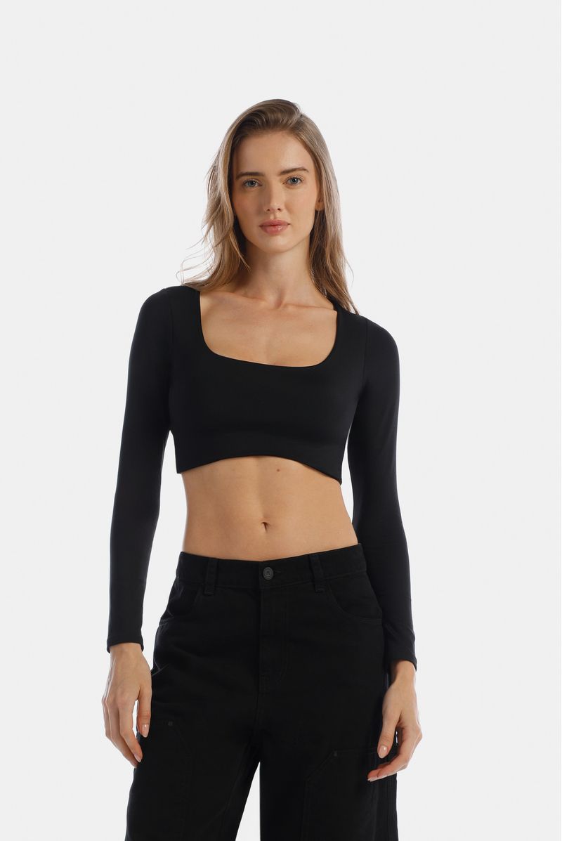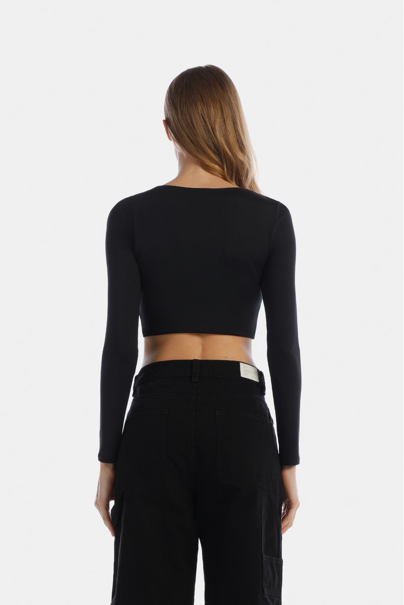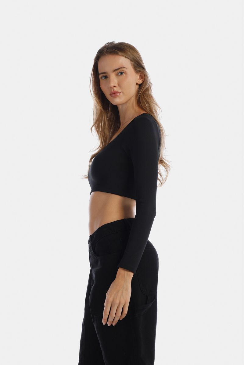 Top manga larga crop negro confeccionado en un jersey con elastano de 250 gramos. Escote delantero redondo en la parte superior, ruedo terminado con una leve curvatura.