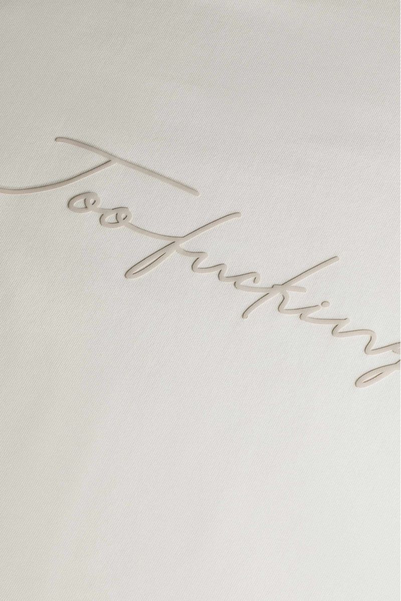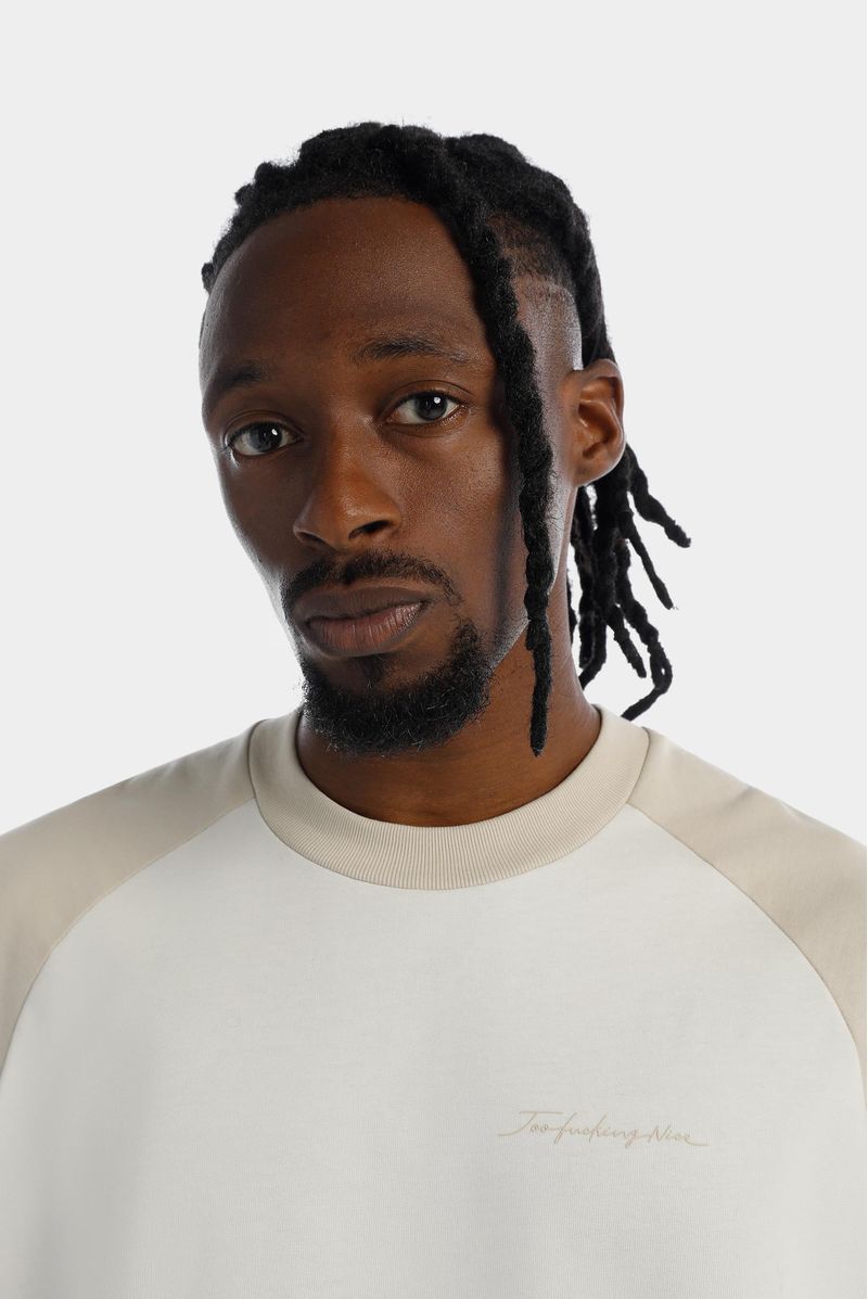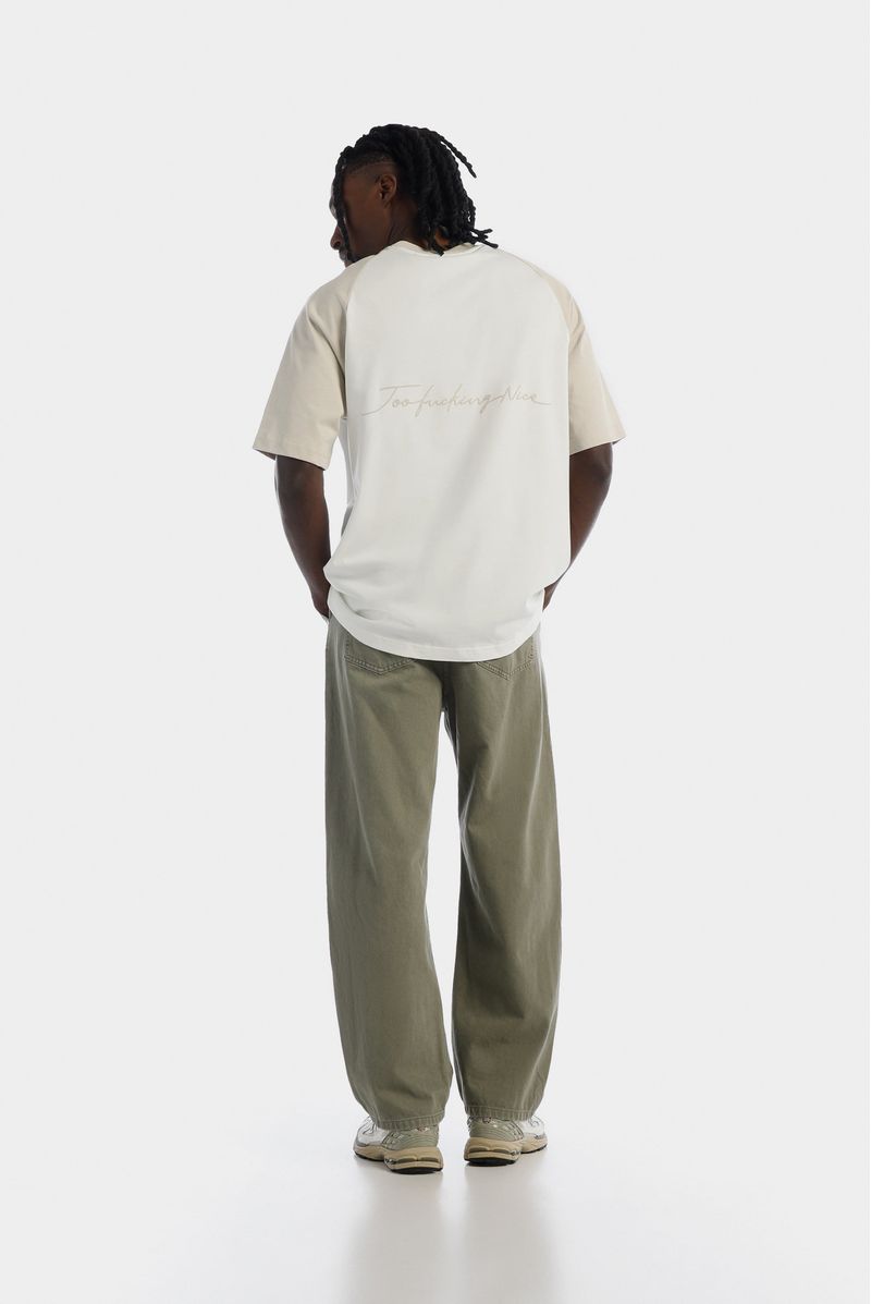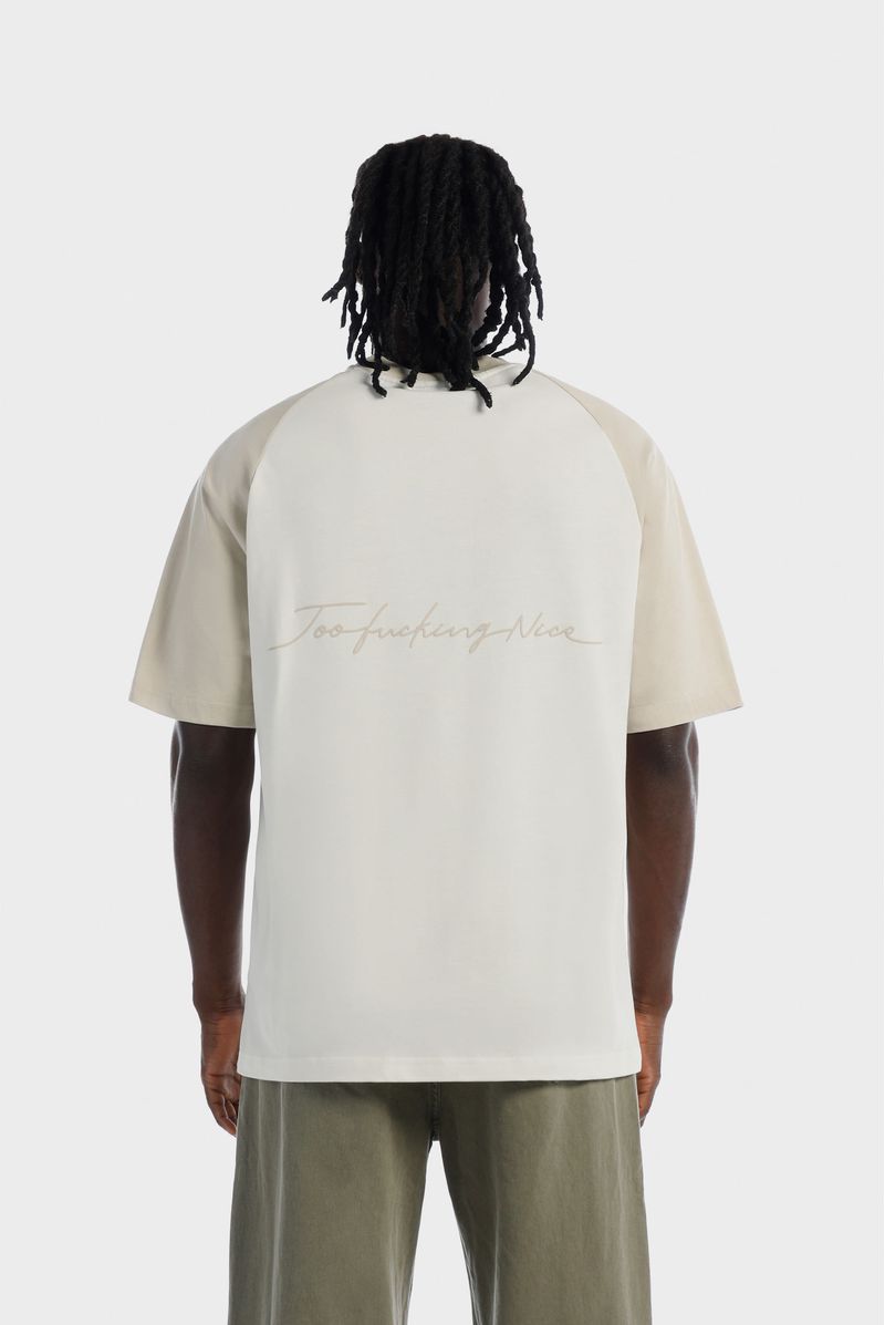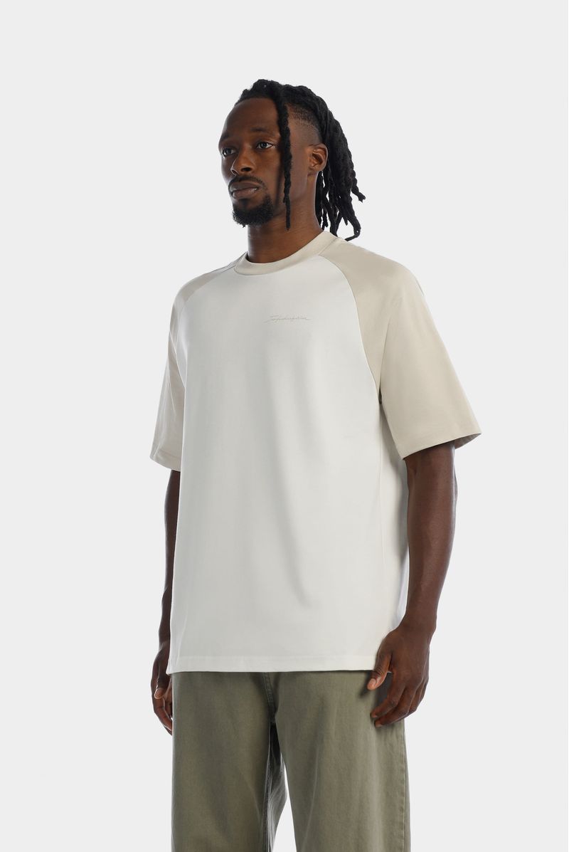 Camiseta Oversize confeccionada en un Jersey Premium de alto gramaje de 250gr de peso. Con estampación en frente y espalda en alta densidad, lo cual le da relieve al texto. Lleva mangas tipo ranglan en contraste color beige y un banderin en ruedo.