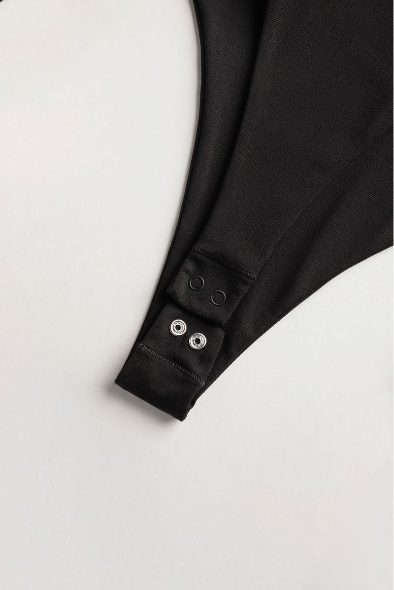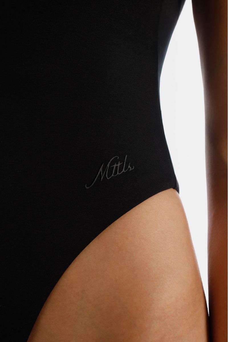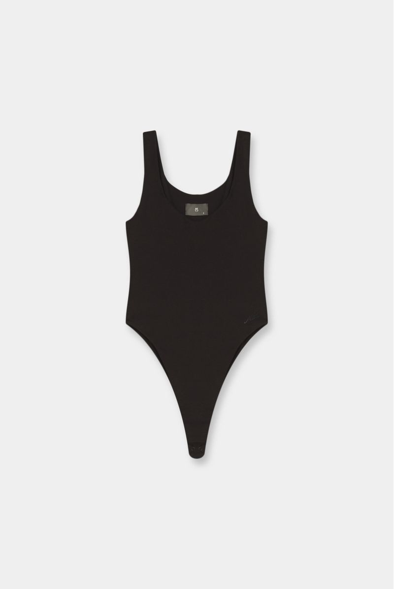 Body negro confeccionado en un jersey con elastano de 200 gramos. Texto en parte alta de pierna estampado en plastisol en alta densidad entonado a la base de la tela. Broches en entrepierna. Toda la prenda es doble.
