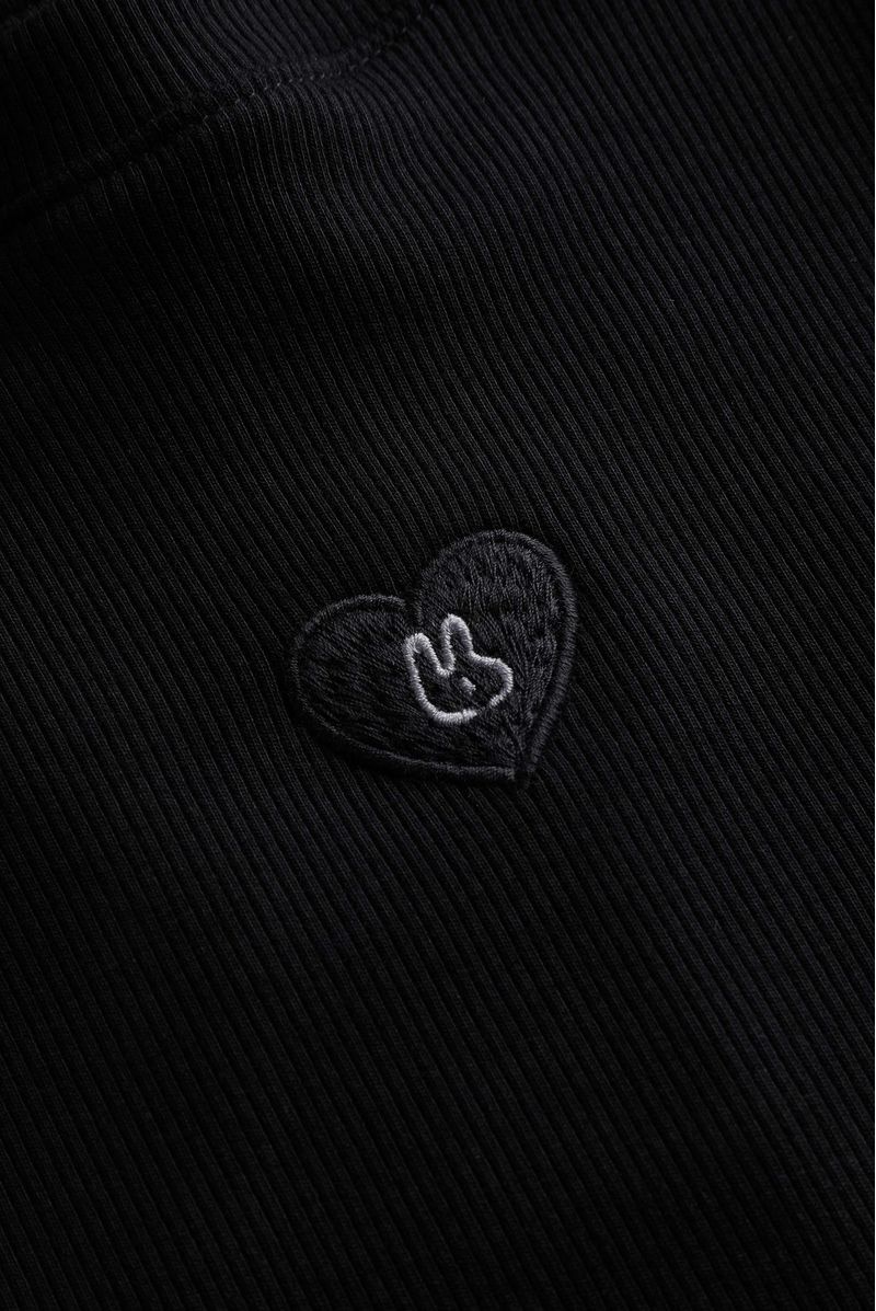 Body manga corta negro confeccionado en un rib de 280 gramos de peso. Corazón con conejo interno bordado directo sobre centro pecho. Broches en entrepierna.