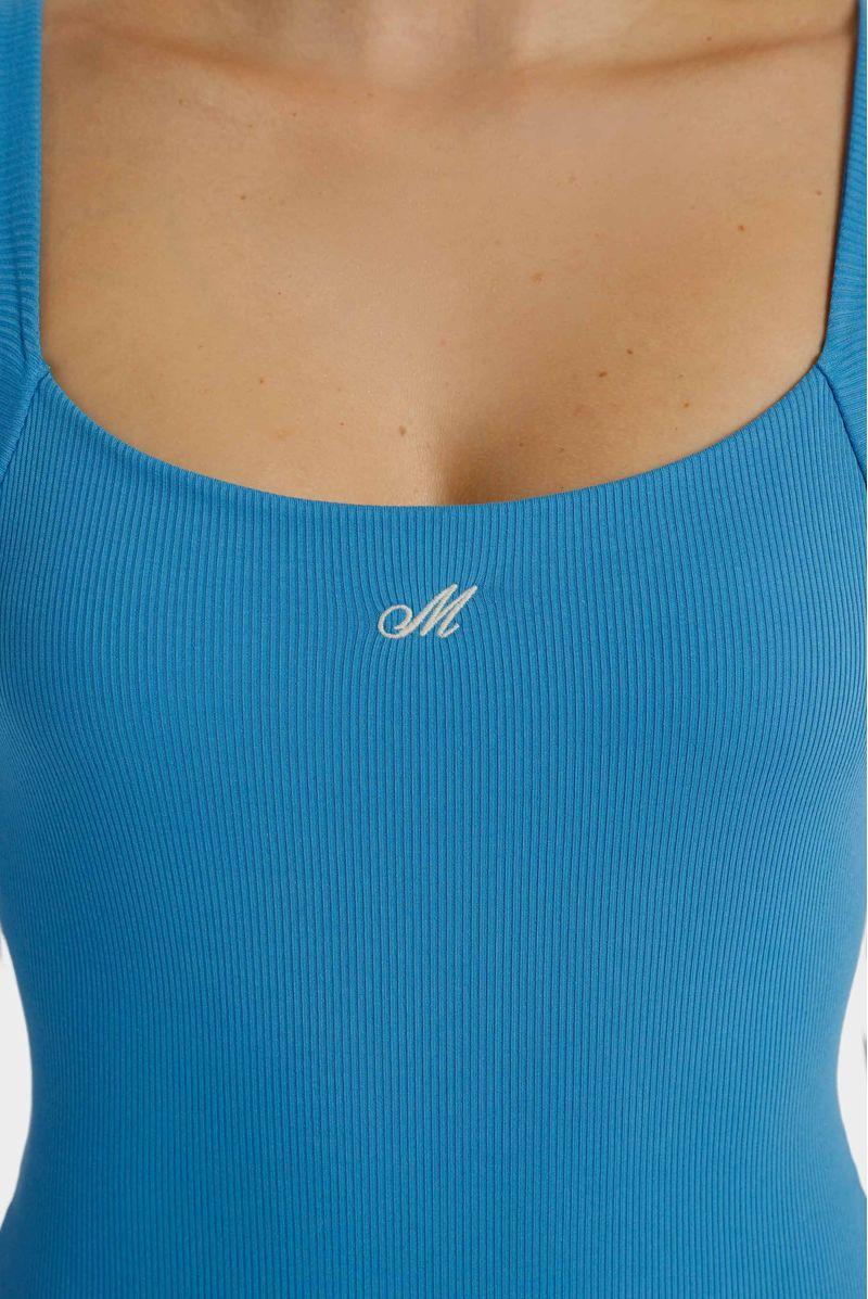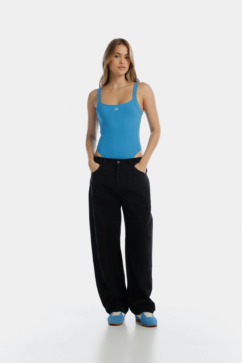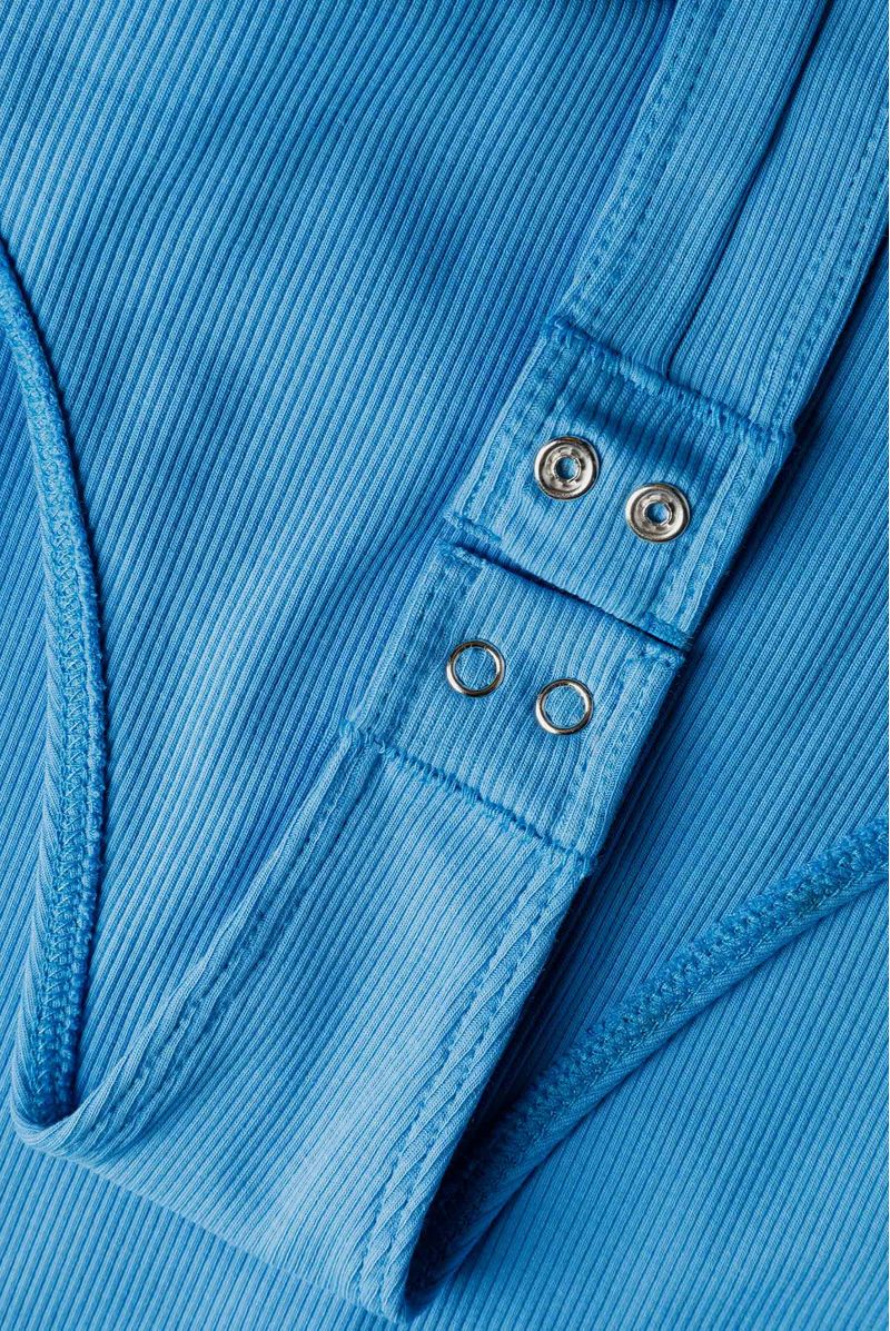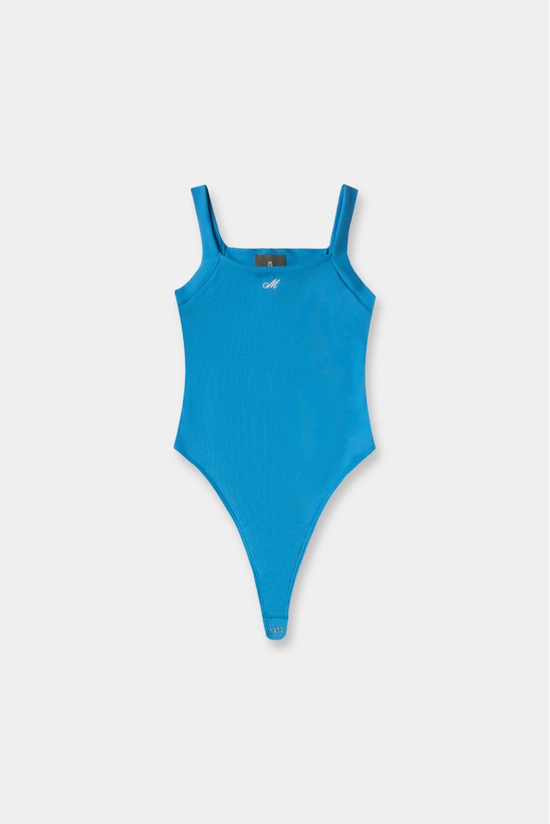 Body azul, confeccionado en un Rib 2X2 con elastano de 280 gramos. Delantero va doble, lleva cargaderas en pieza y broches en la entrepierna. Tiene bordado en el centro delantero.