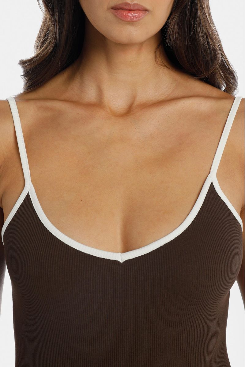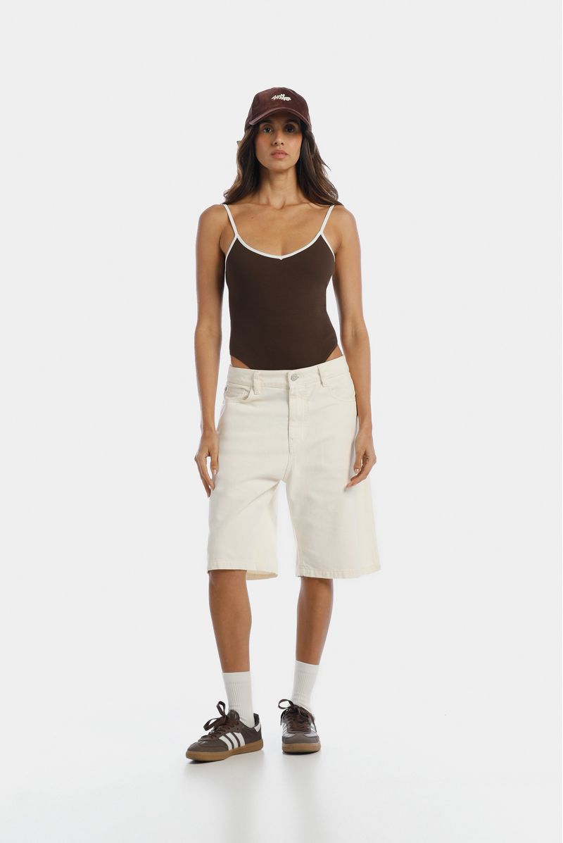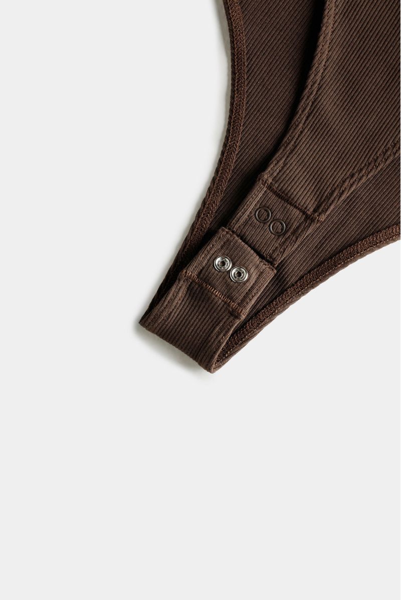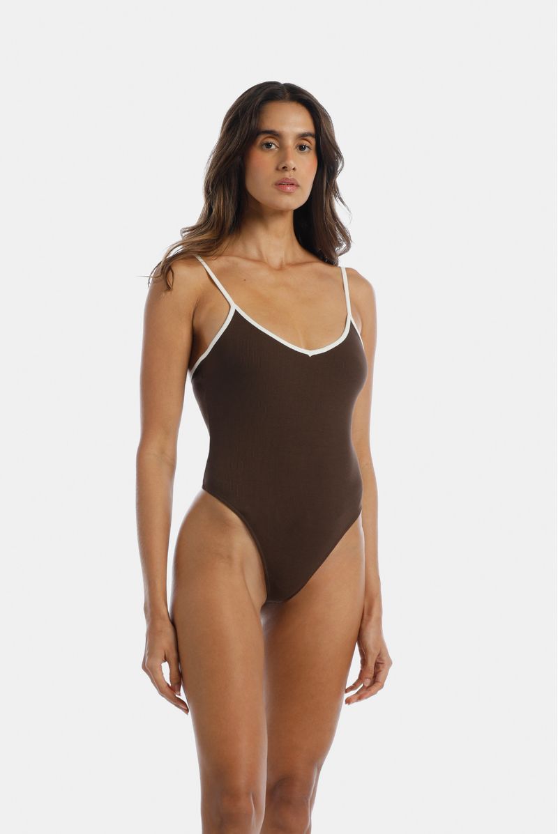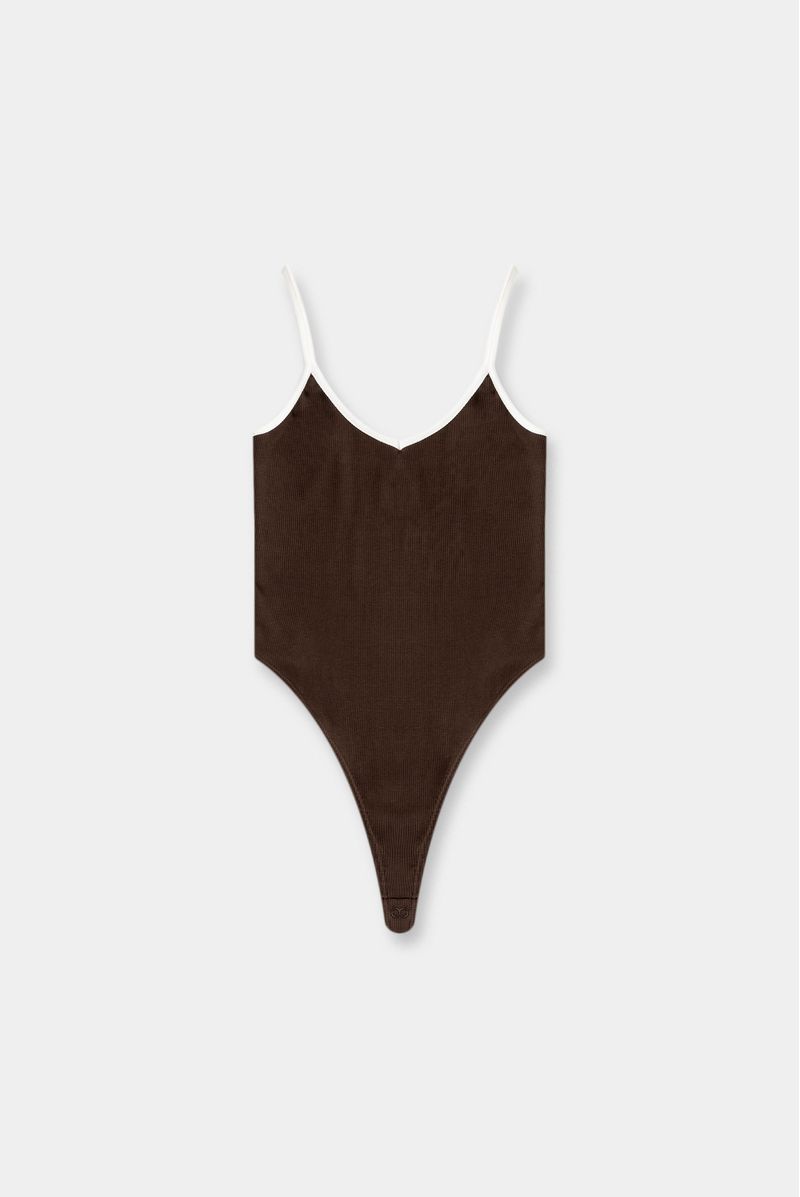 Body café confeccionado en un rib 2X2 de 280 gramos. Escote en V y sisas terminadas en sesgo marfil. Aplique bordado en posterior. Broches en entrepierna.