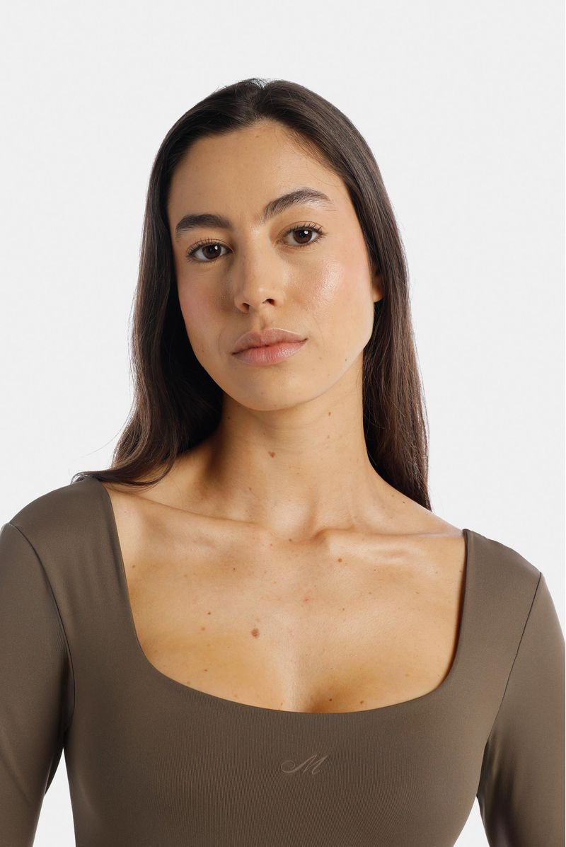 Body manga larga café con escote cuadrado, confeccionado en un jersey con elongación de 250 gramos. Letra M estampada en plastisol en alta densidad en color café en escote delantero. Lleva broches en entrepierna.