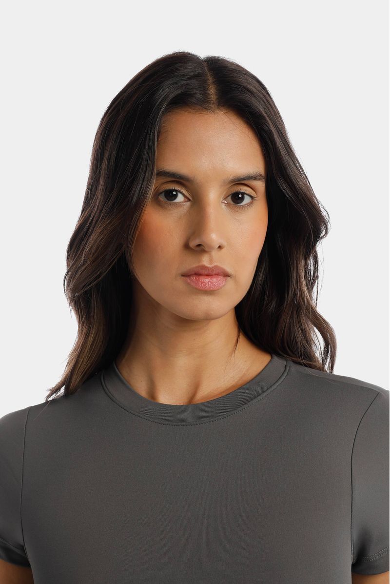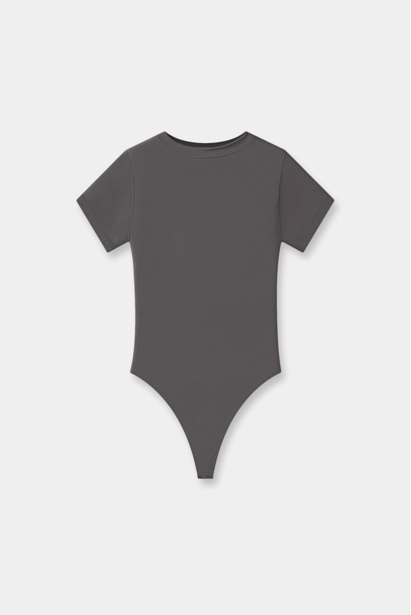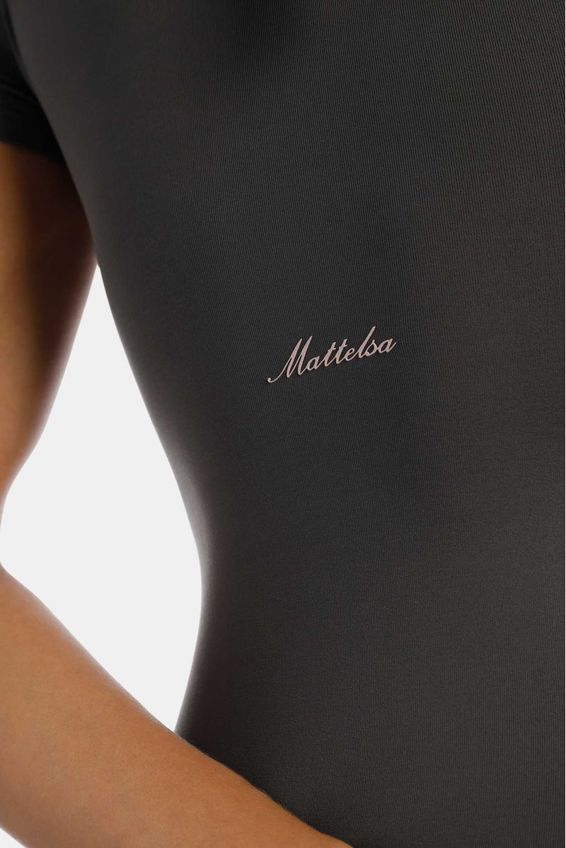 Body manga corta gris confeccionado en un jersey con elastano de 250 gramos. Texto Mattelsa en espalda en plastisol en alta densidad en color rosado. Prenda es doble en el delantero. Posterior sencillo.