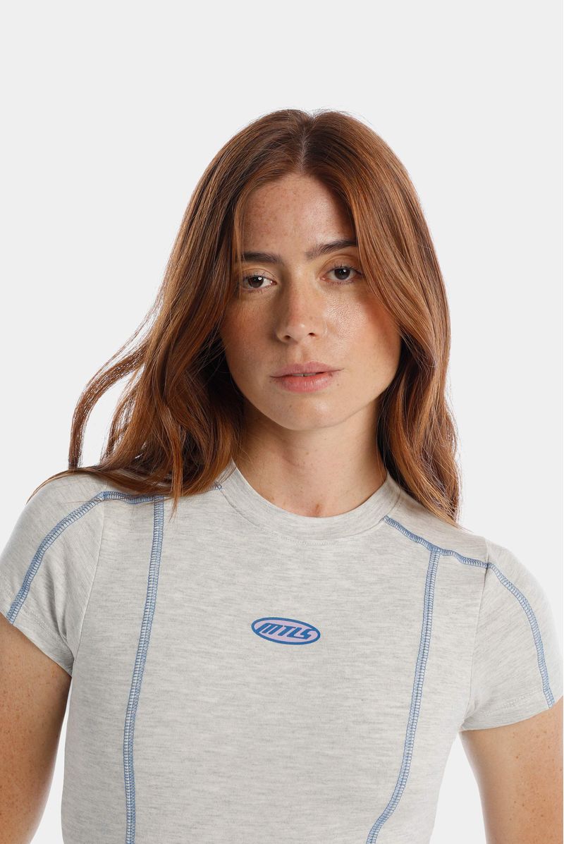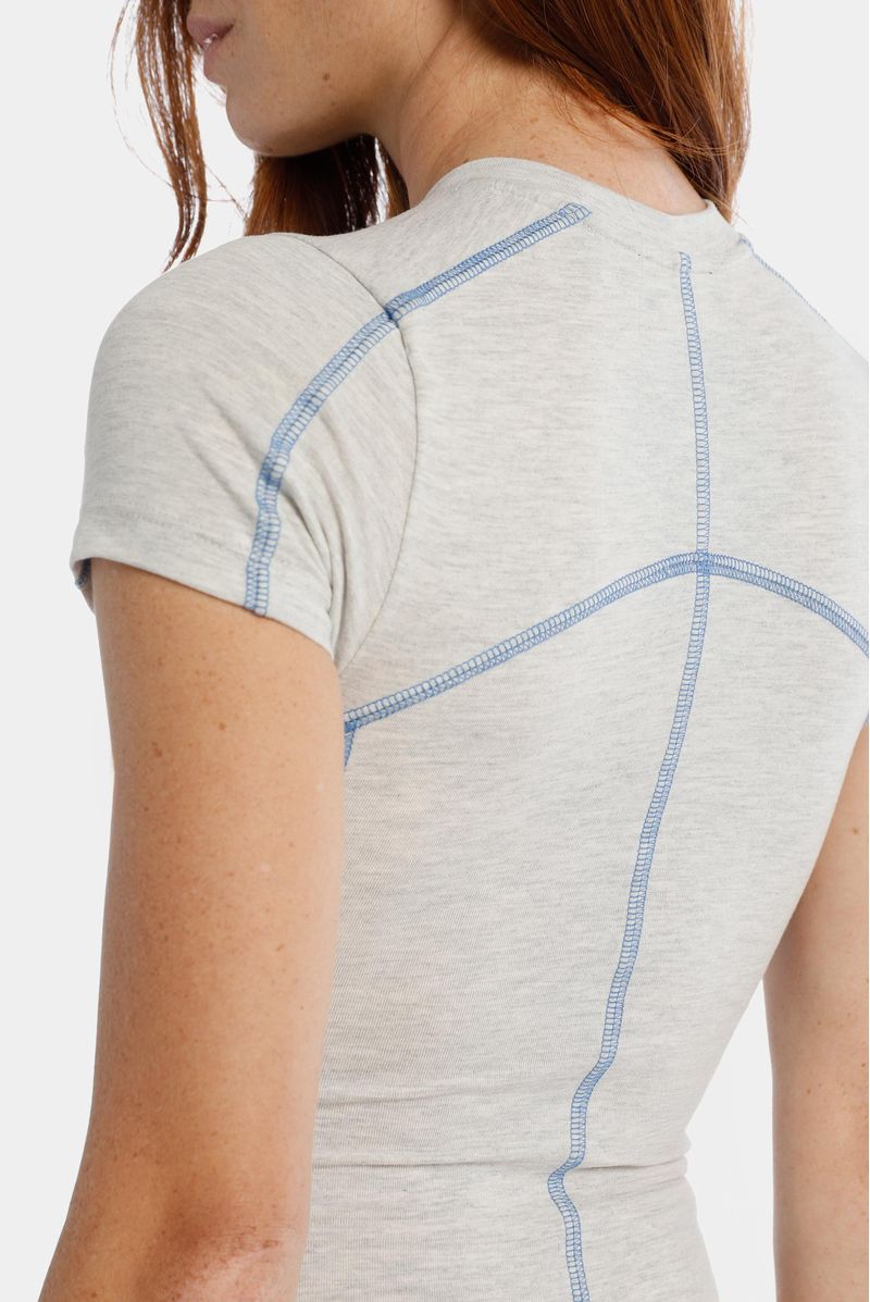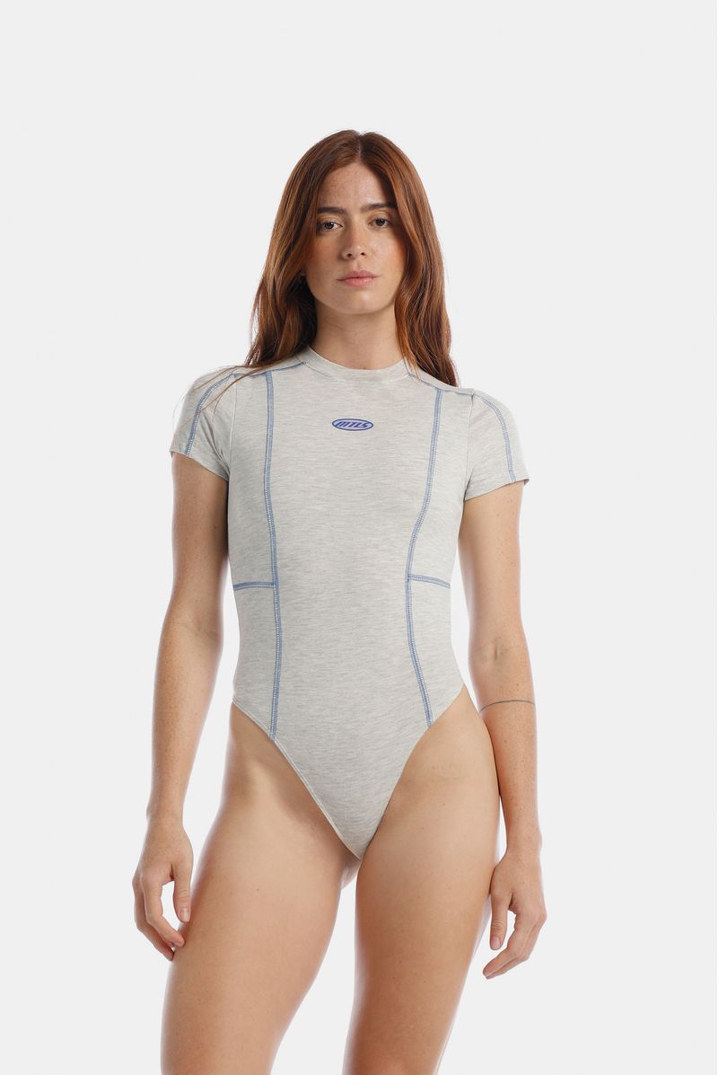 Body manga corta gris jaspe confeccionado en un jersey con elastano de 200 gramos. Cortes técnicos de construcción asentados en puntada decorativa en hilo azul. Texto estampado en plastisol en el centro de delantero. Broches en entrepierna.