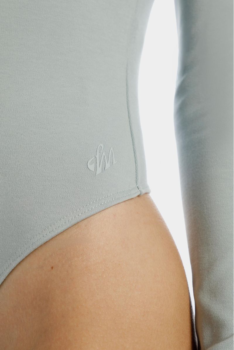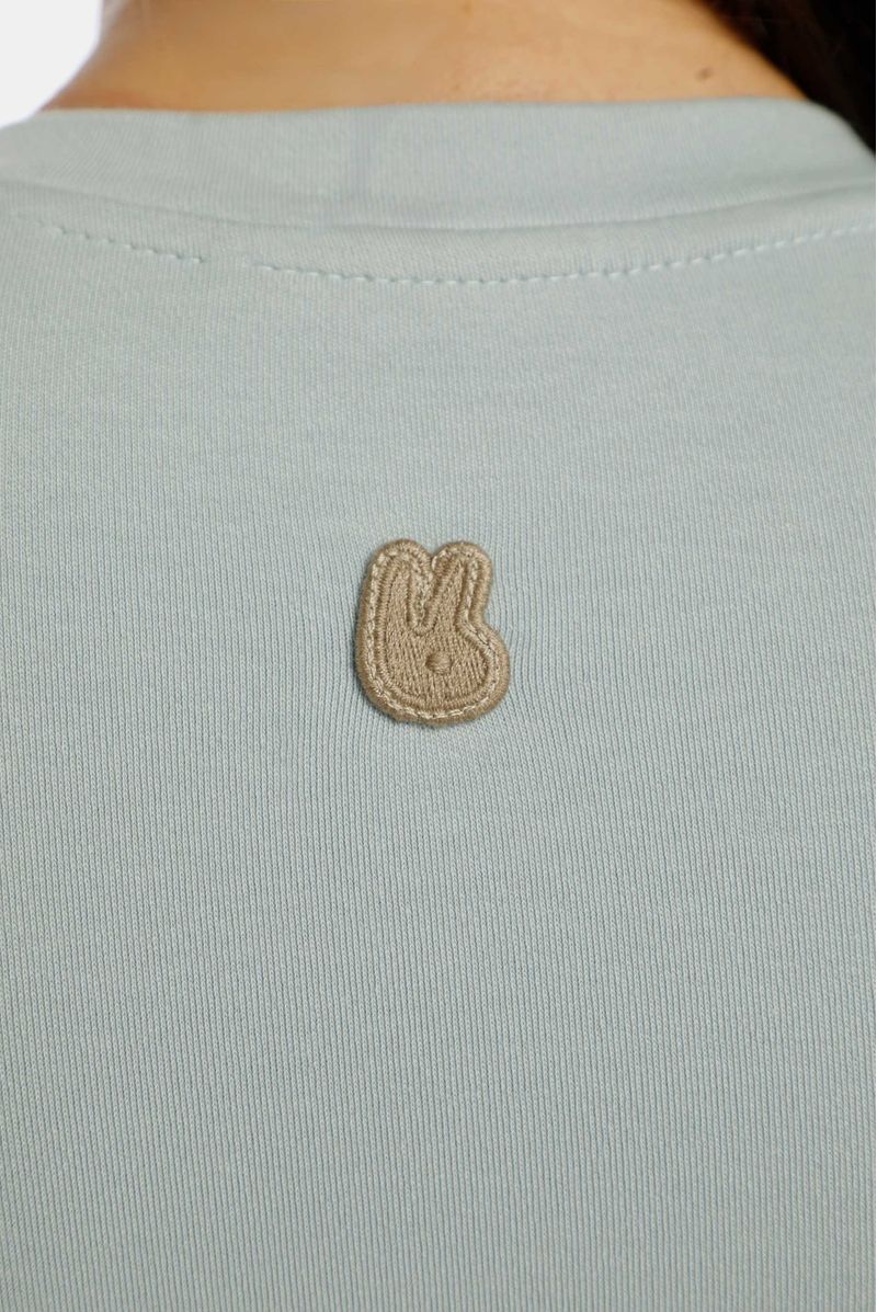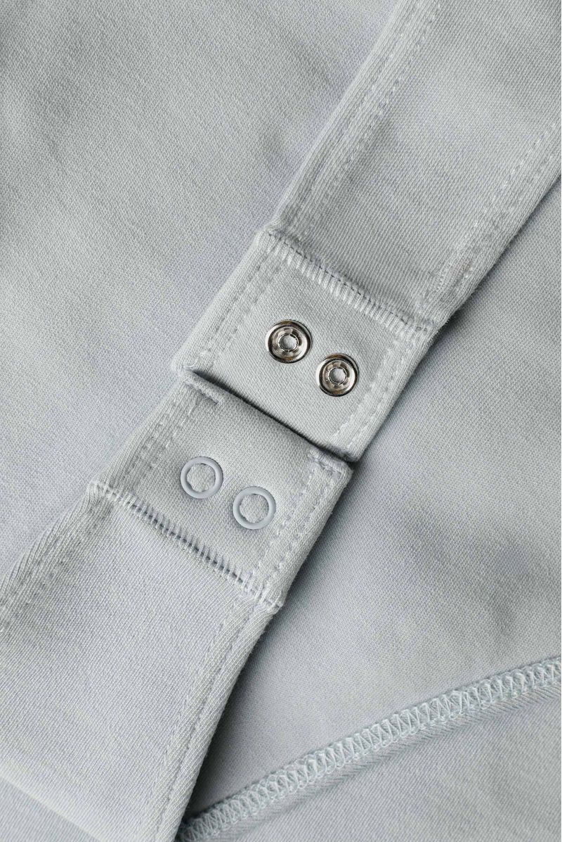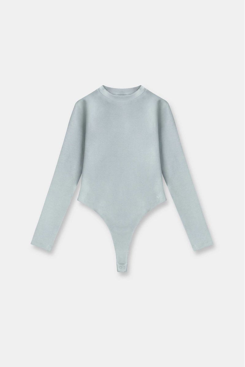 Body azul manga larga, confeccionado en un Jersey con elastano de 420gr. Lleva aplique conejo bordado en el centro posterior y broches en la entrepierna.