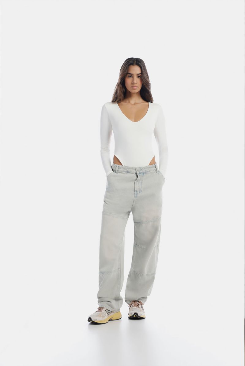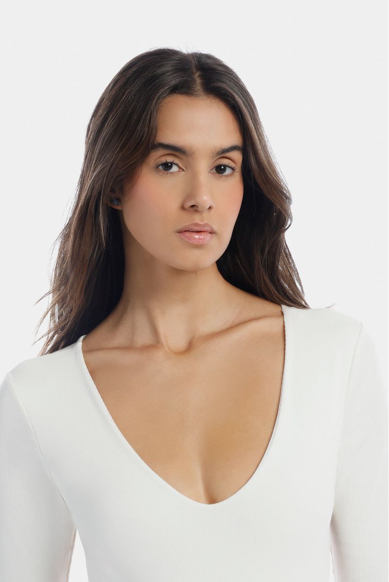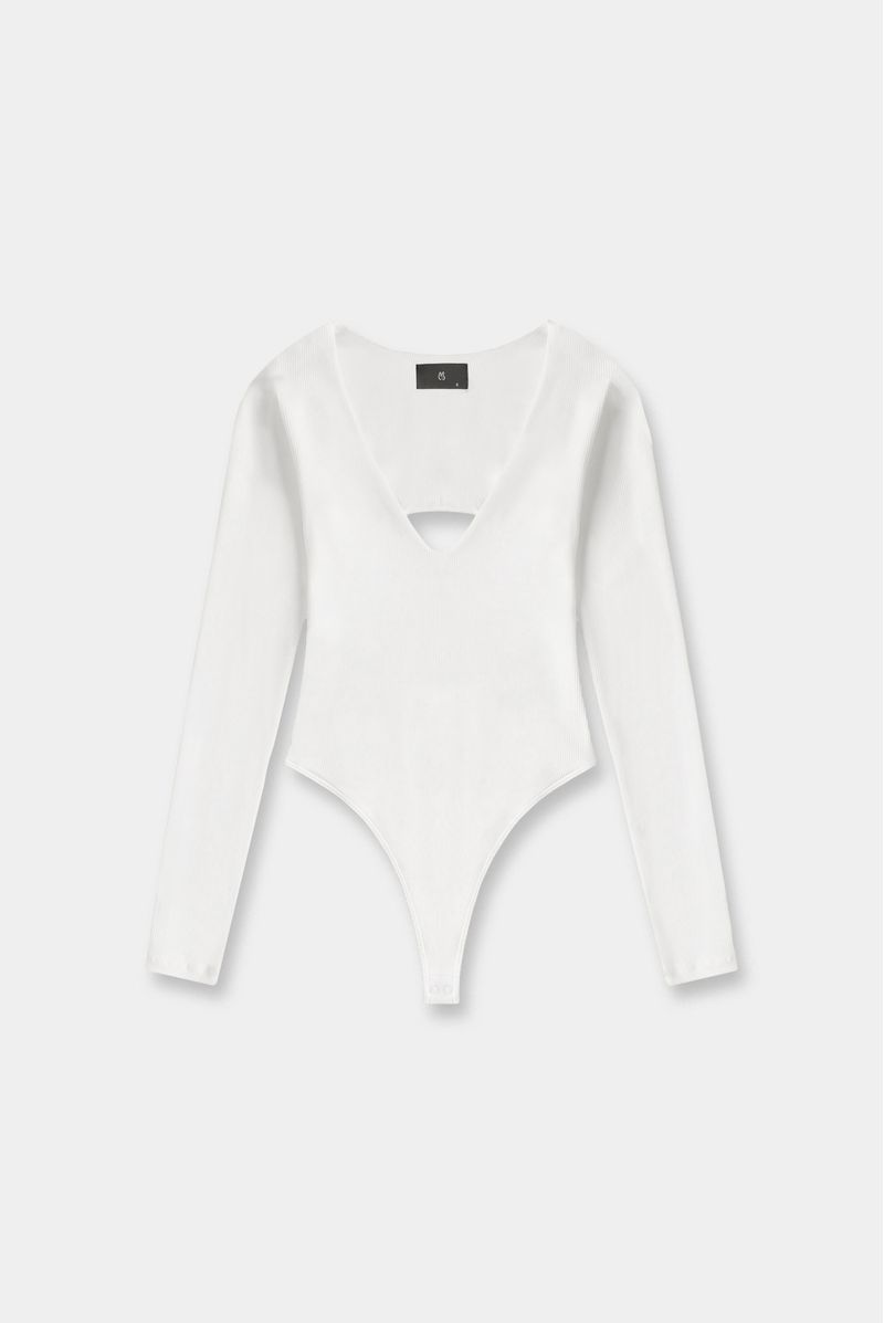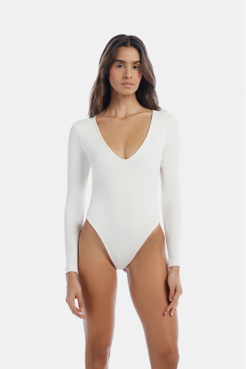 Body marfil manga larga confeccionado en un rib de 270 g. Presenta escote delantero en V y corte central en la espalda posterior. Lleva elástico en el contorno de las piernas y broches en la entrepierna. Toda la prenda es forrada en la tela principal.