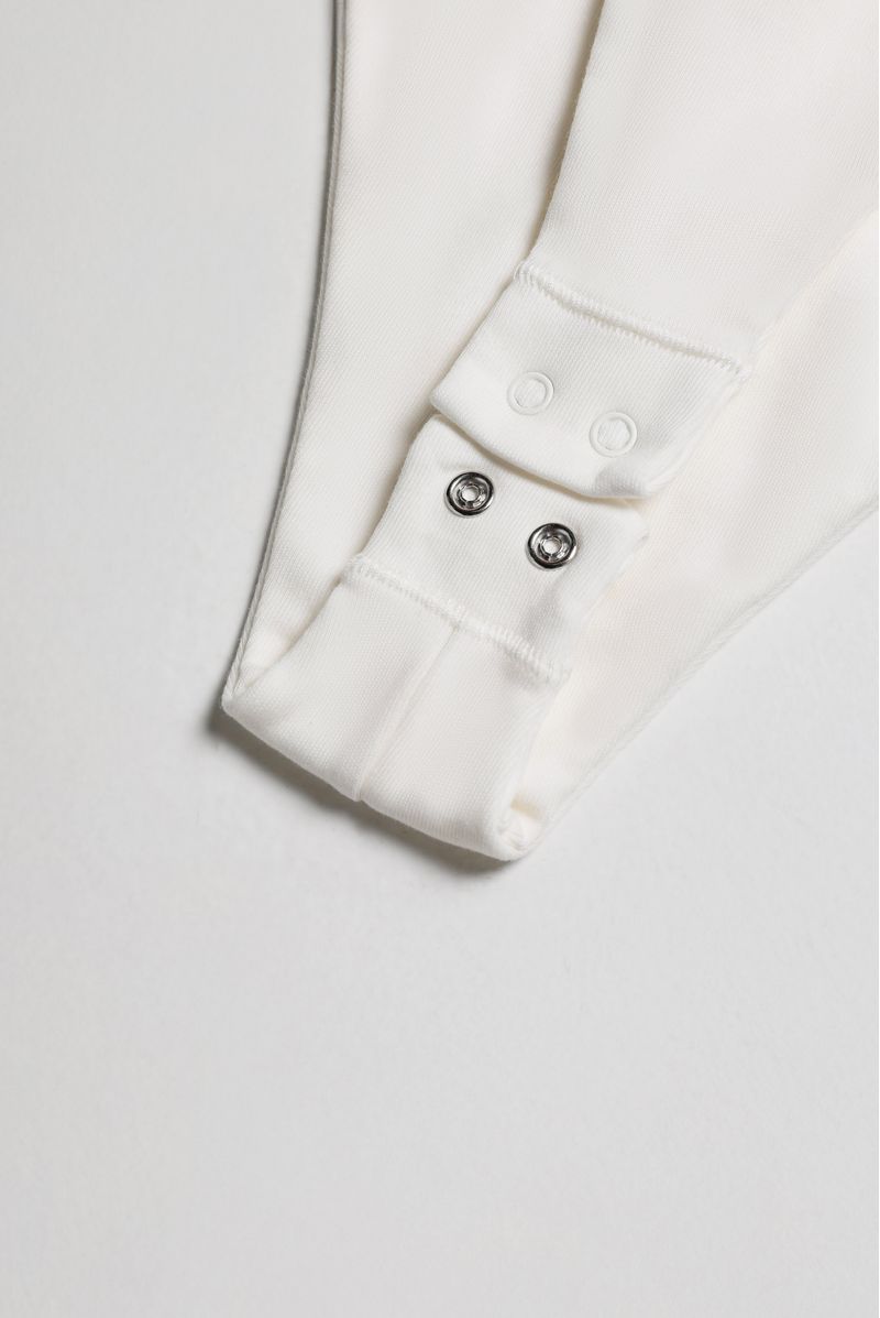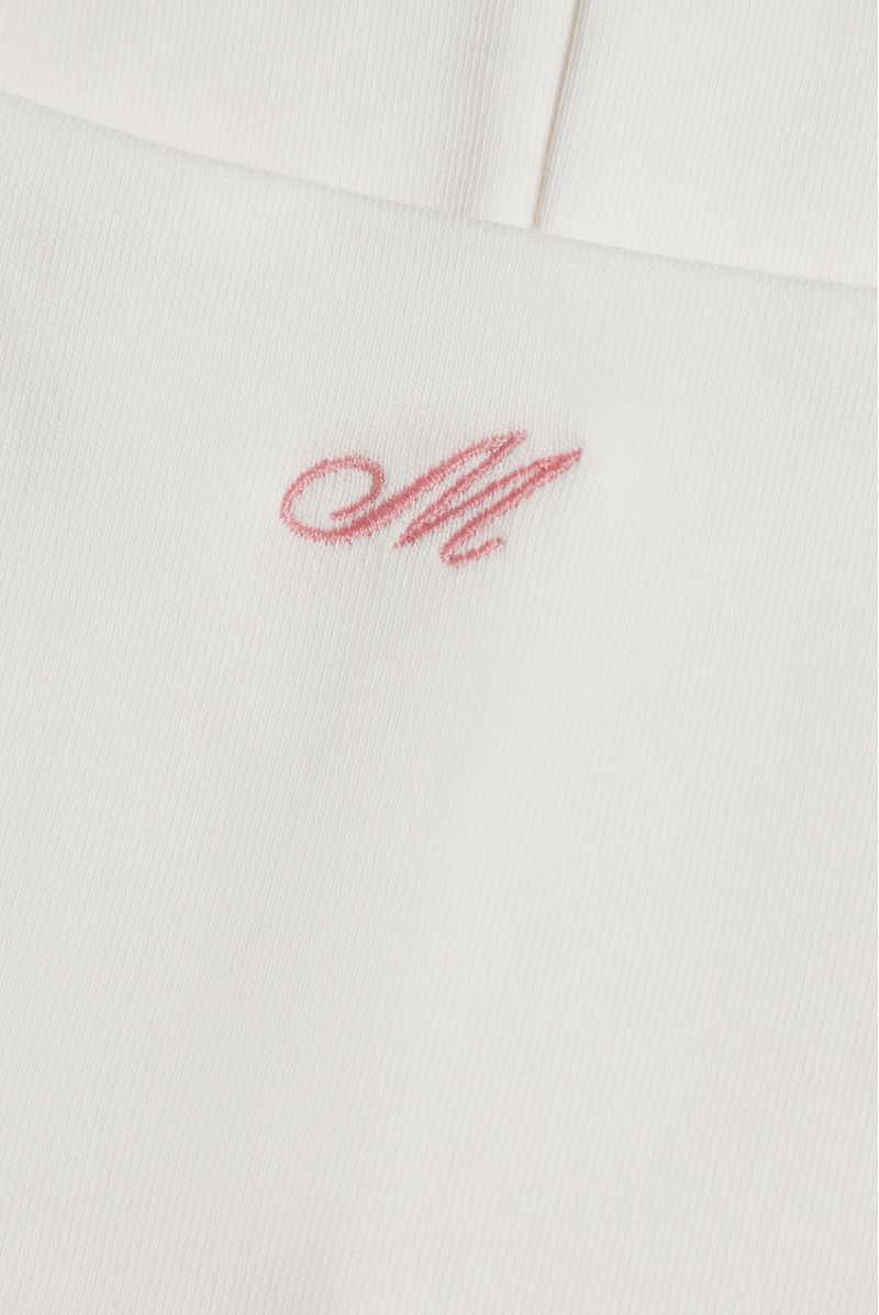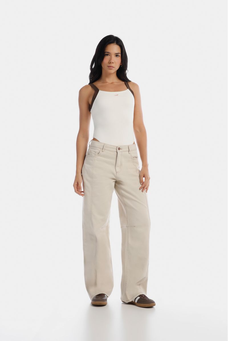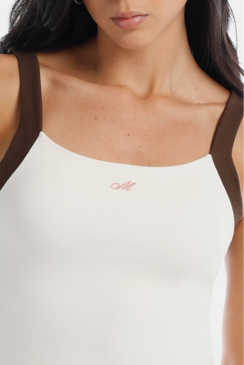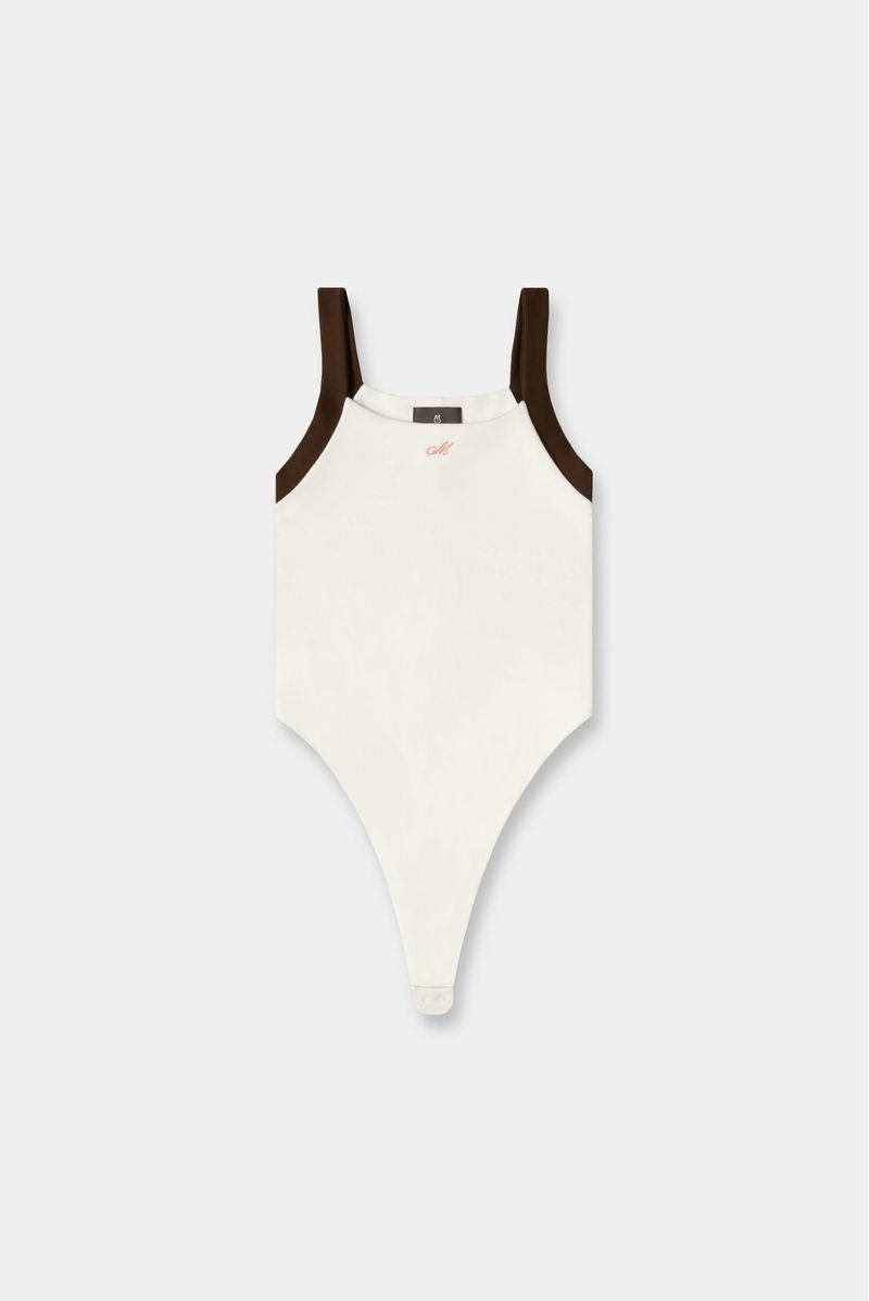 Body marfil de sesgos en contraste café confeccionado en jersey con elastano de 300 gramos. Tiene una letra M bordada en centro pecho color rosado. Abrochadura en entrepierna. Toda la prenda es doble.