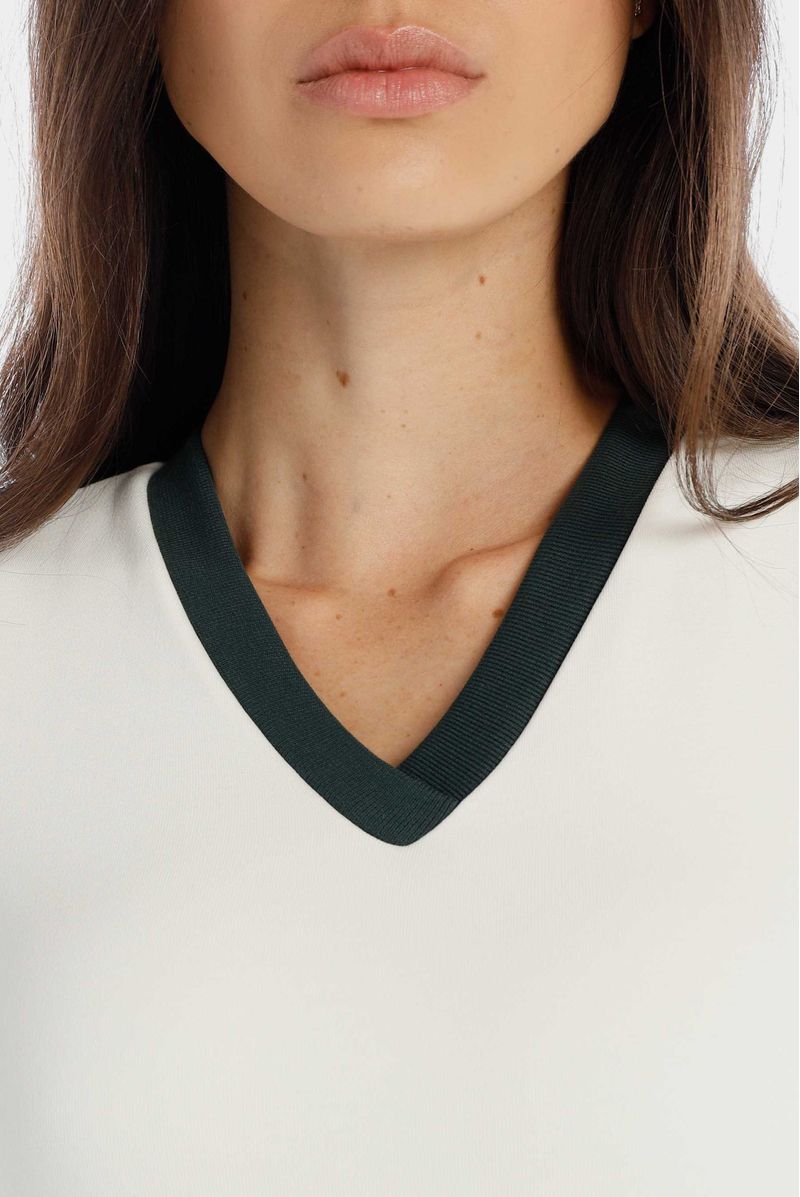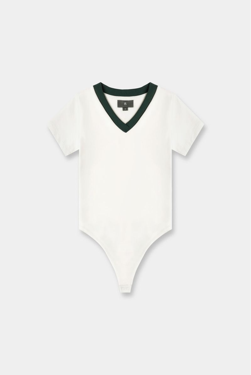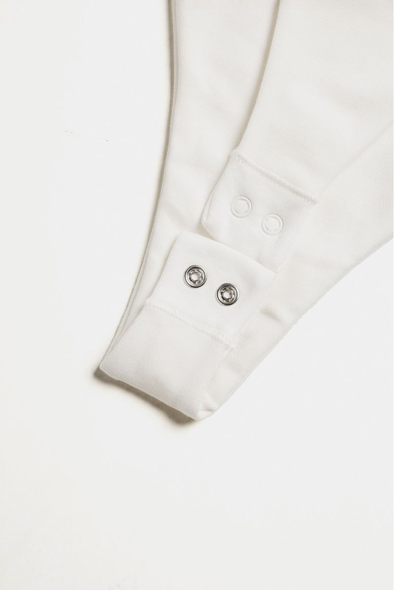 Body marfil de cuello en contraste verde confeccionado en un jersey con elastano de 300 gramos. Lleva estampado en posterior color verde. Toda la prenda es doble y lleva broches en entrepierna.