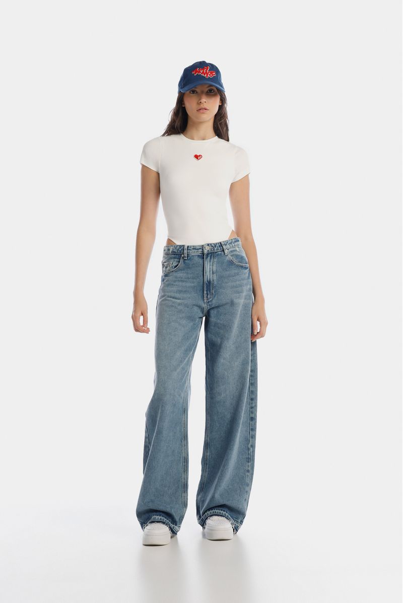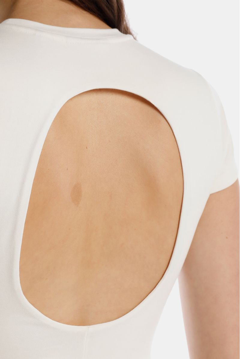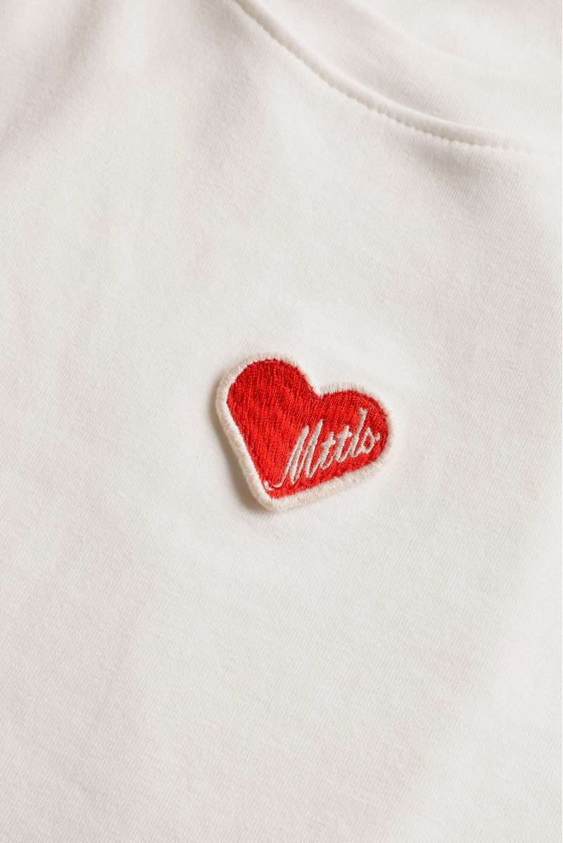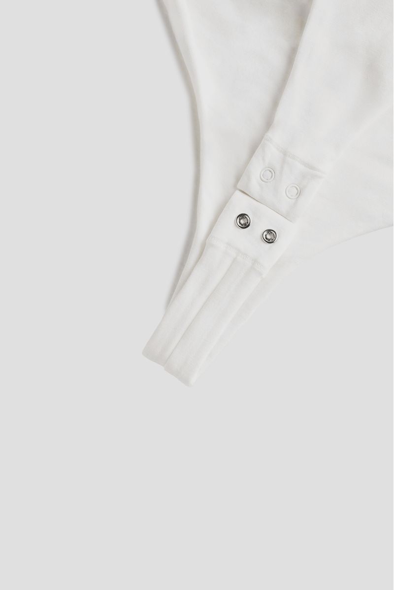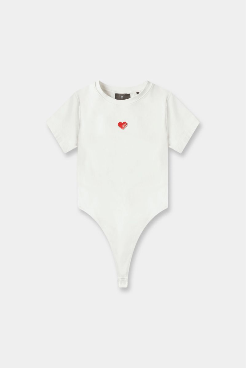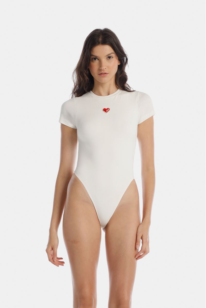 Body manga corta marfíl confeccionado en un jersey con elástano de 200 gramos. Aplique de corazón bordado sobre centro pecho. Abertura ovalada ubicada en todo el centro espalda. Toda la prenda es doble. Broches en entrepierna.