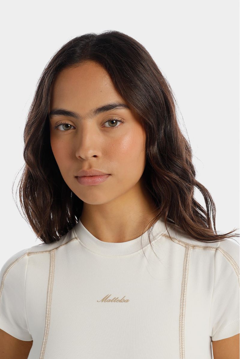 Body confeccionado en un jersey con elongación de 200 gramos. Tiene una estética con cortes de construcción asentados en puntada decorativa. Texto Mattelsa estampado en frente en técnica de plastisol en alta densidad. La estampación va tono a tono.