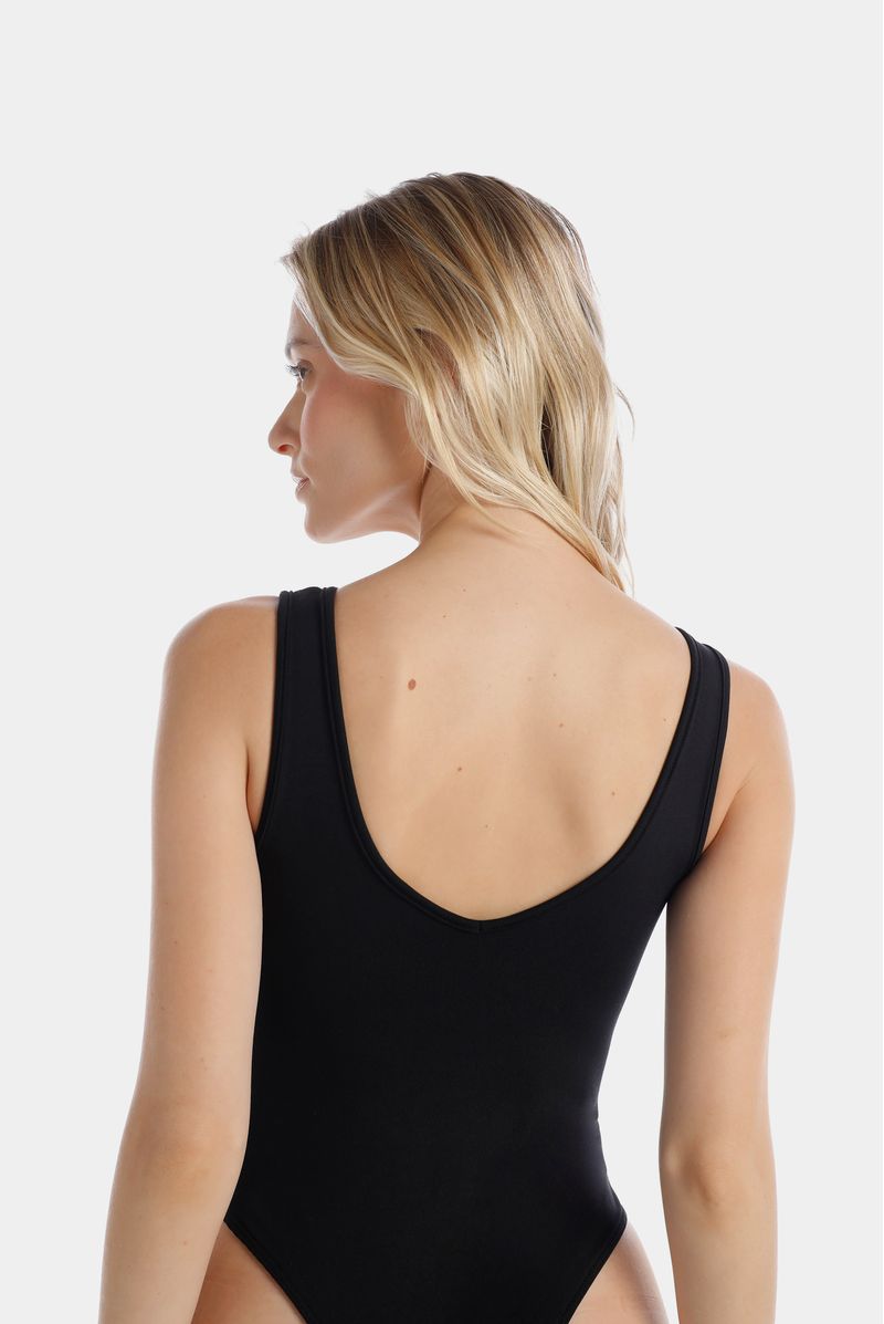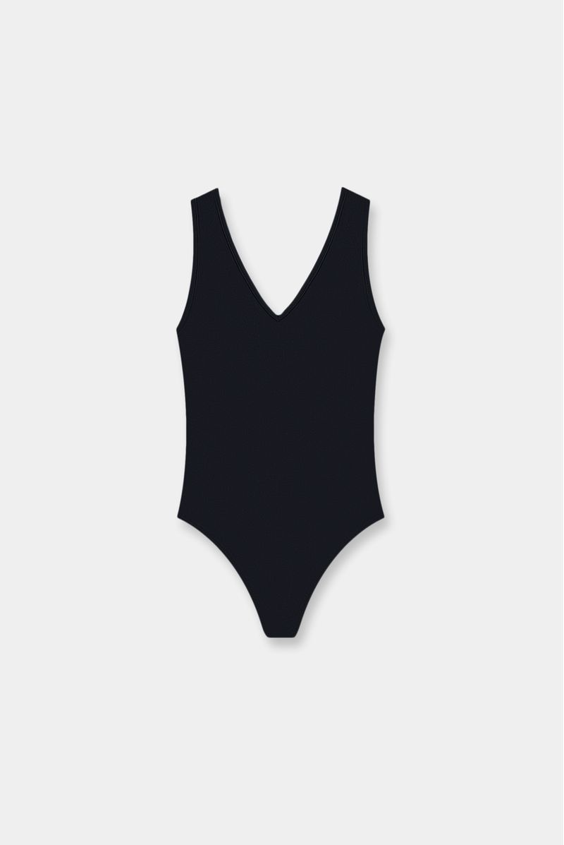 Body negro básico, confeccionado en un jersey con elastano de 250 gramos. Escote pronunciado en V. Broches en entrepierna, toda la prenda es doble.