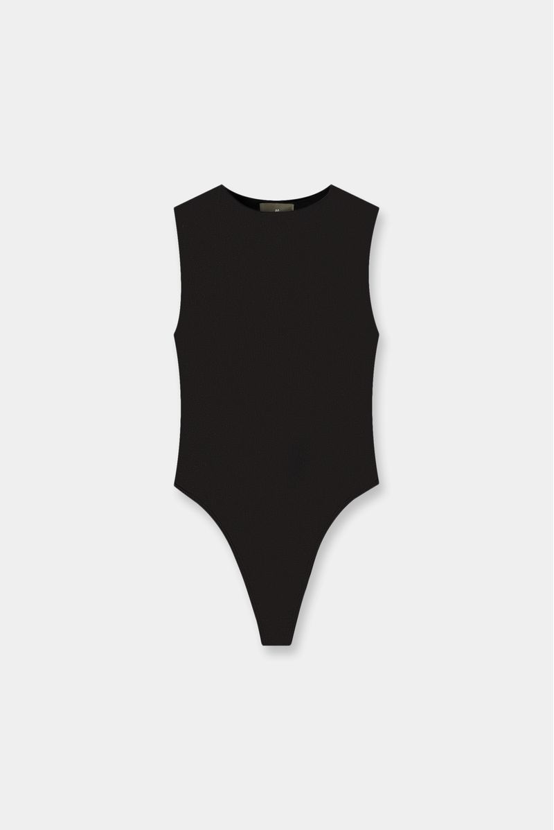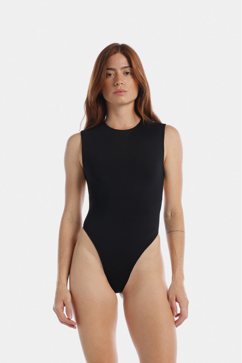 Body negro confeccionado en un jersey con elastano de 250 gramos. Posterior con abertura ovalada. Broches en entrepierna. Toda la prenda es doble.