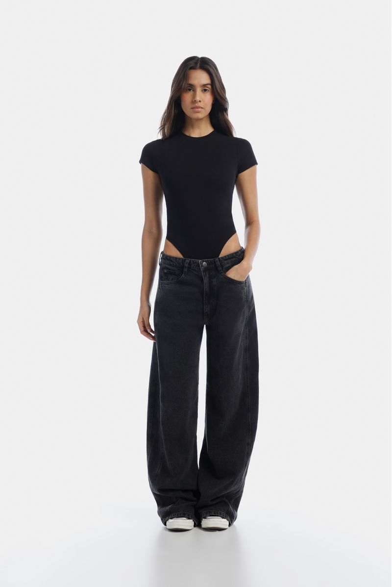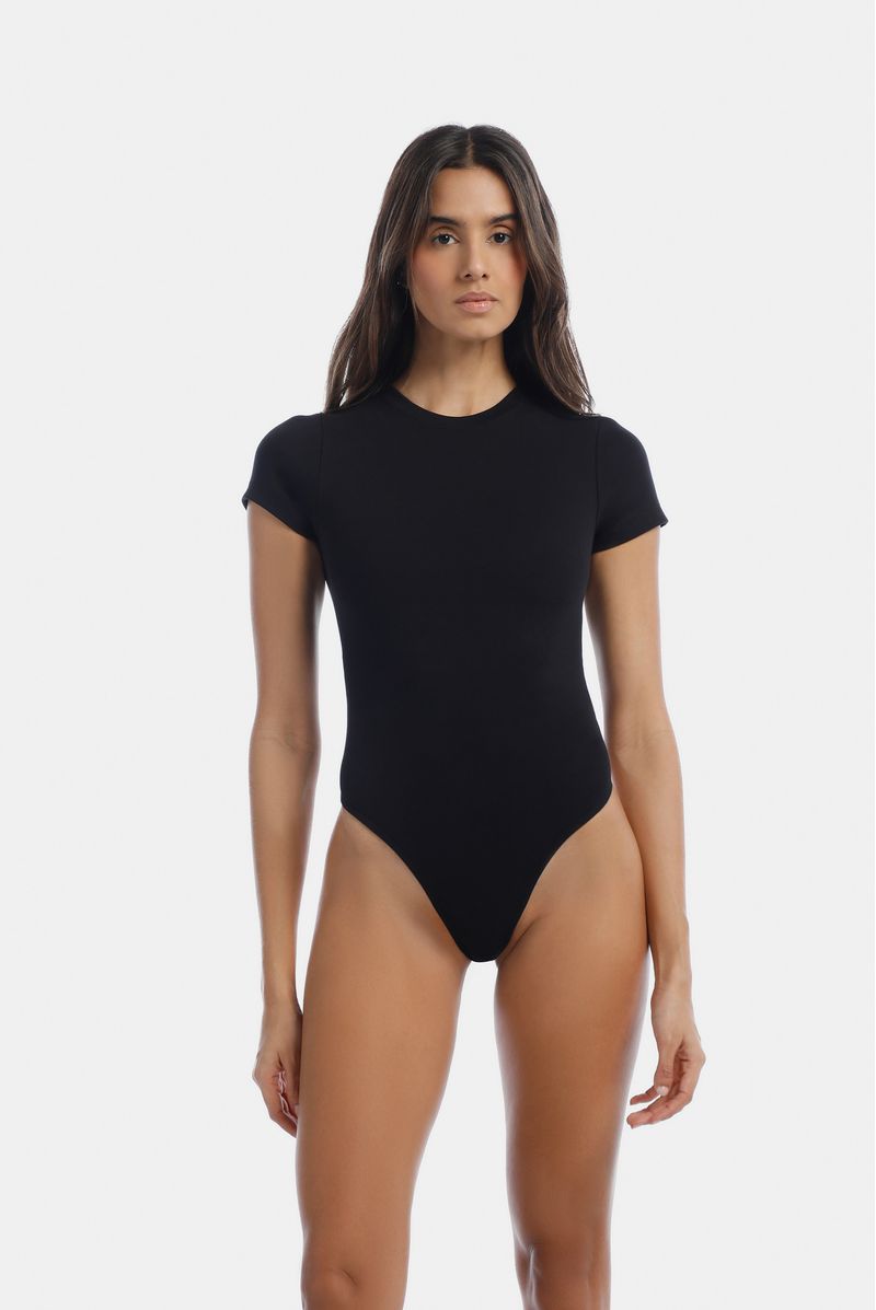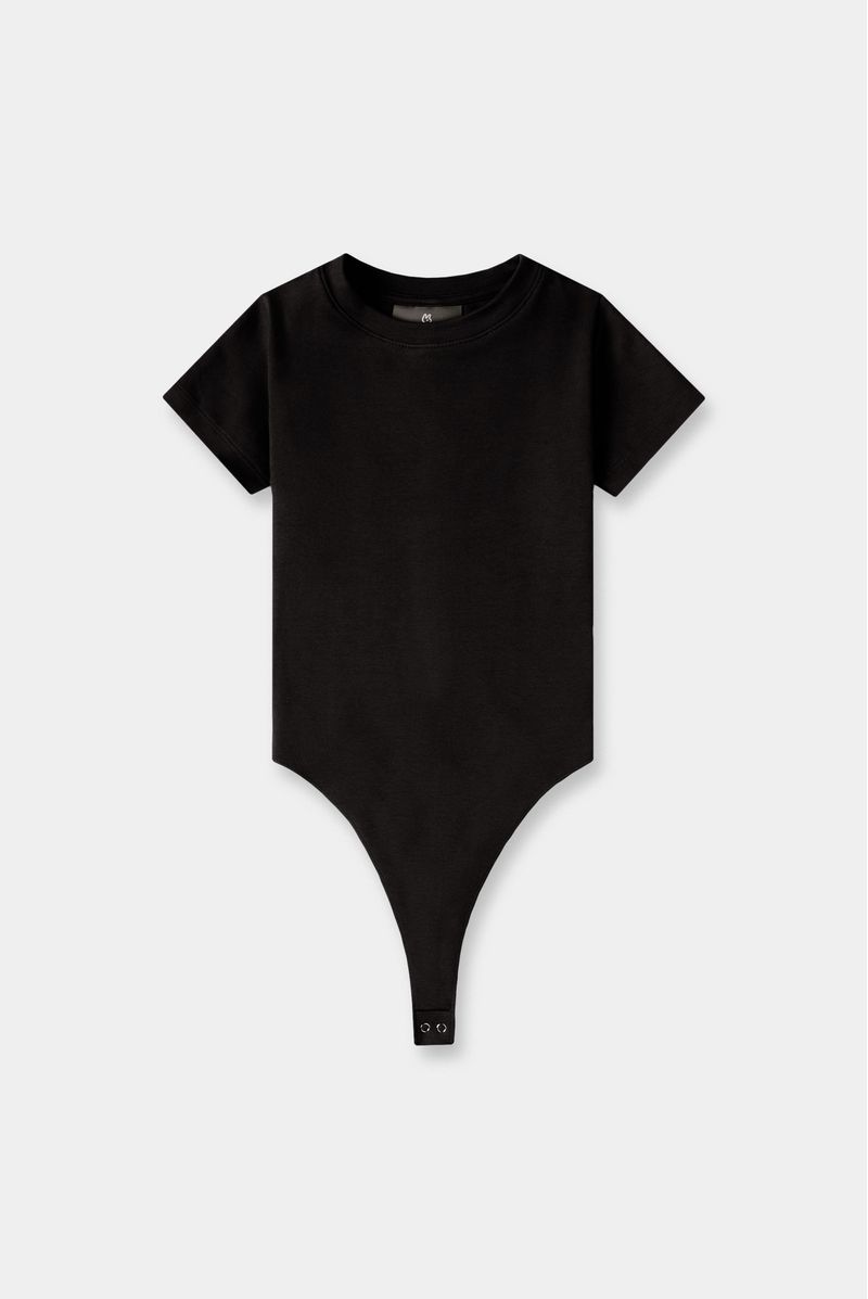 Body color negro, manga corta confeccionado en un interlock de 310 g. Tiene corte vertical en el centro posterior para mejorar el ajuste. Lleva elástico en el contorno de las piernas y broches en la entrepierna.