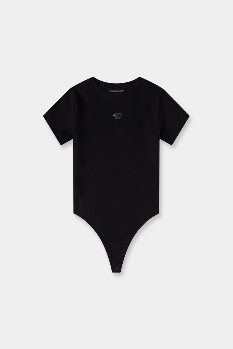 Body negro manga corta confeccionado en un rib de 280 gramos. Aplique de oso bordado color negro en centro delantero y en posterior lleva texto bordado color marfil. Broches en entrepierna.