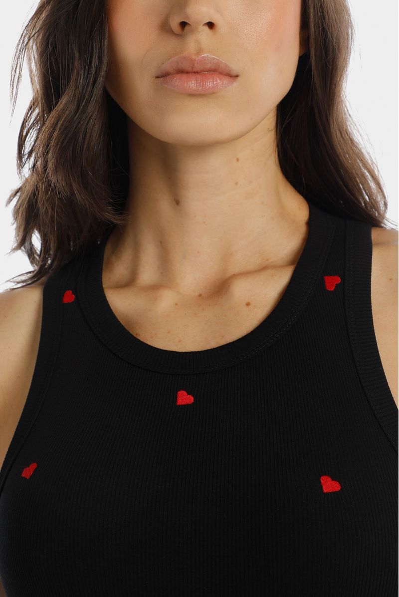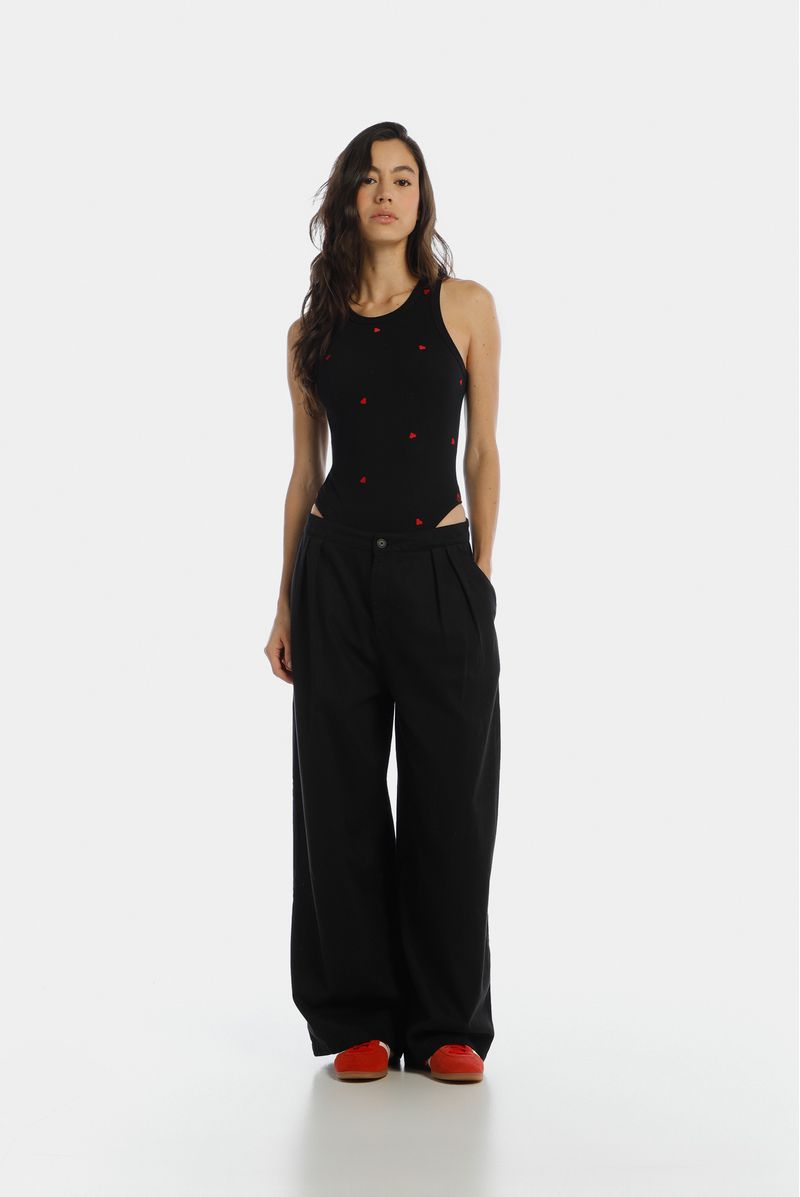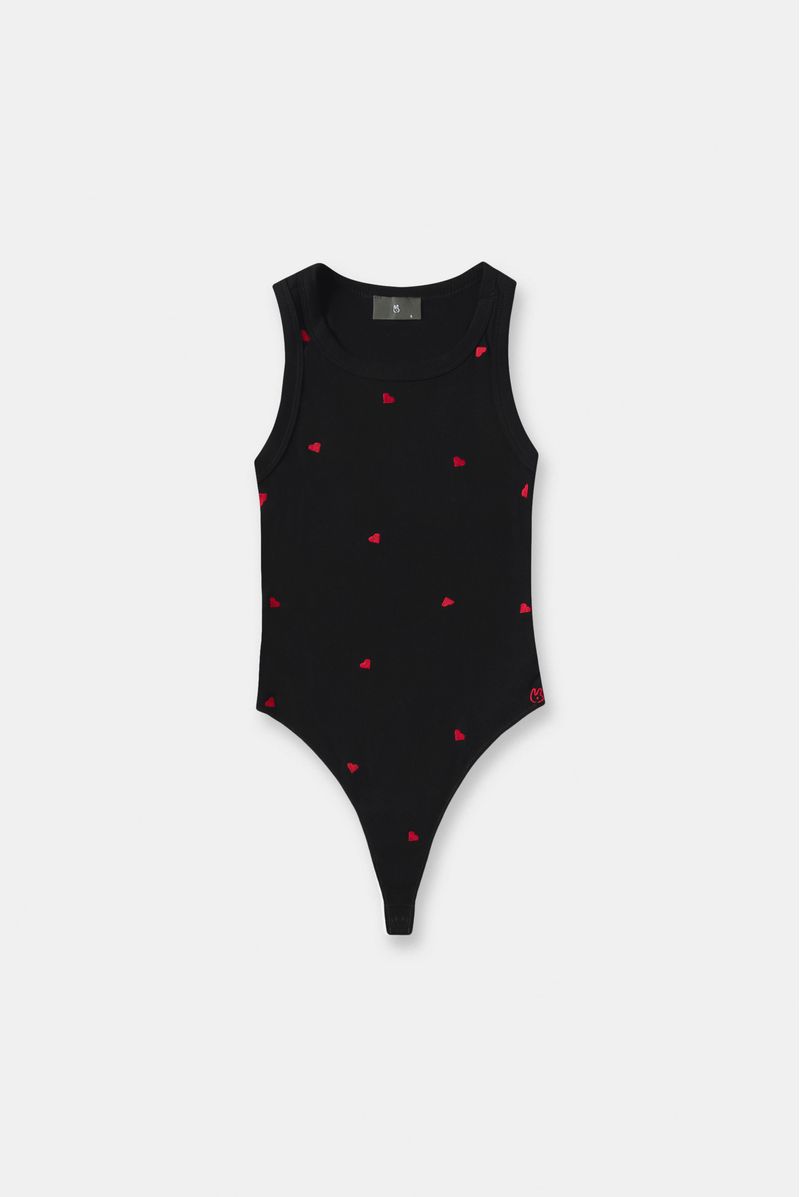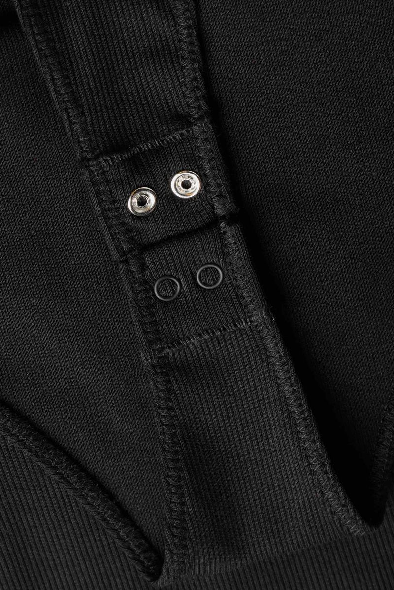 Body negro, confeccionado en un Rib 2x2 con elastano de 280gr. Delantero y posterior son sencillos con broches en la entrepierna. Lleva bordado tono a tono en el centro delantero y sisas terminadas con sesgo abrazado.