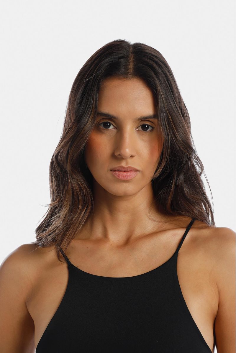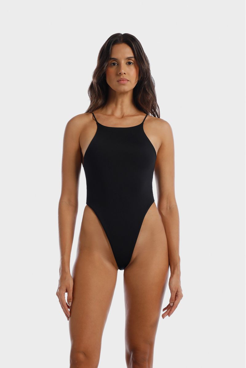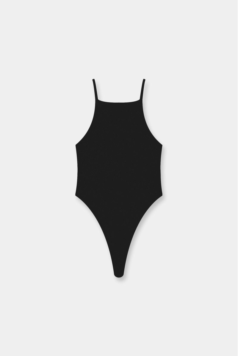 Body negro confeccionado en un jersey con elastano de 250 gramos. Silueta tipo halter, broches en entrepierna. La cintura es más alta que otras siluetas de Body.