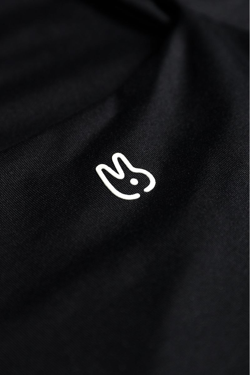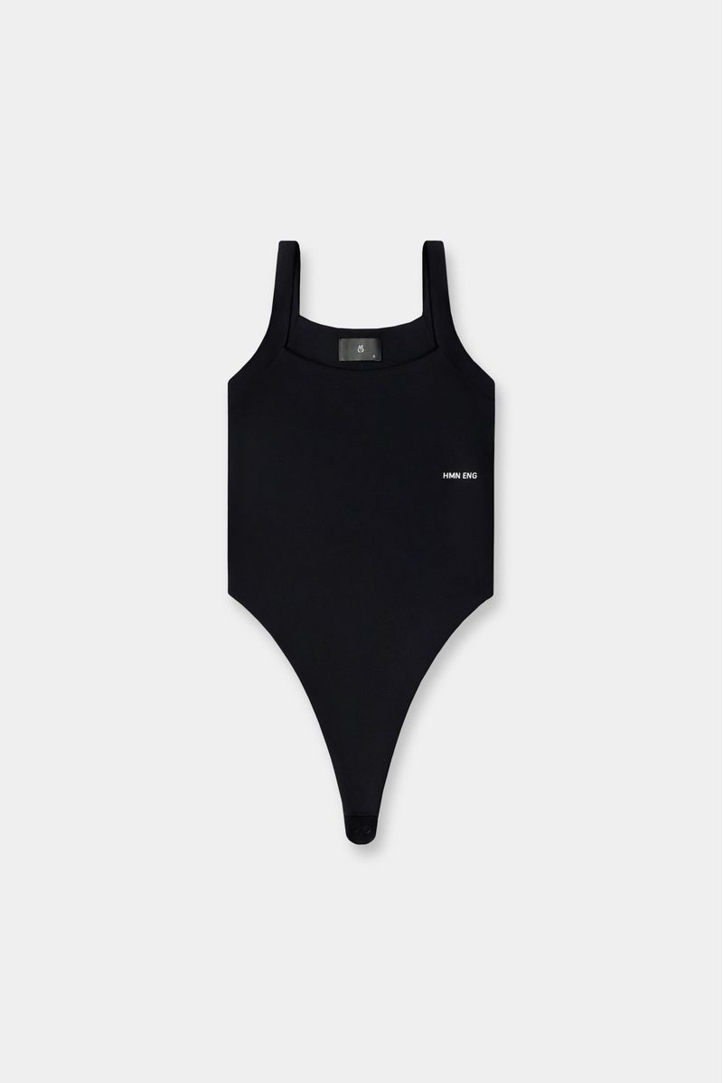 Body negro con tiras de 3cm de ancho confeccionado en un jersey con elastano de 250 gramos. Texto estampado en el costado izquierdo al nivel de las costillas en color blanco. Toda la prenda es doble y lleva broches en la entrepierna.