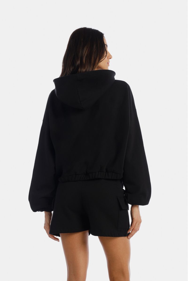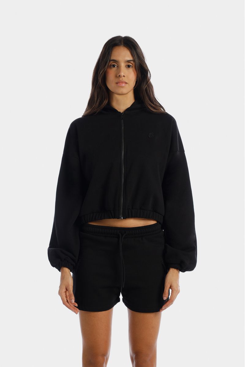 Buzo negro de cierre confeccionado en un french terry de alto gramaje de 400 gramos.