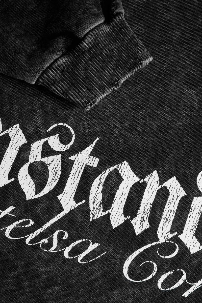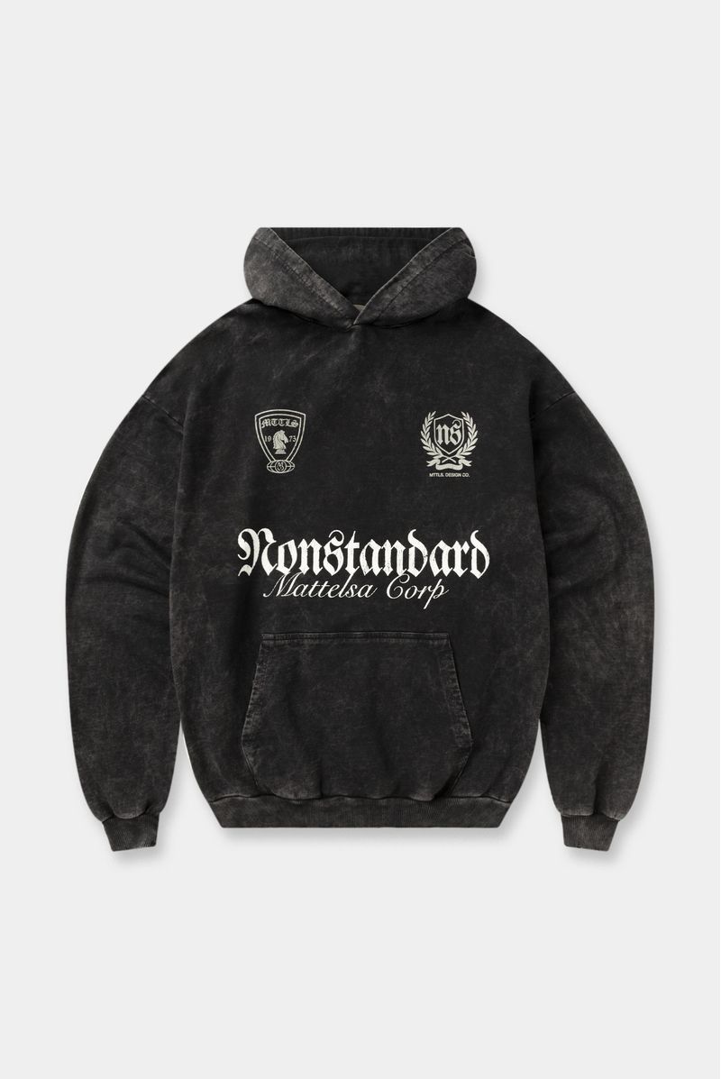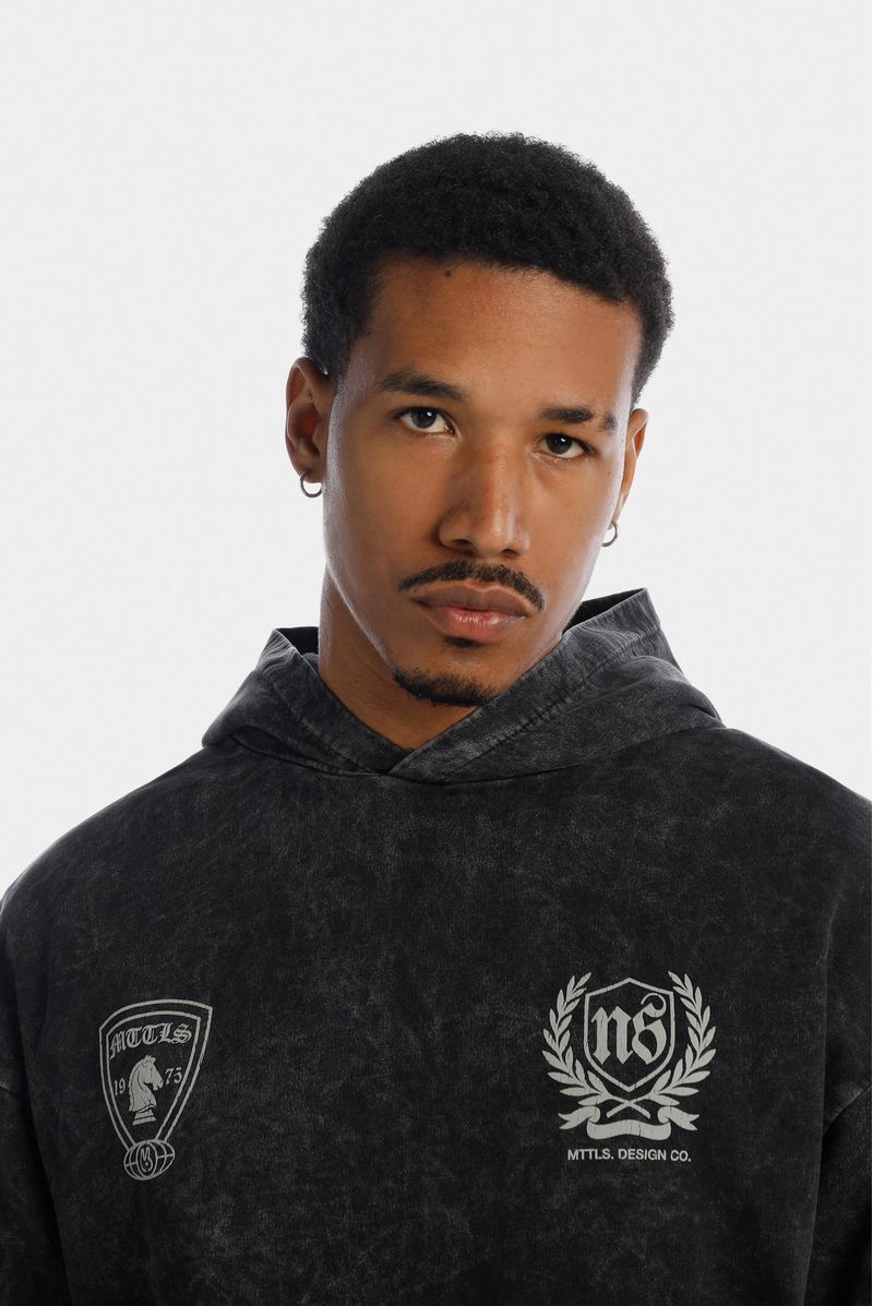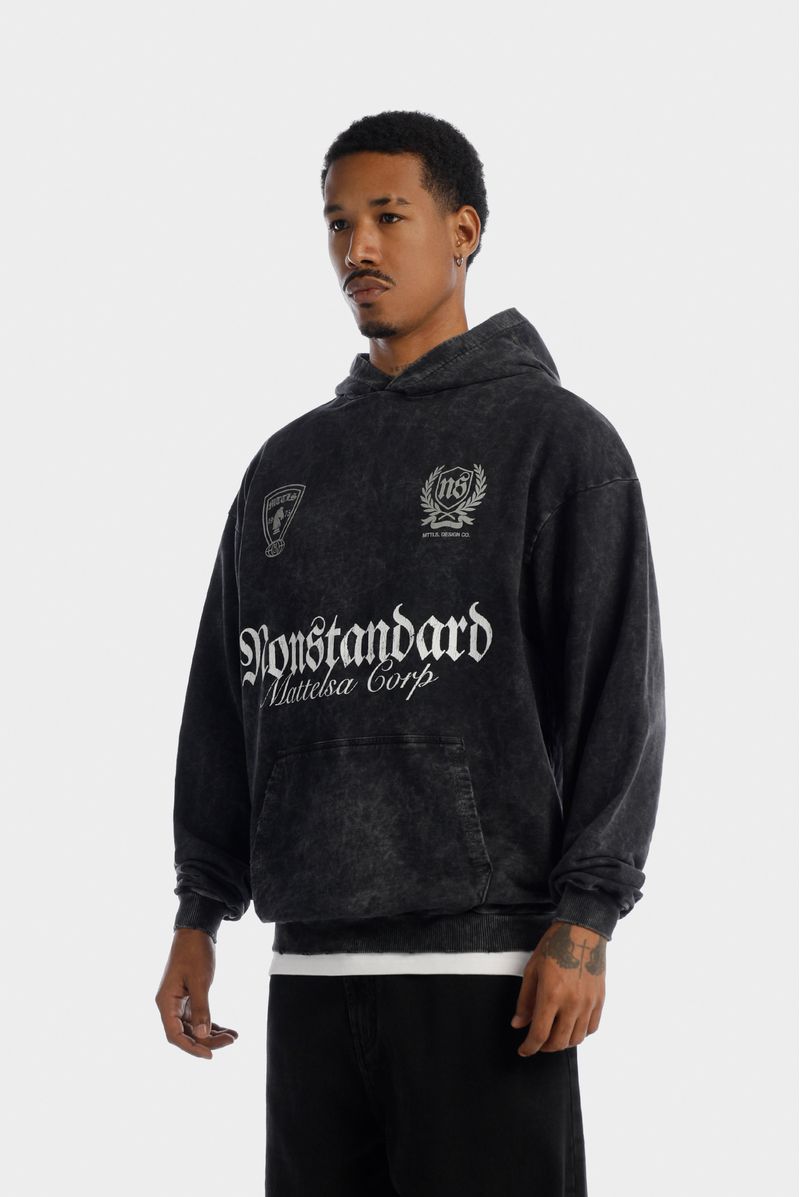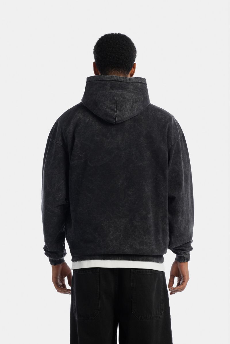 Buzo Oversize confeccionado en una Burda Premium de alto gramaje de 305gr de peso. Con estampación en frente en plastisol. Además lleva los ruedos y el bolsillo con acabado en motortul, lo cual le da una apariencia rustica y lavandería en color negro.