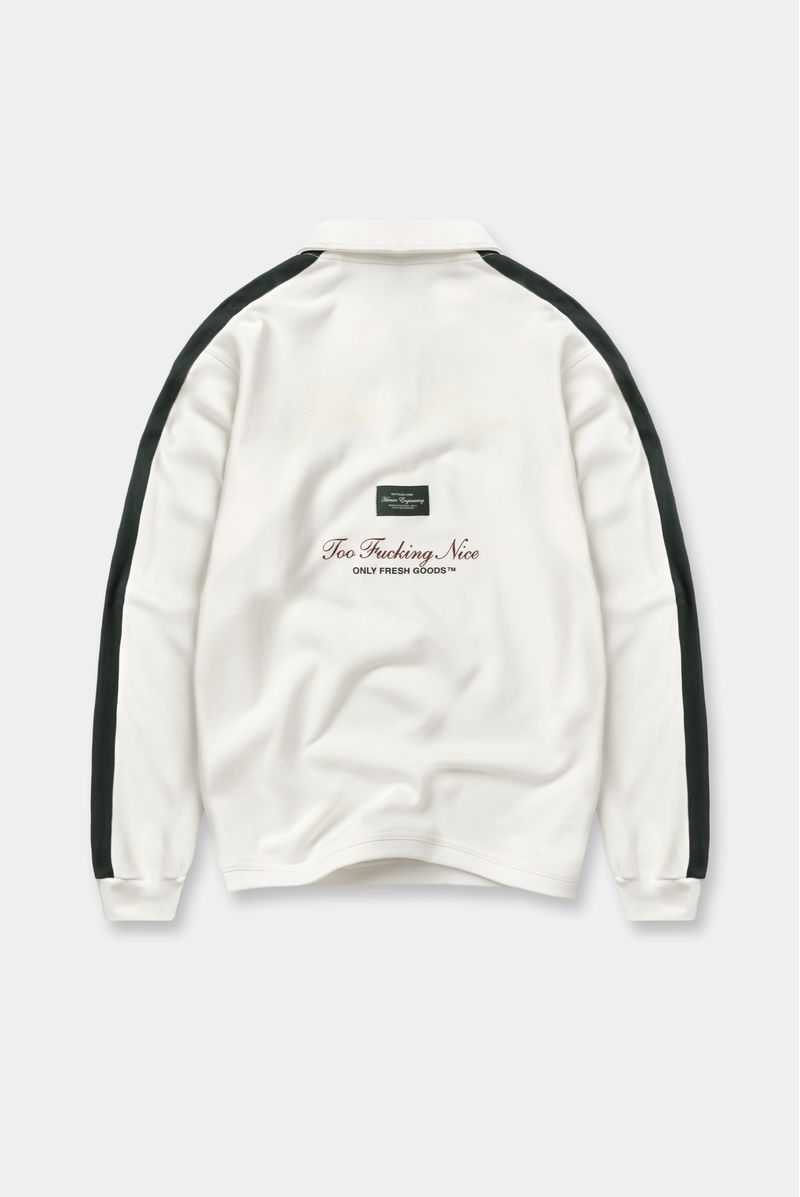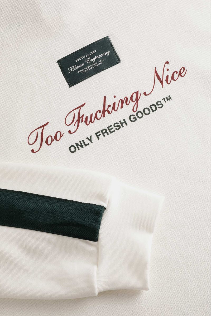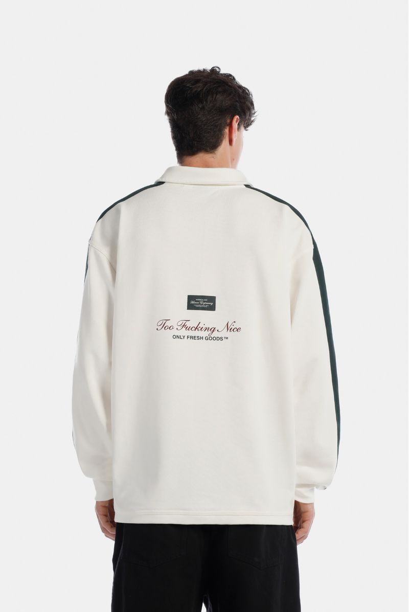 Buzo Oversize confeccionado en una Burda Premium de 370gr de peso. Con estampación en frente en plastisol, acompañado de un texto bordado, y en espalda en alta densidad. Lleva hiladilla color verde en hombro y manga y un banderín bordado en costados.