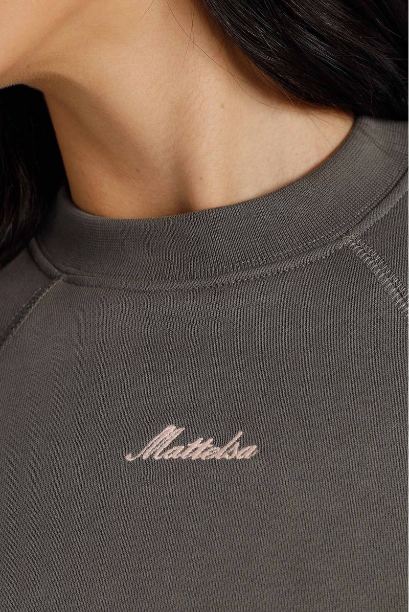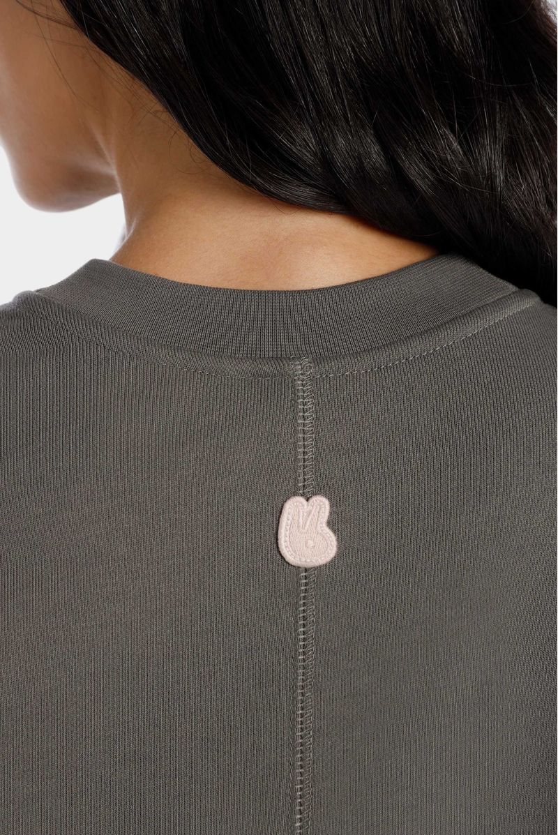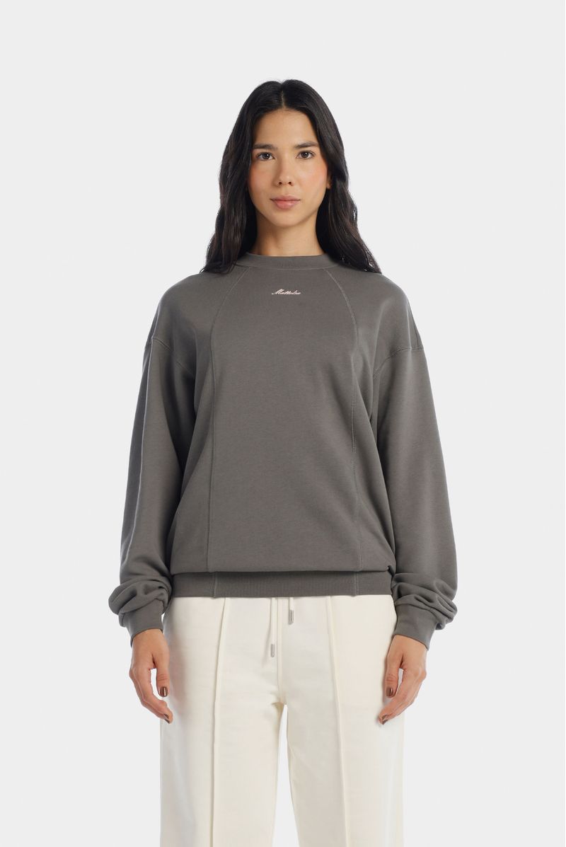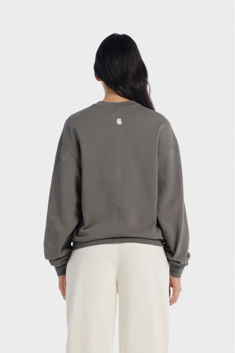 Buzo gris confeccionado en una burda Premium de alto gramaje de 300 gramos. El buzo está intervenido por cortes en el frente, mangas y espalda. Además lleva un bordado en el frente de color rosado y en el posterior un aplique bordado color rosado.