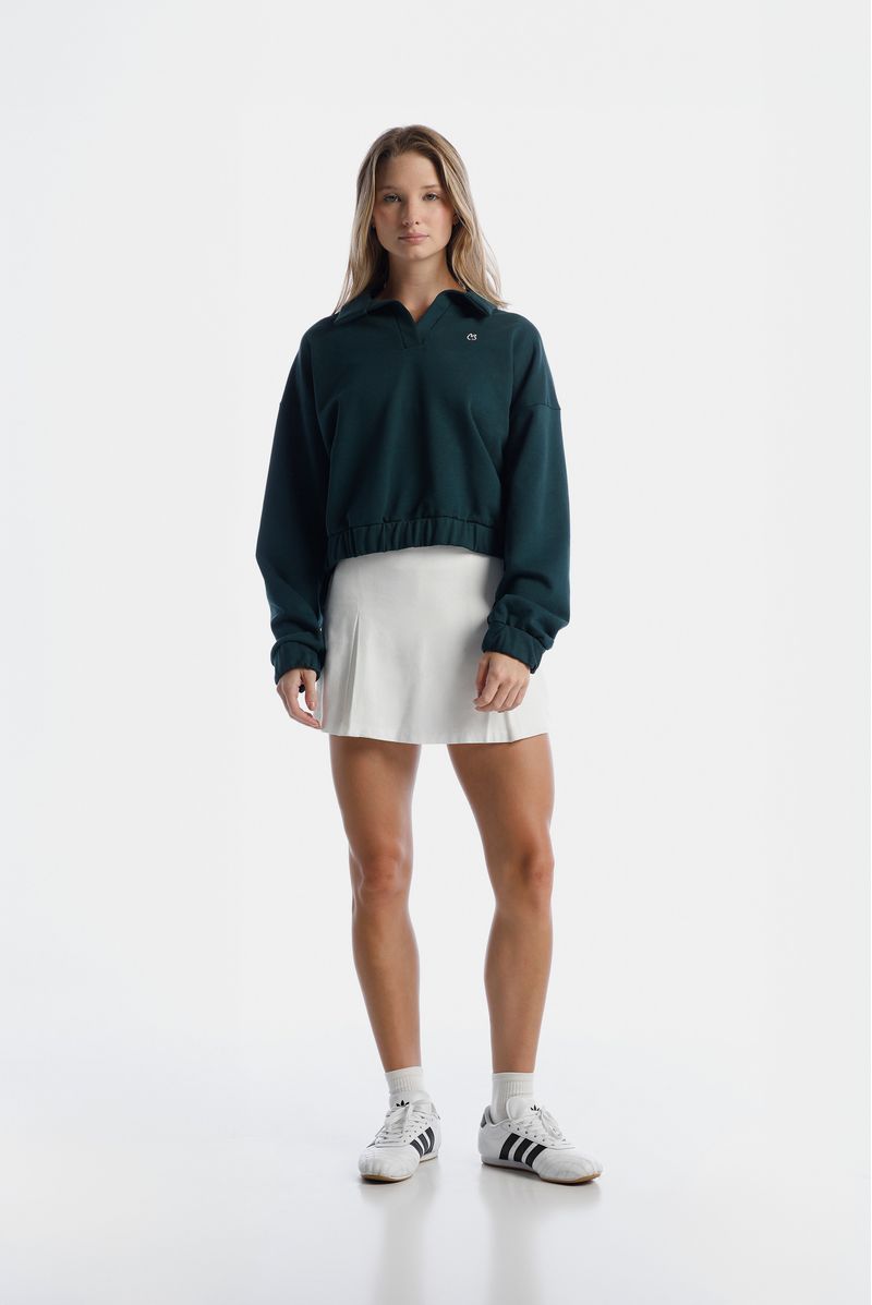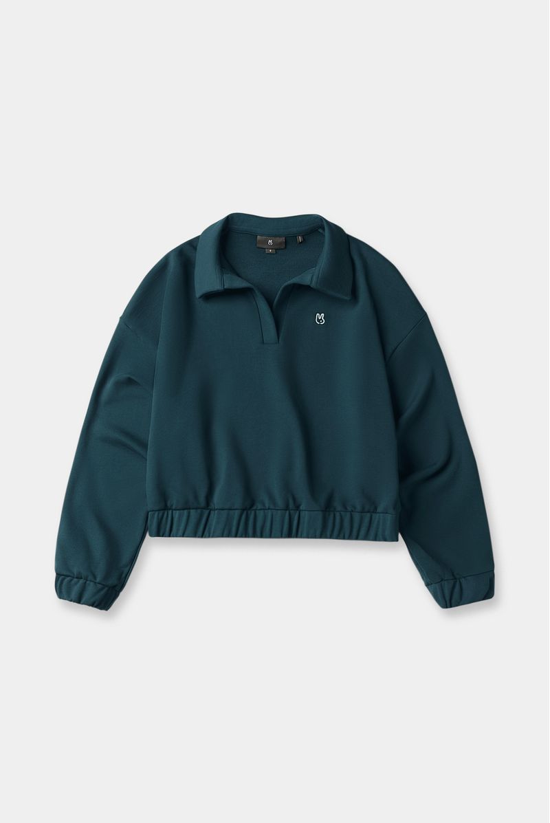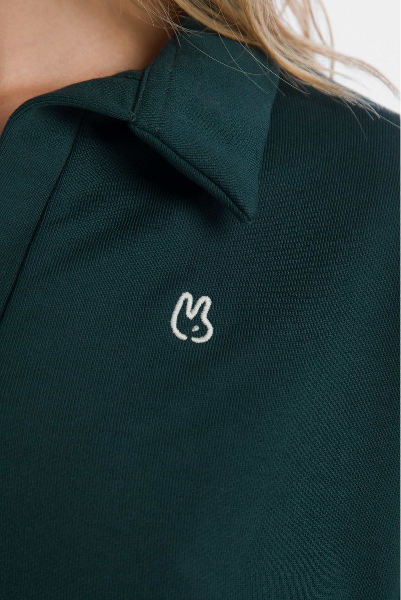 Buzo verde confeccionado en un french terry de alto gramaje de 400 gramos. Conejo bordado directo sobre el punto corazón delantero en color marfil. Cuello tipo polo con perilla en V sin botones. Puños y fajón ajustados con elástico interno.