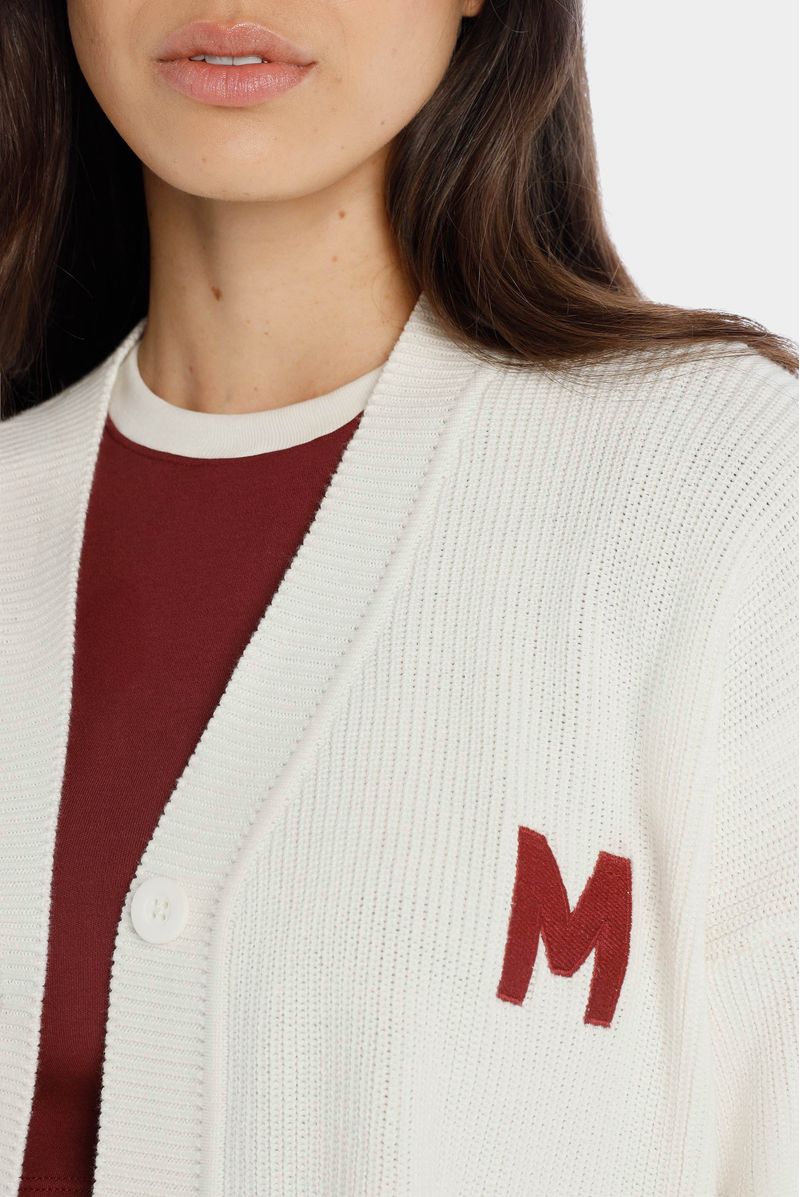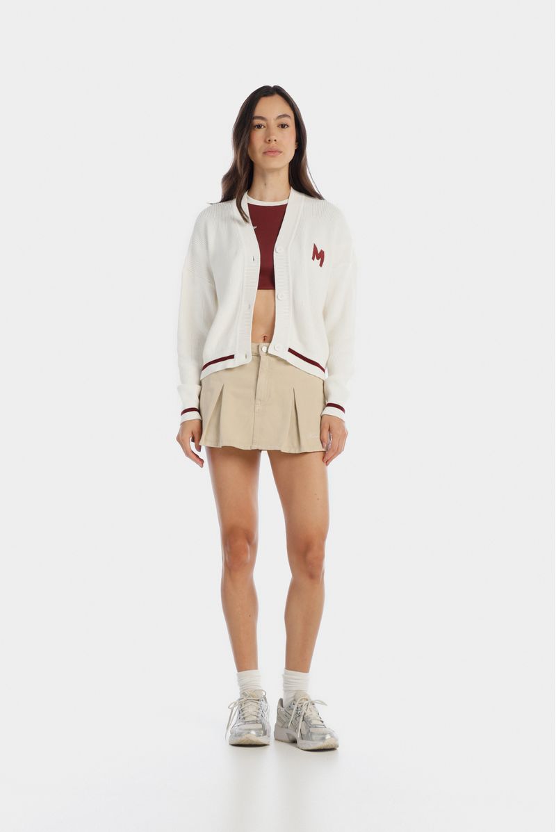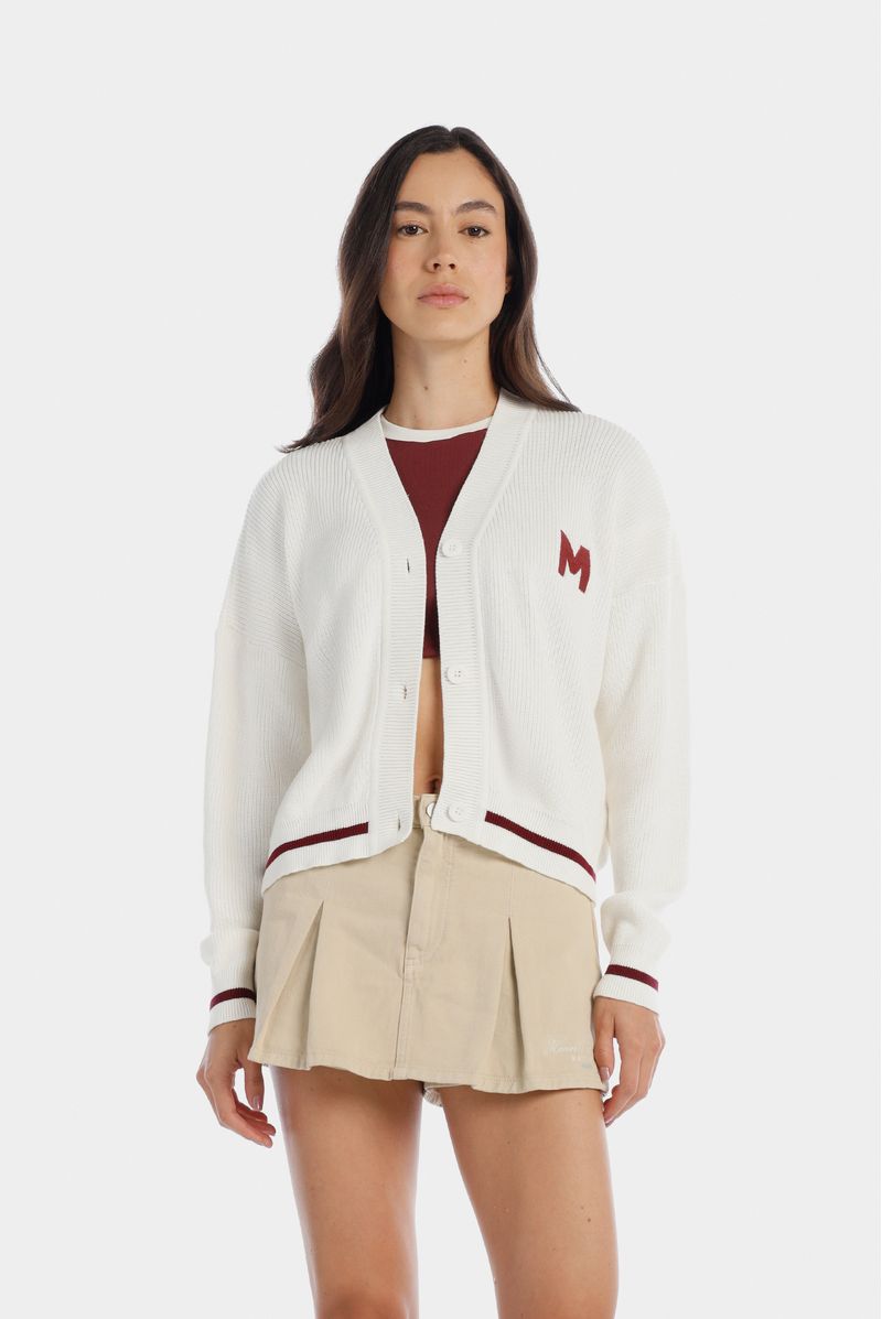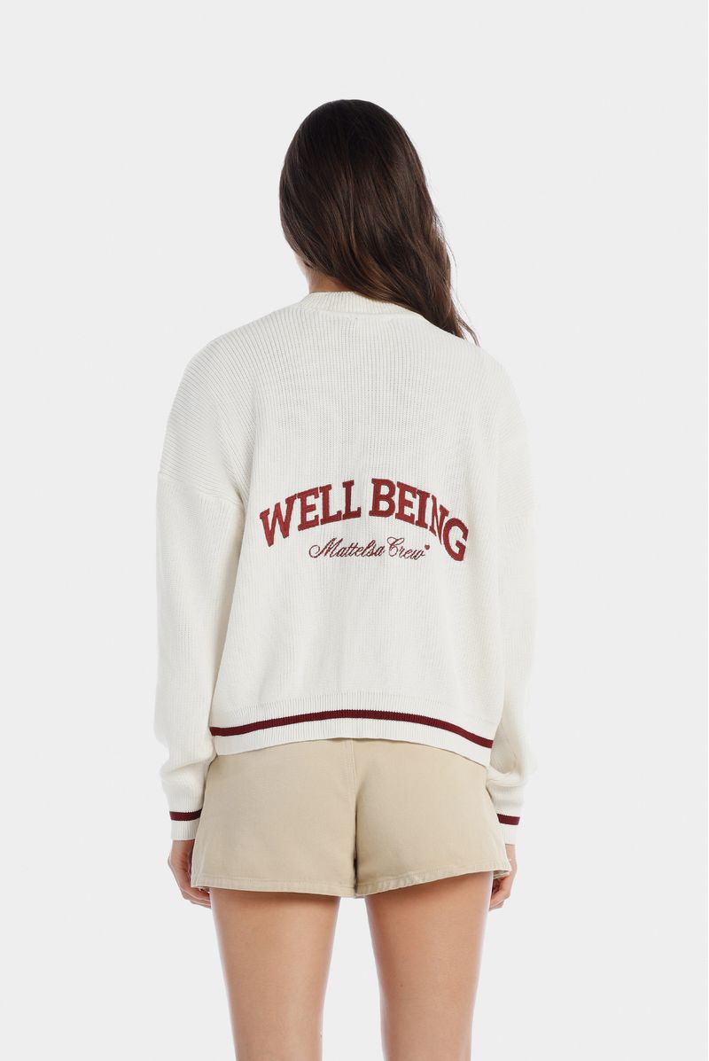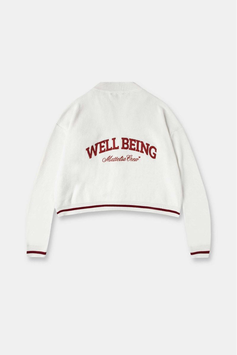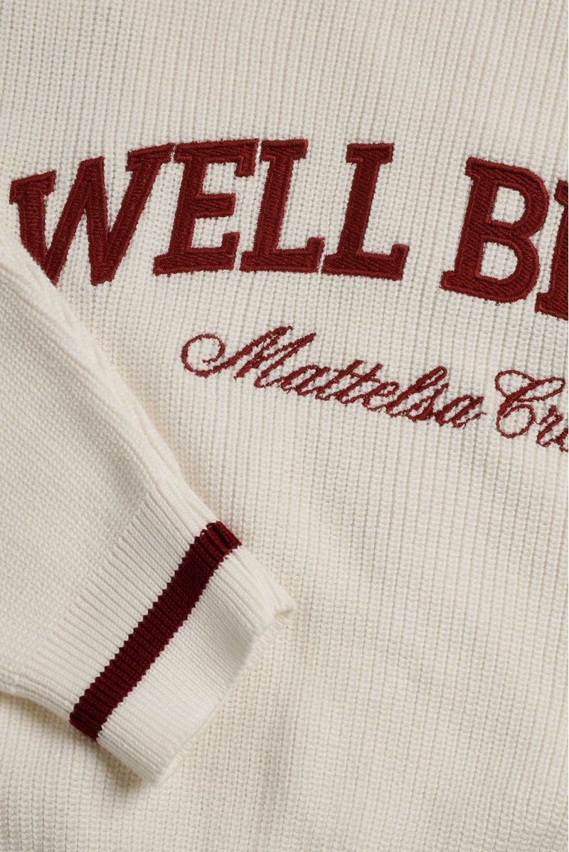 Buzo tejido color marfil de 550g. Presenta fit amplio y lleva líneas en contraste en color vino en puños y fajón. Incorpora texto bordado en el punto corazón y en el centro posterior, en el mismo color.