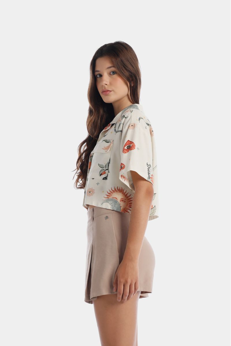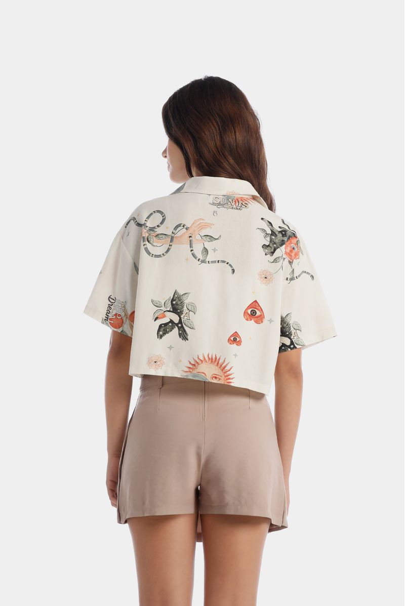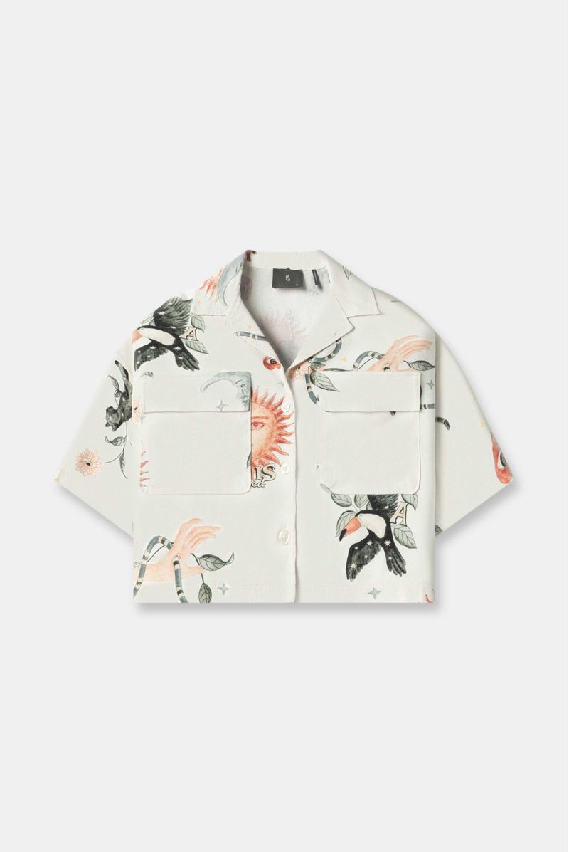Camisa marfil confeccionada en un tejido plano de 185 gramos. La tela es intervenida en estampación continua con una estética esotérica. Cuello tipo resort, bolsillos en el delantero.