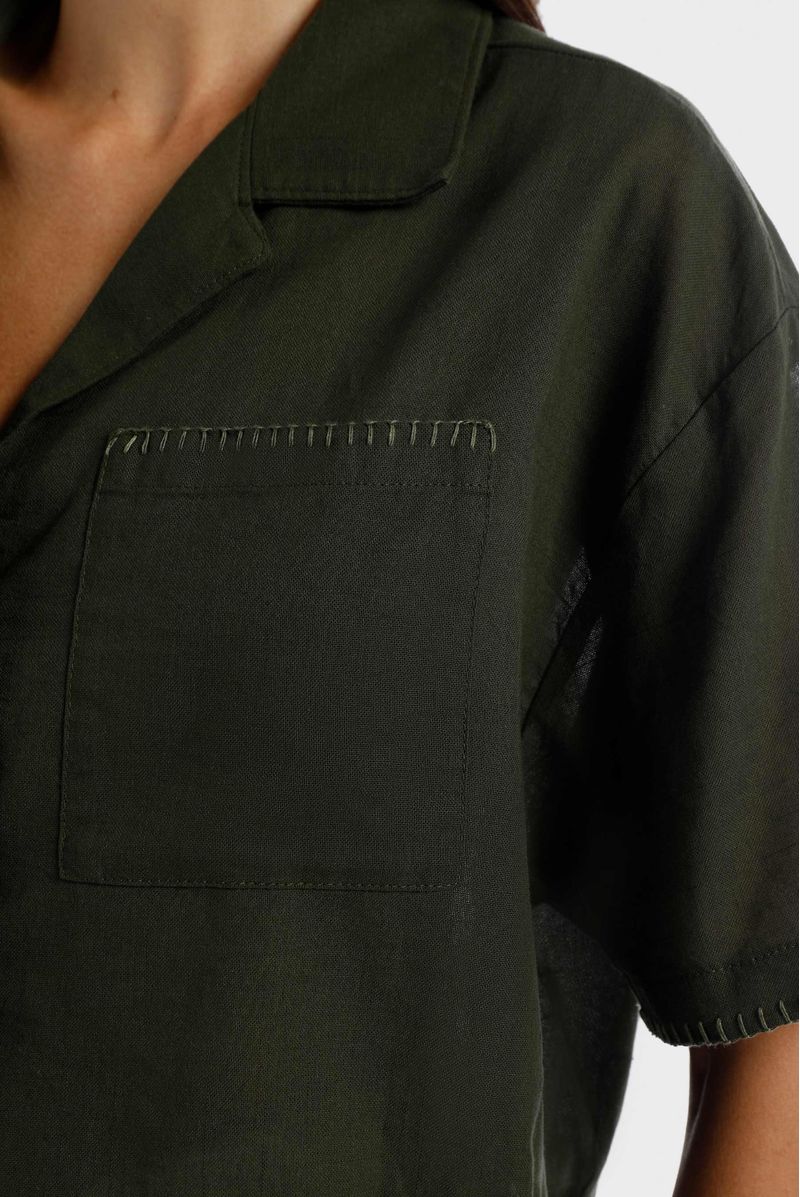 Camisa verde confeccionada en un tejido plano liviano de 105 gramos. Cuello tipo resort, con terminaciones de ruedos en puntada decorativa tipo crocheta.