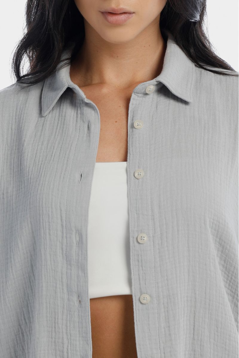 Camisa manga larga gris confeccionada en un tejido plano de 138 gramos. Lleva botones en frente y en puños de las mangas.