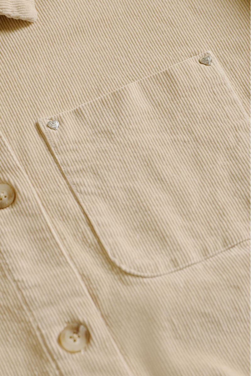 Sobrecamisa Beige confeccionada en un corduroy de 11,2 onzas. Tiene bolsillo en el delantero izquierdo con remaches metálicos contramarcados en esquinas. Lleva botones en delantero y puños.