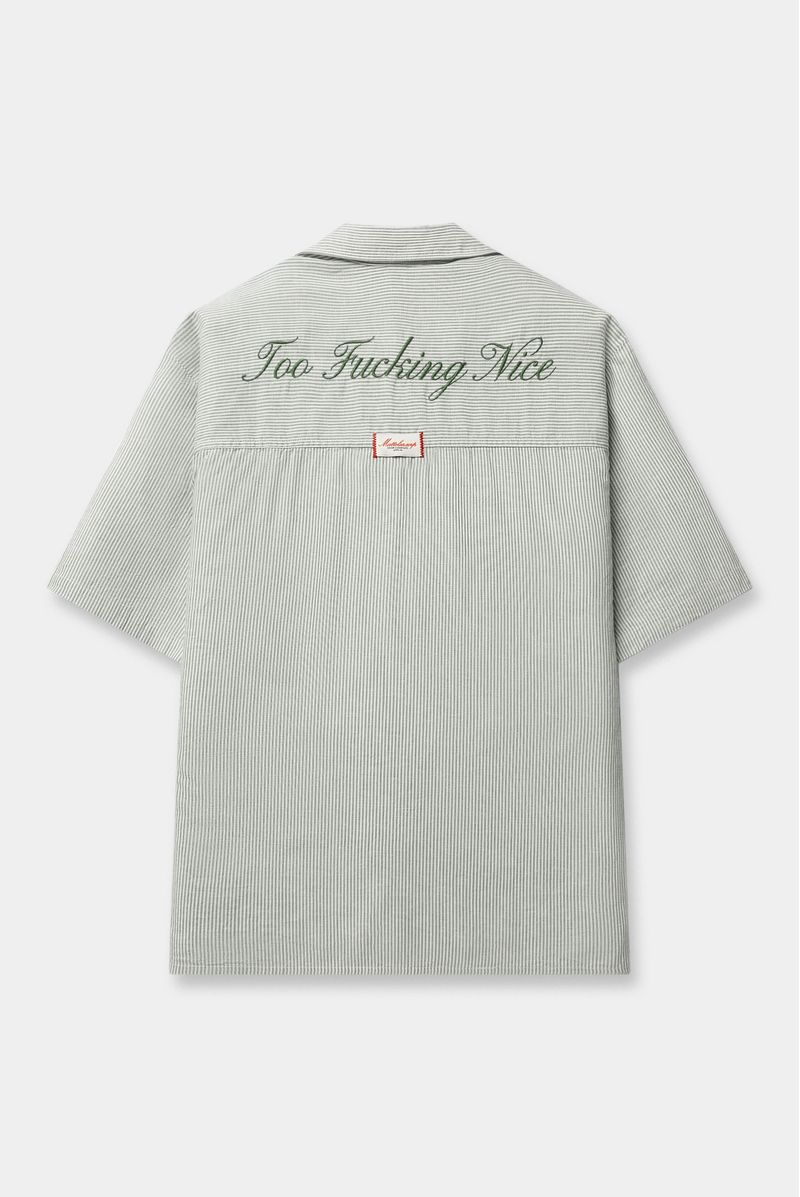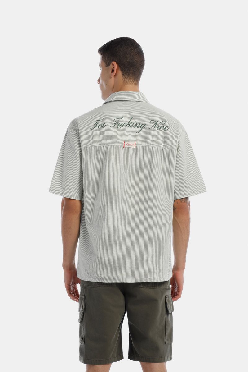 Camisa confeccionada en un Lino Premium de gramaje medio de 150gr de peso. Con bordado en frente y espalda. Lleva un corte tipo almilla en espalda y un banderín bordado en costados en zigzag en hilo en contraste color rojo.