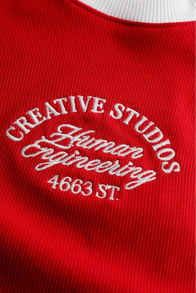 Camiseta roja confeccionada en un rib 1x1 de 280 gramos. Texto en arco bordado directo sobre centro pecho en color marfil. Cuello en rib marfil.