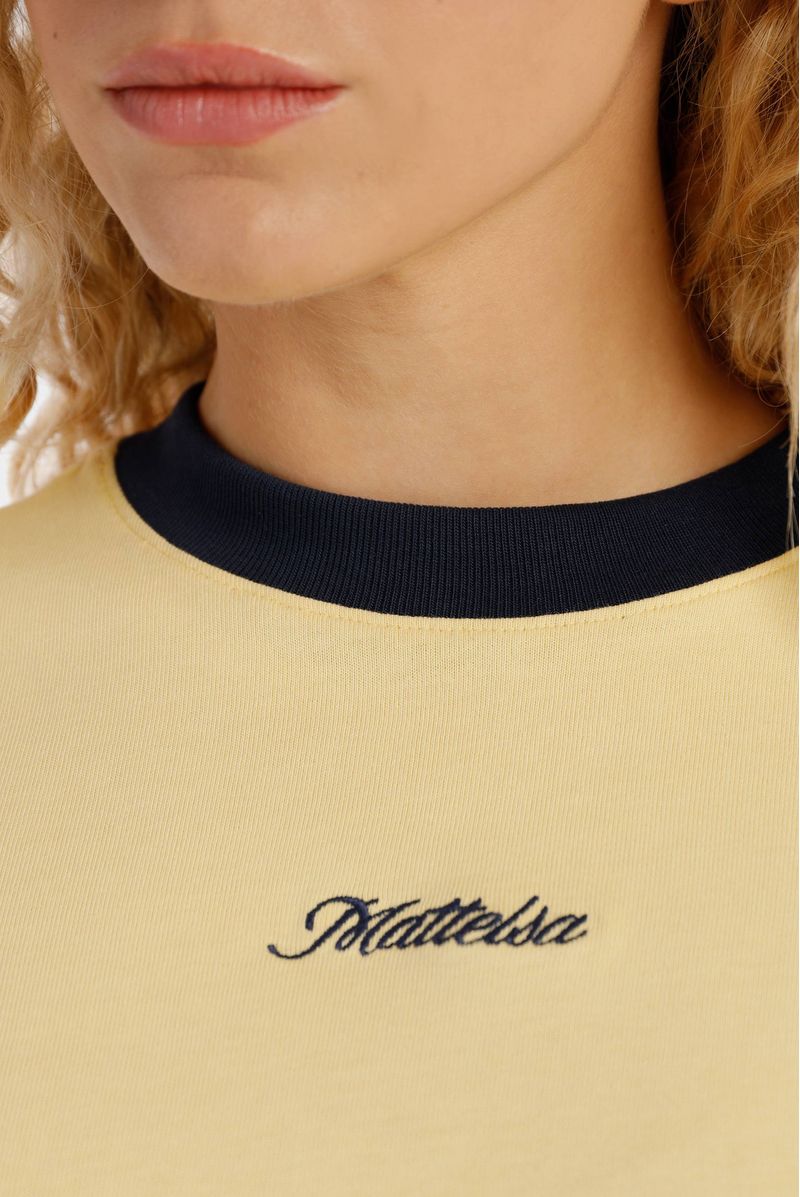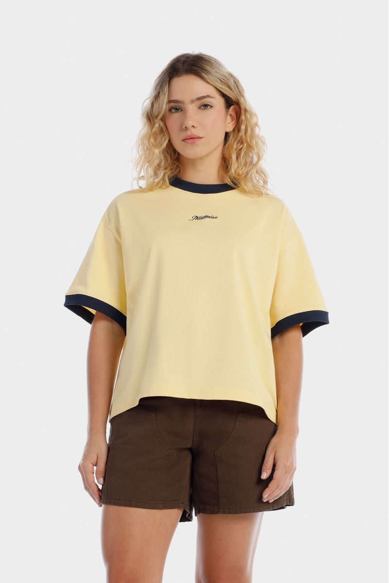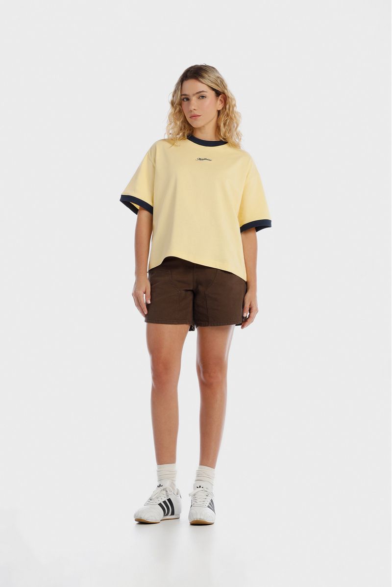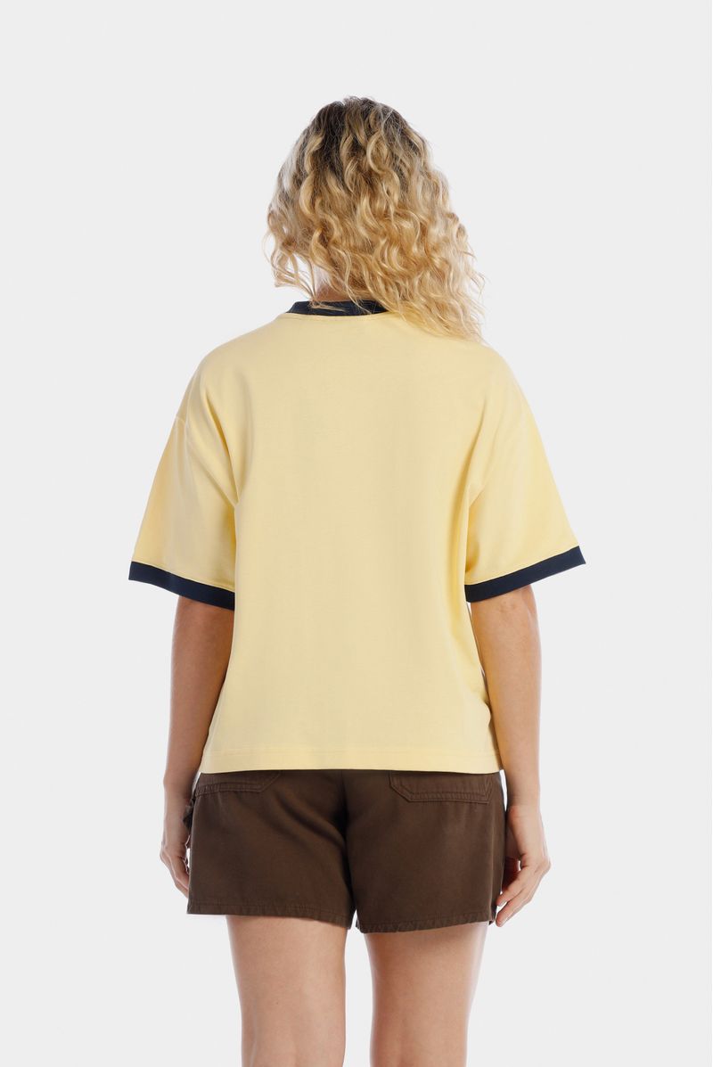 Camiseta amarilla confeccionada en un jersey de 250 gramos. Lleva una ilustración en el centro pecho en el frente. Cuello y puños en rib color azul oscuro. Largo over.