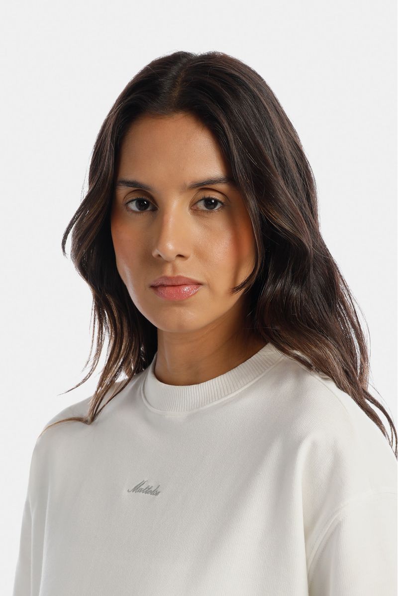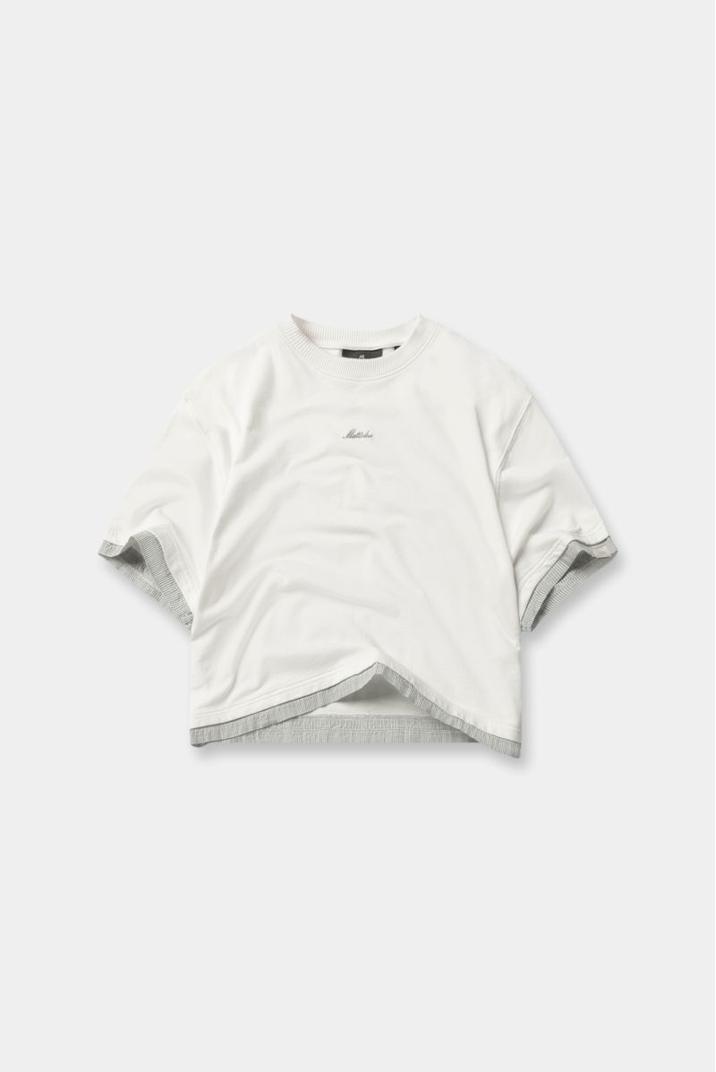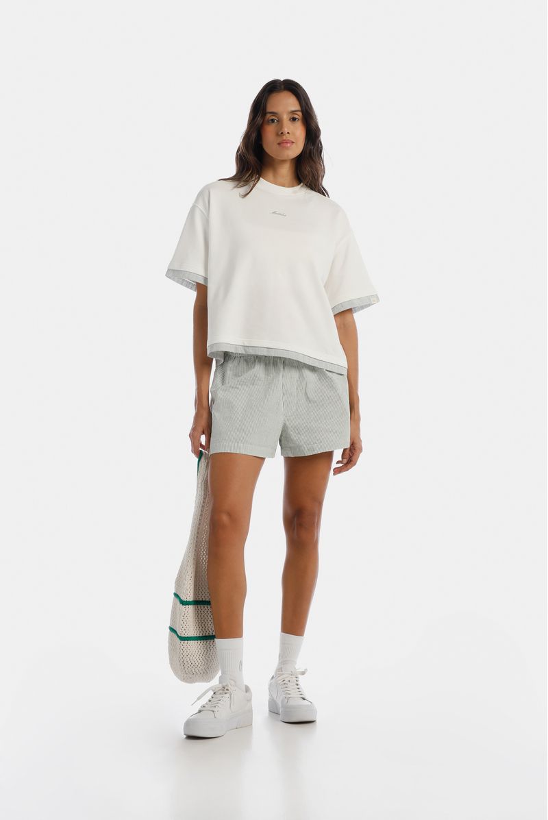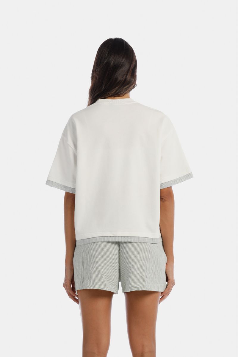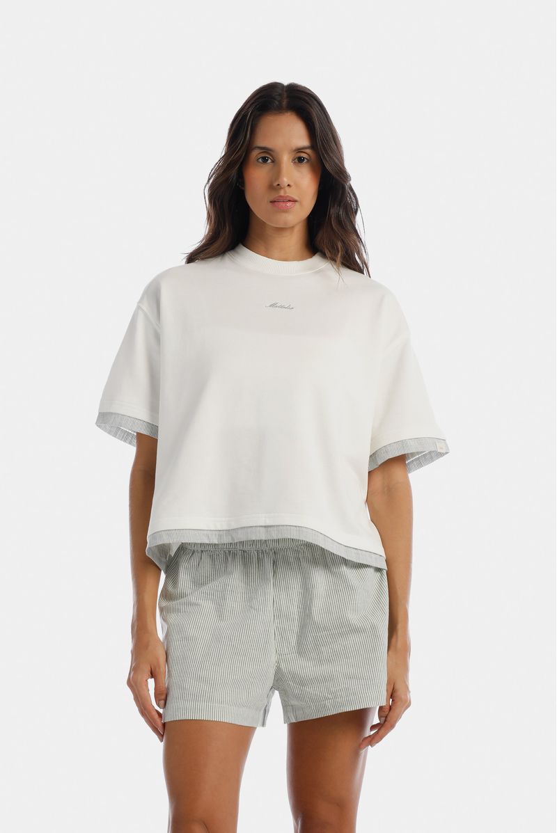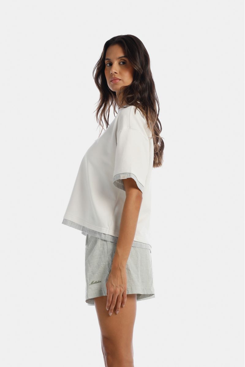 Camiseta manga corta marfil confeccionada en un french terry liviano de 240 gramos. La camiseta tiene doble ruedos con falsos en un tejido plano de rayas grises con marfil. Texto Mattelsa bordado en centro pecho en color gris.
