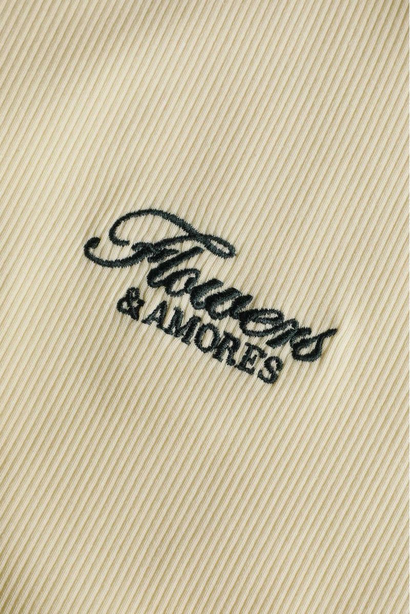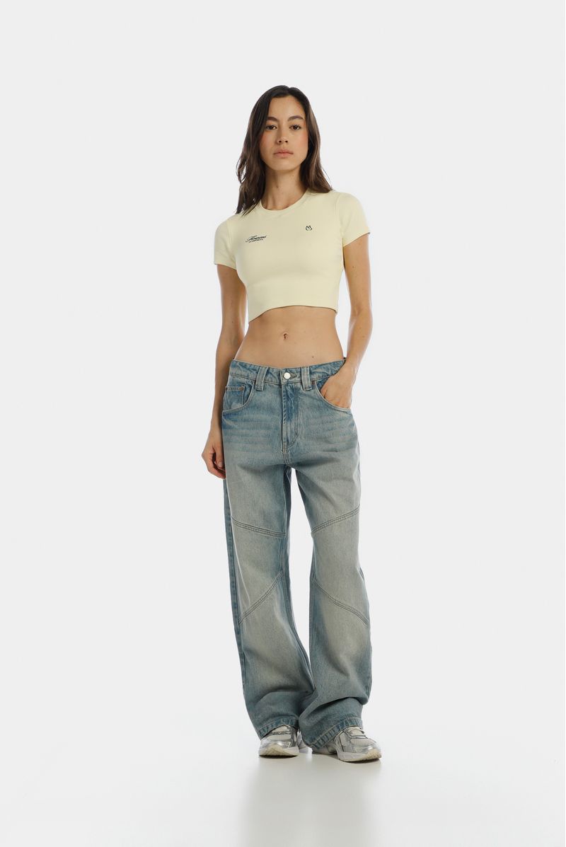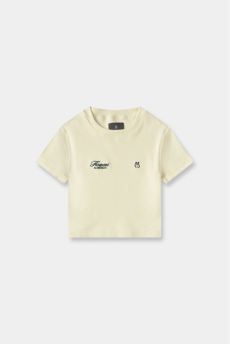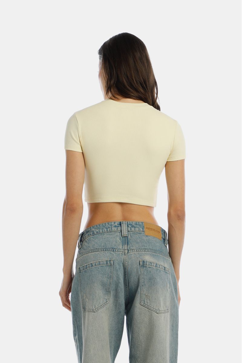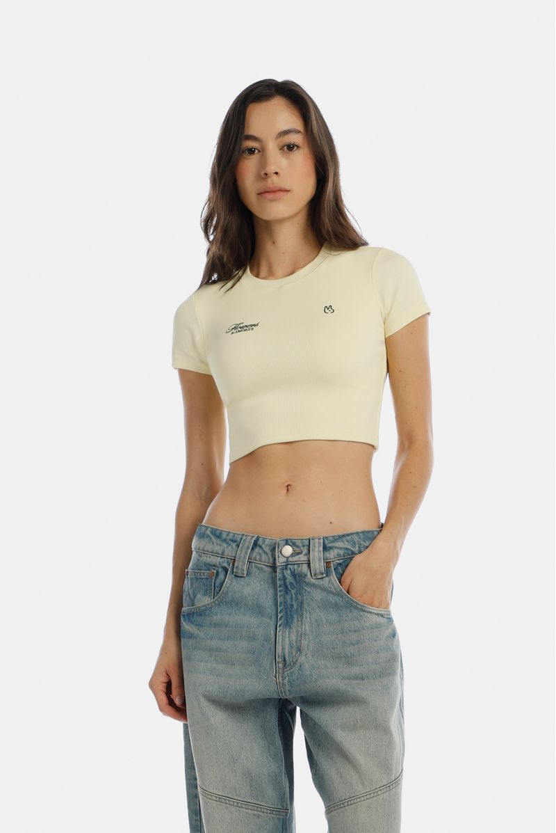 Camiseta crop amarillo pastel, confeccionada en un Rib 2x2 con elastano de 270gr. Toda la prenda es doble y lleva bordado en delantero.
