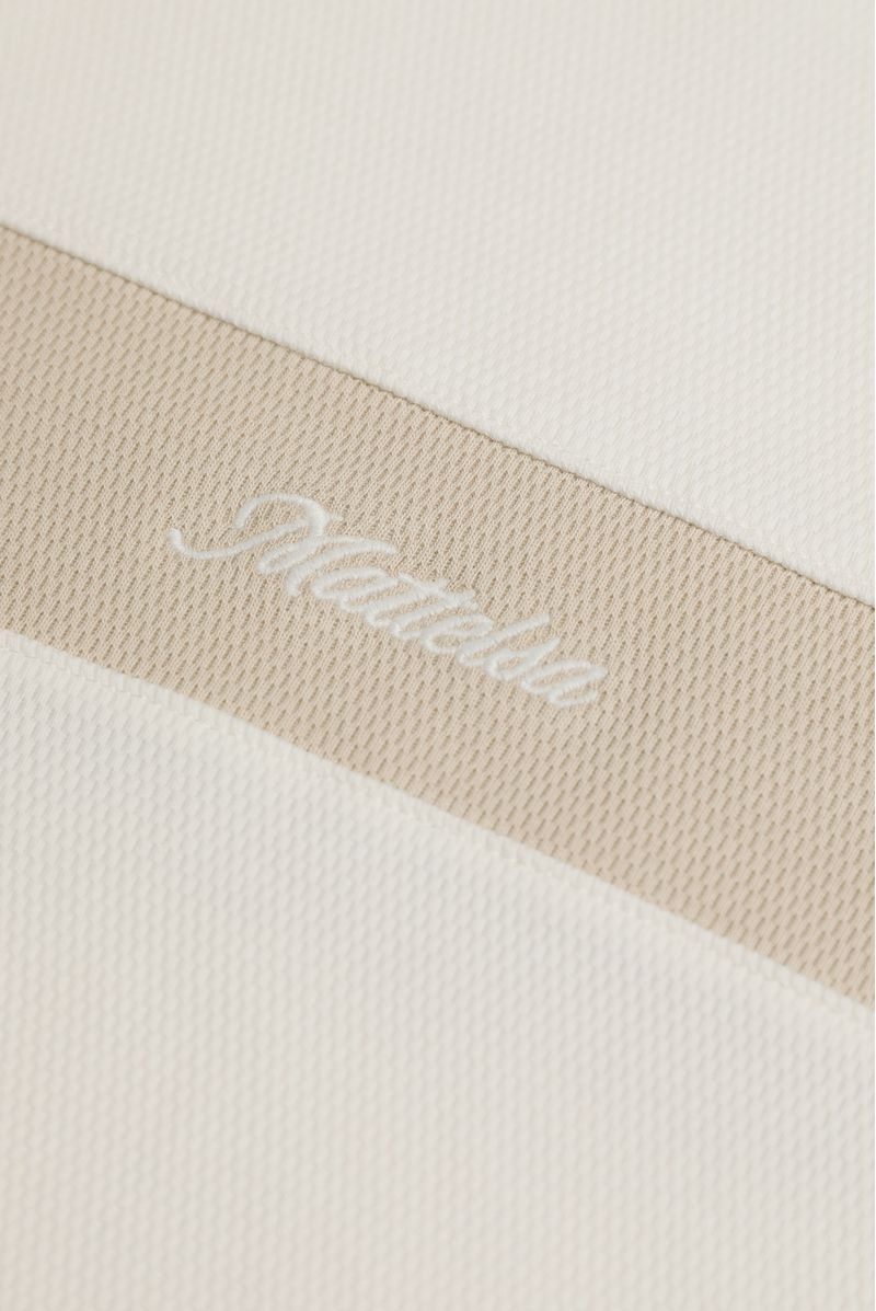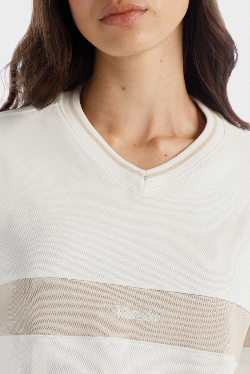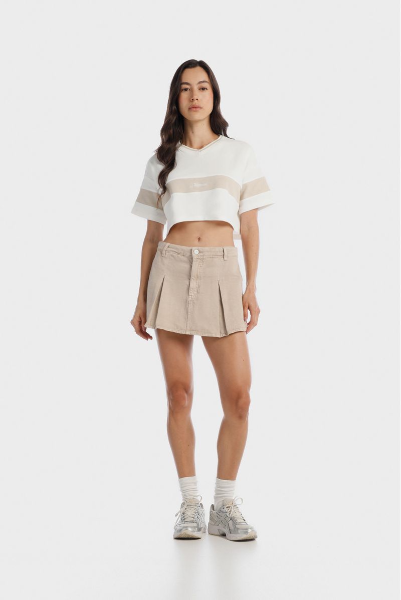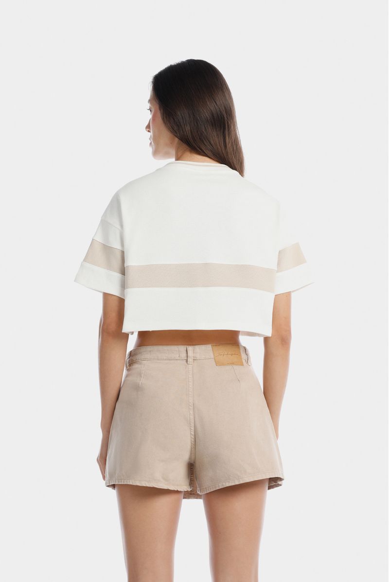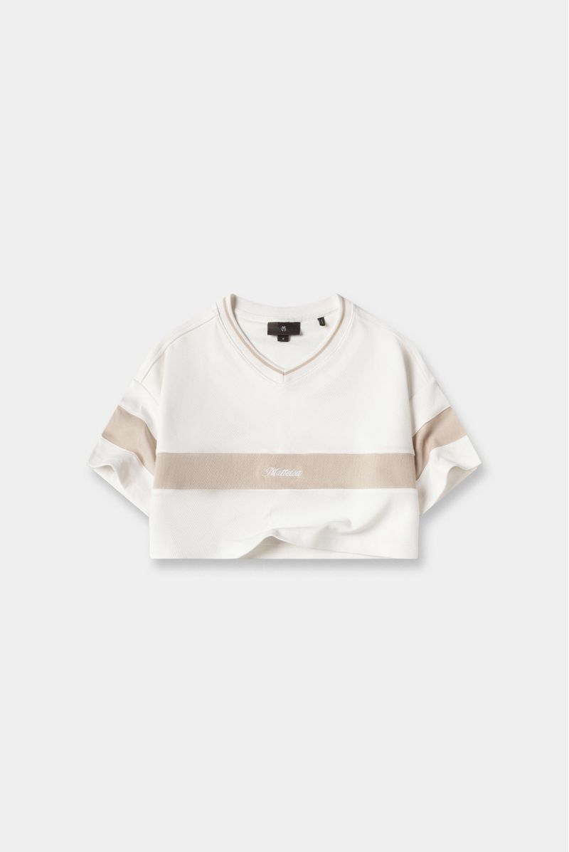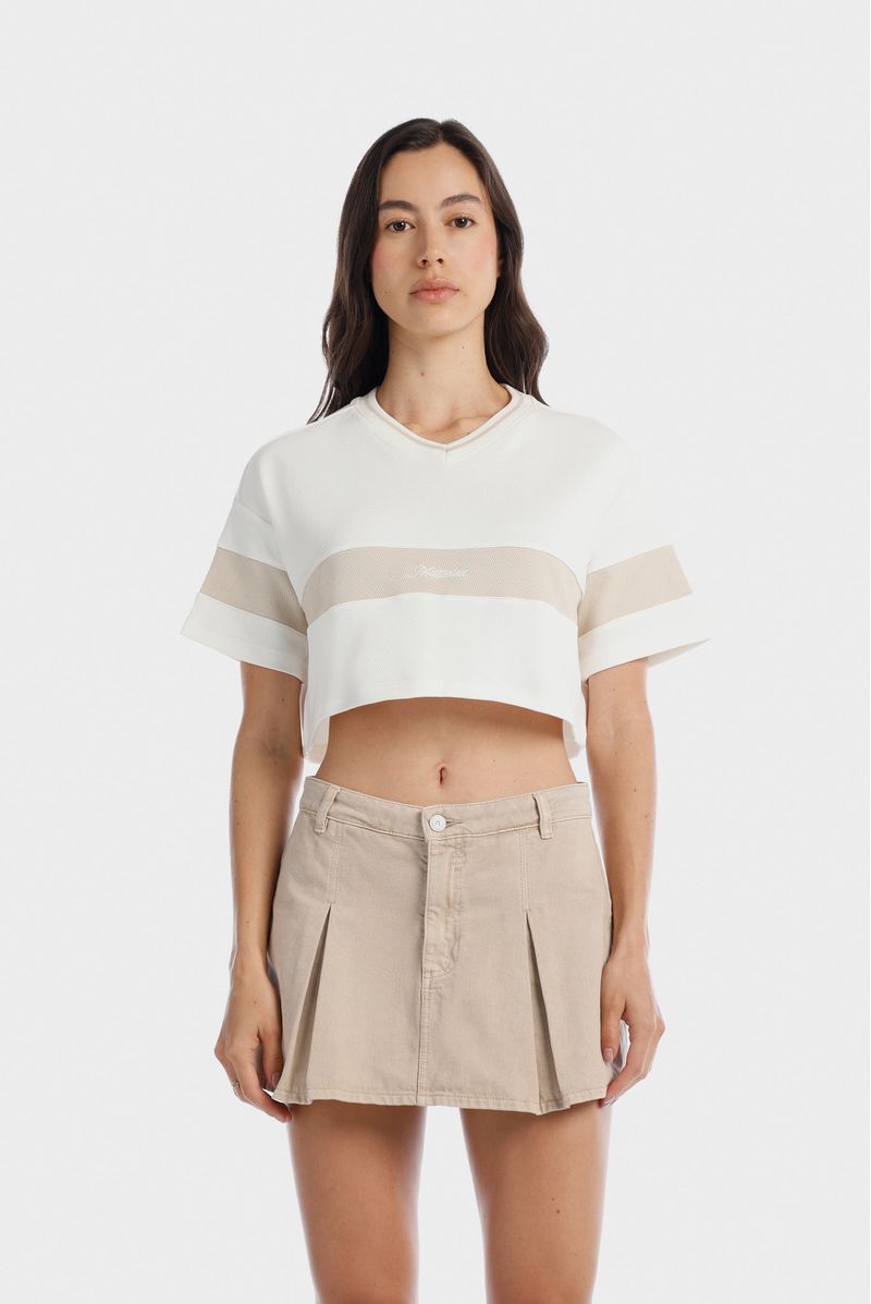 Camiseta crop marfil confeccionada en un jersey de 320gr. Lleva escote en V tejido con una raya beige. Adicional lleva un corte color beige en el centro de la camiseta y las mangas. En este corte va un texto bordado color marfil.