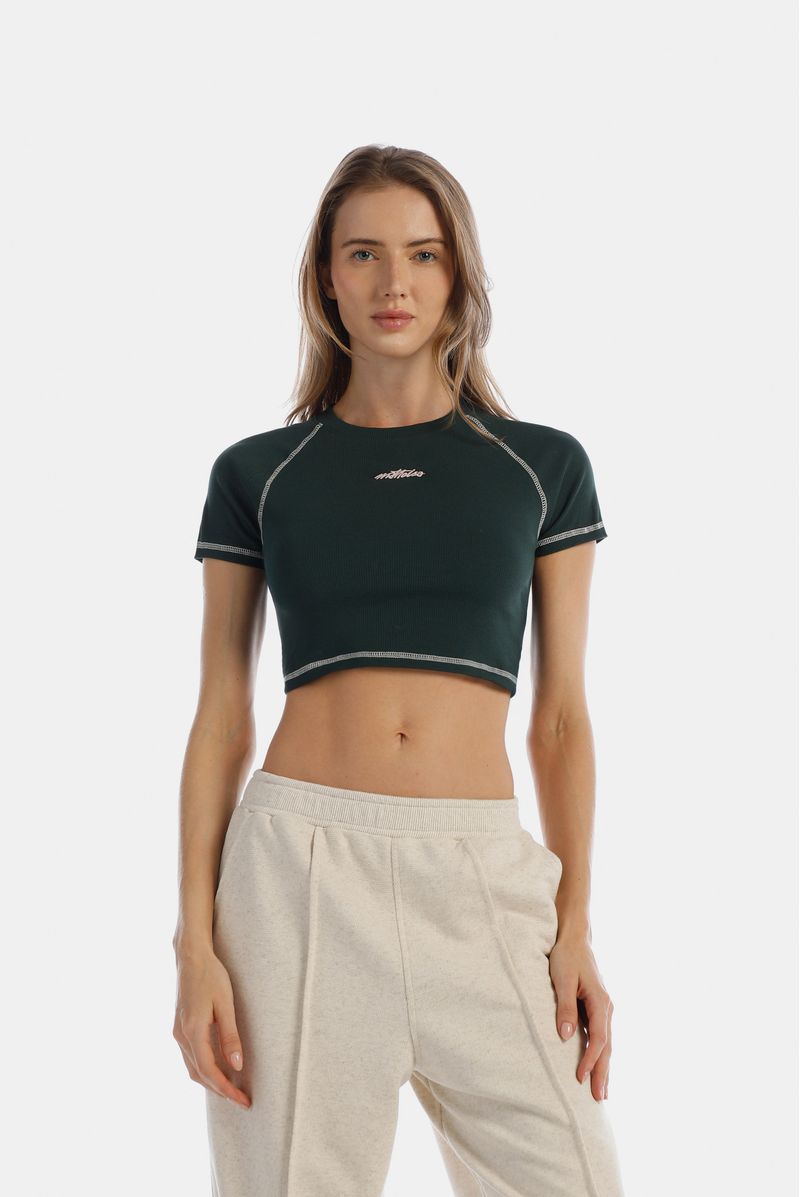 Camiseta verde confeccionada en un rib 1X1 con elastano de 280 gramos. La silueta es manga ranglan con costuras en contraste en color marfil. Texto "Mattelsa" bordado en centro pecho en color rosado. Aplique del conejo bordado sobre espalda.