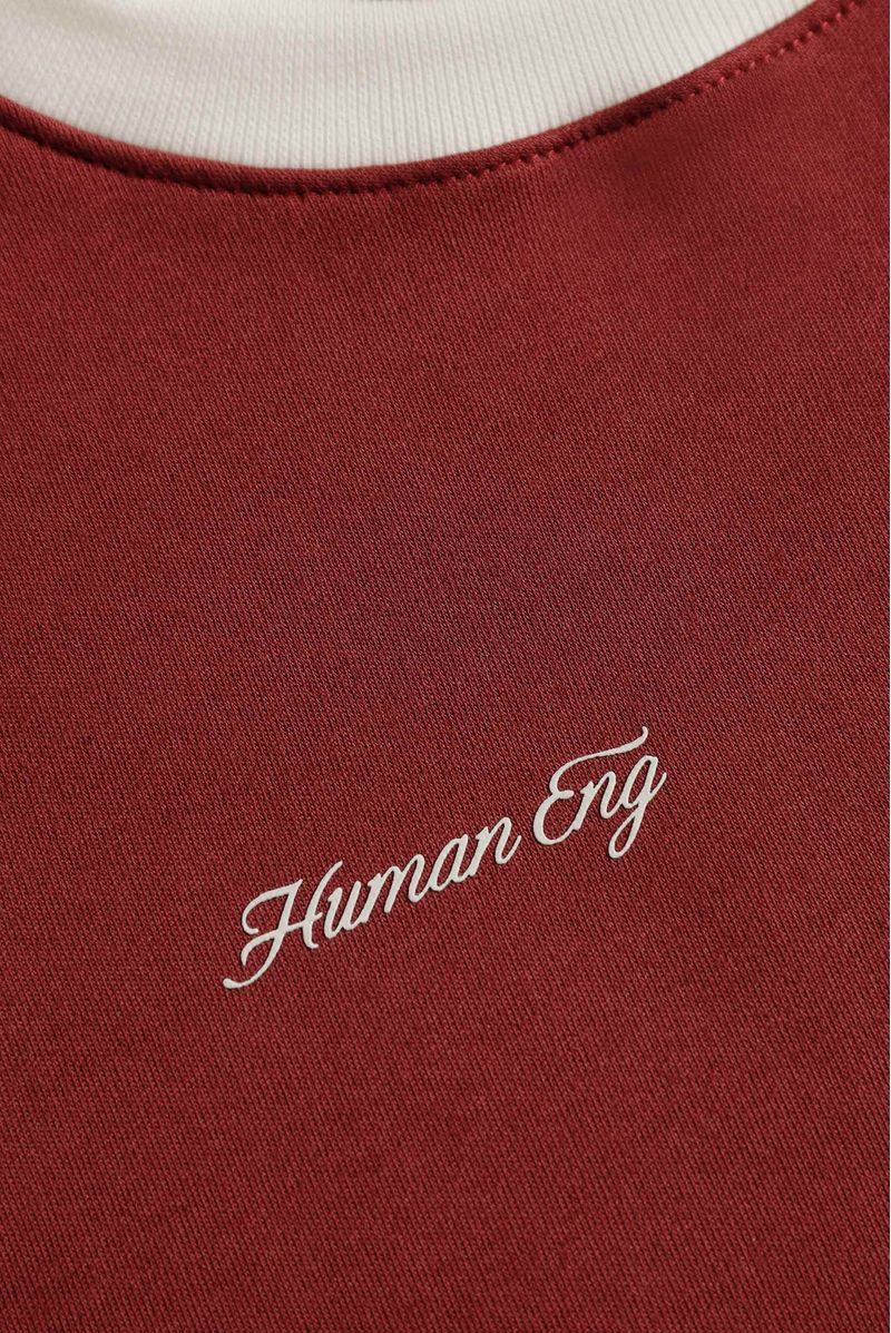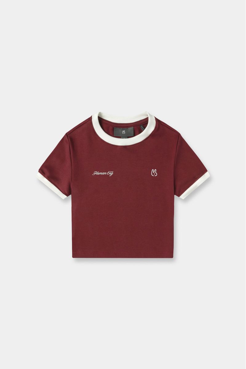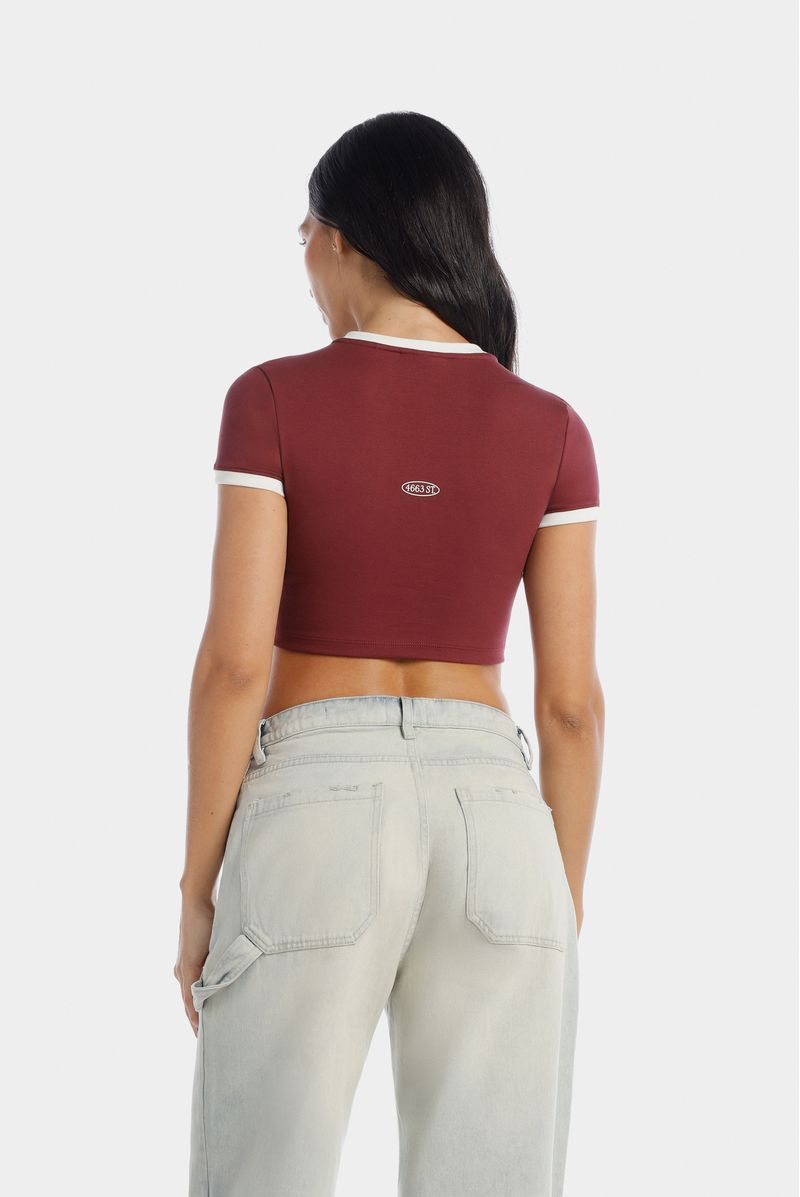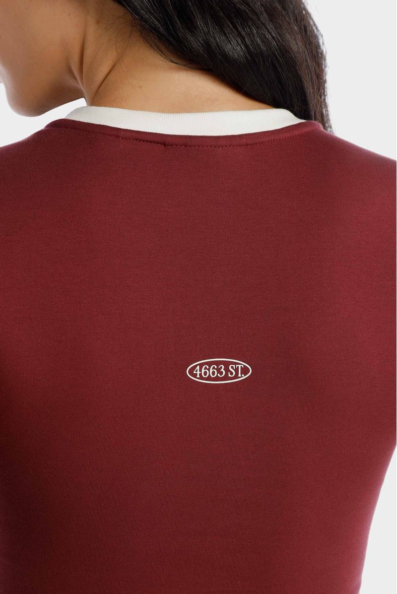 Camiseta vino de sesgos marfiles confeccionada en un rib con elastano de 310 gramos. Lleva texto e ilustración en el delantero color marfil y en el posterior texto color marfil.