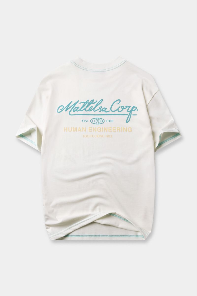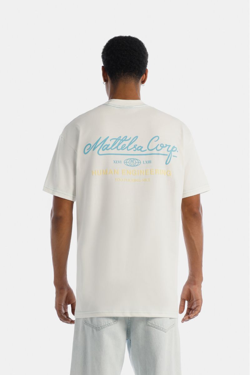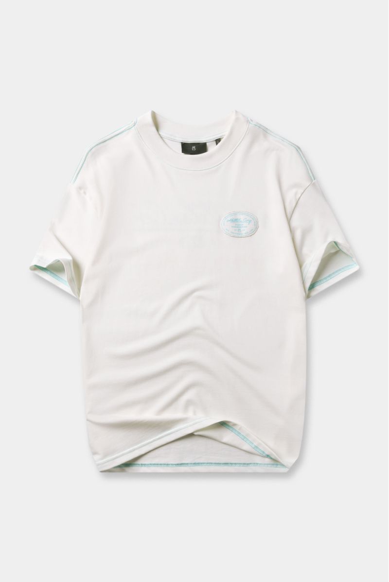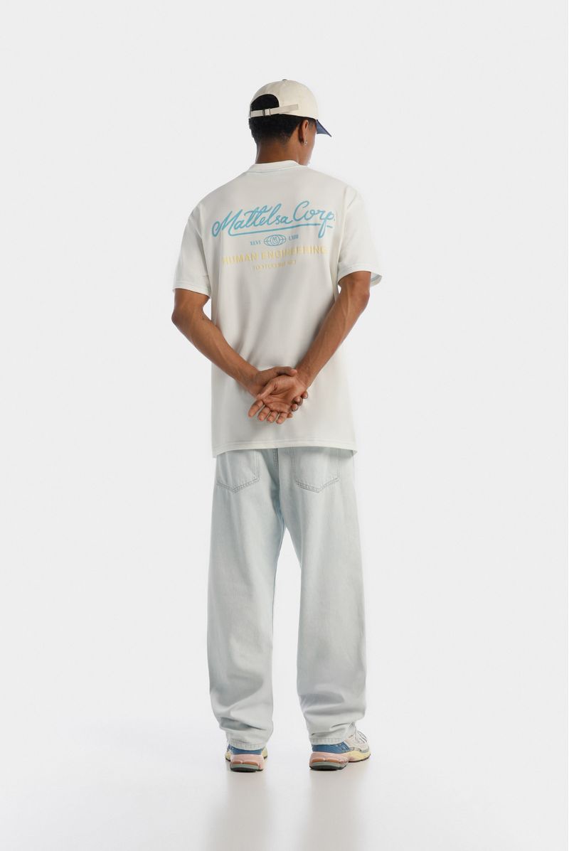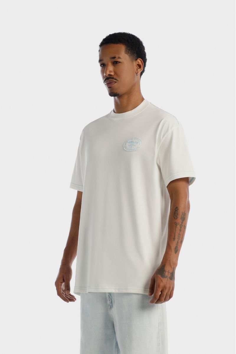 Camiseta Oversize confeccionada en un Jersey Premium de alto gramaje de 250gr de peso. En frente lleva un parche estampado en la técnica de plastisol y en espalda tiene un texto estampado en puff. Además lleva las costuras en contraste color azul.