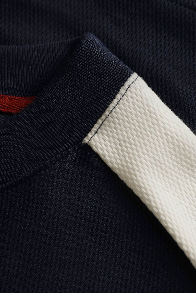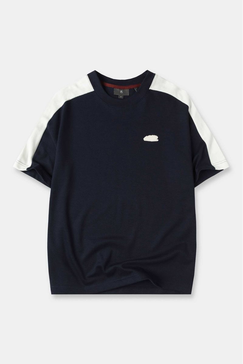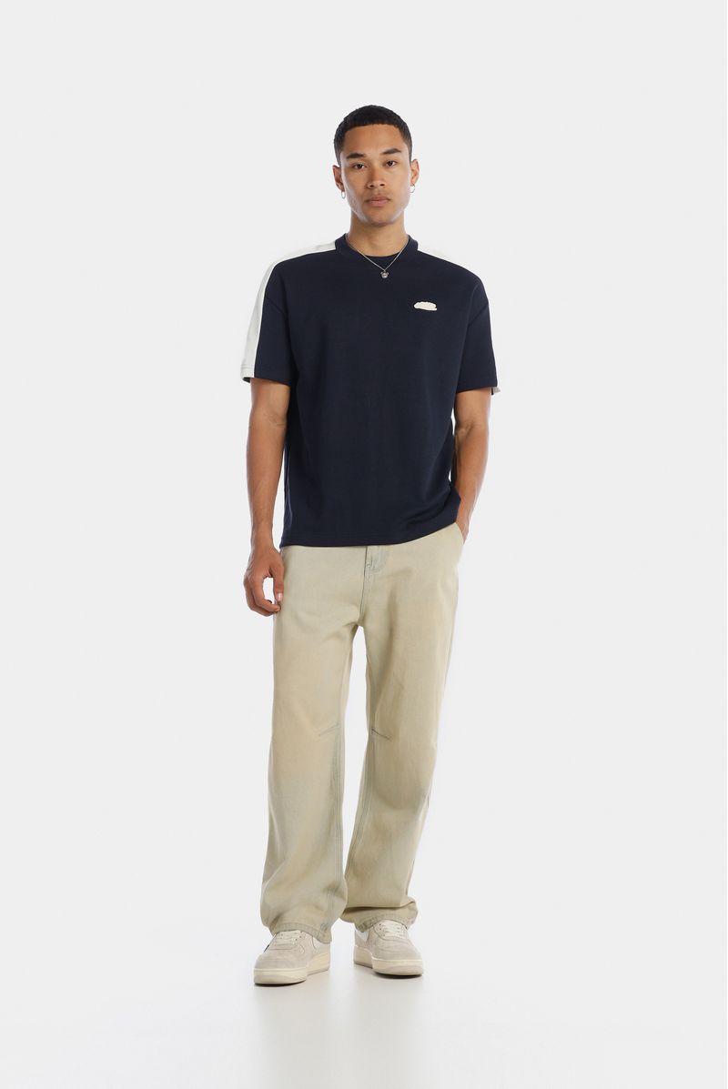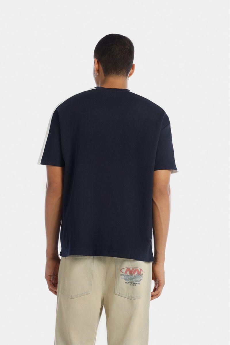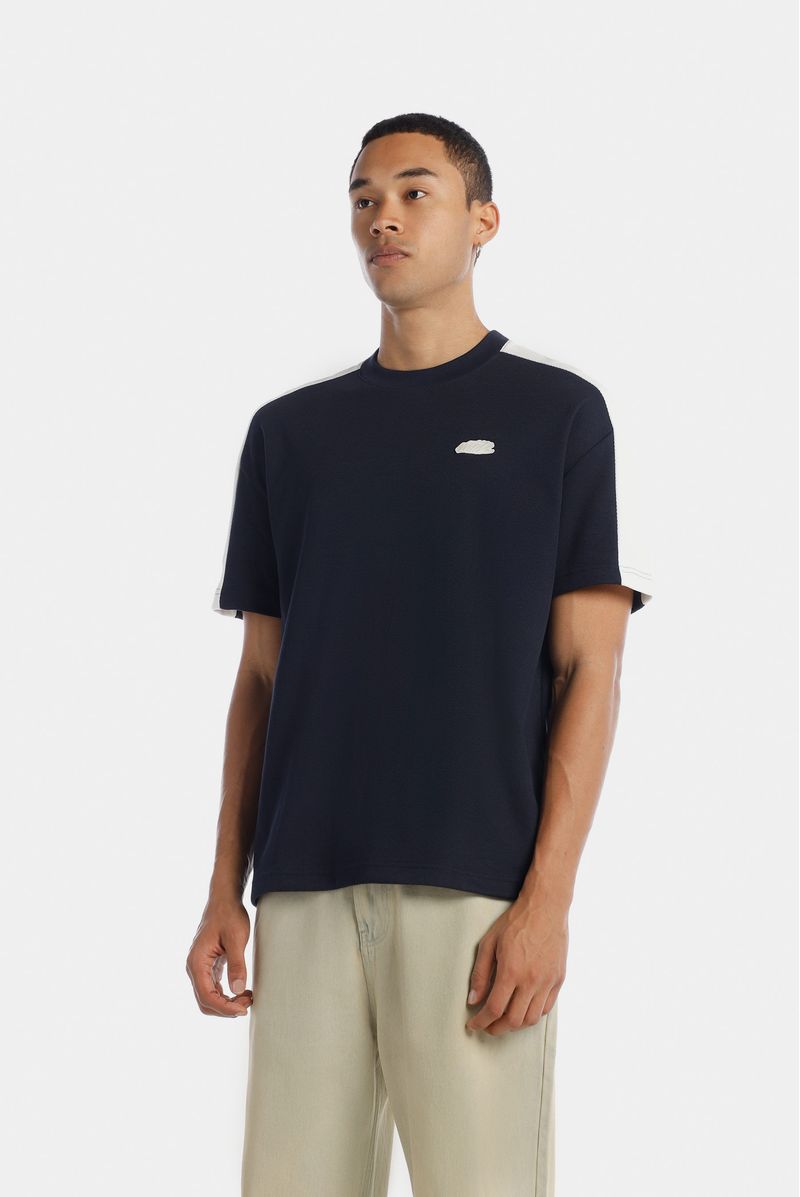 Camiseta Oversize confeccionada en un Jacquard Premium de alto gramaje de 320gr de peso. En frente lleva un aplique bordado, entonado en color marfil con las piezas en hombro y mangas. Además lleva el tapa cuello en contraste color vino.