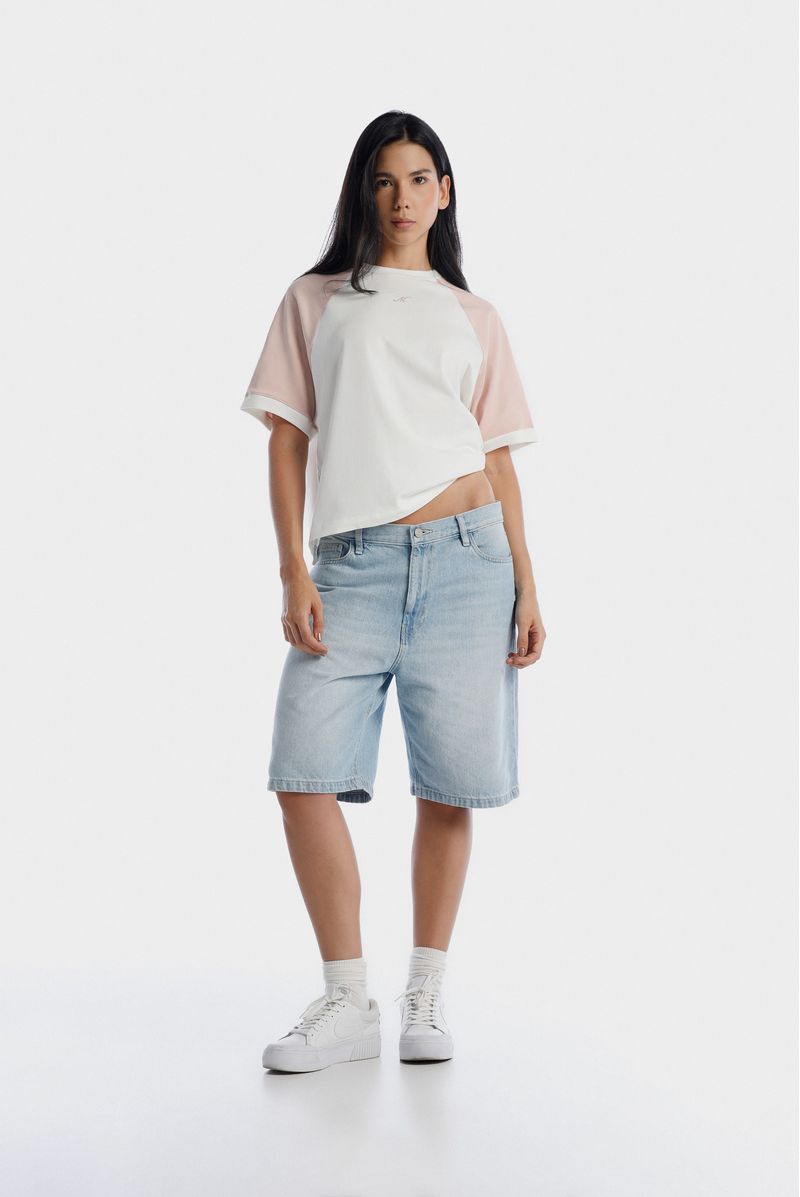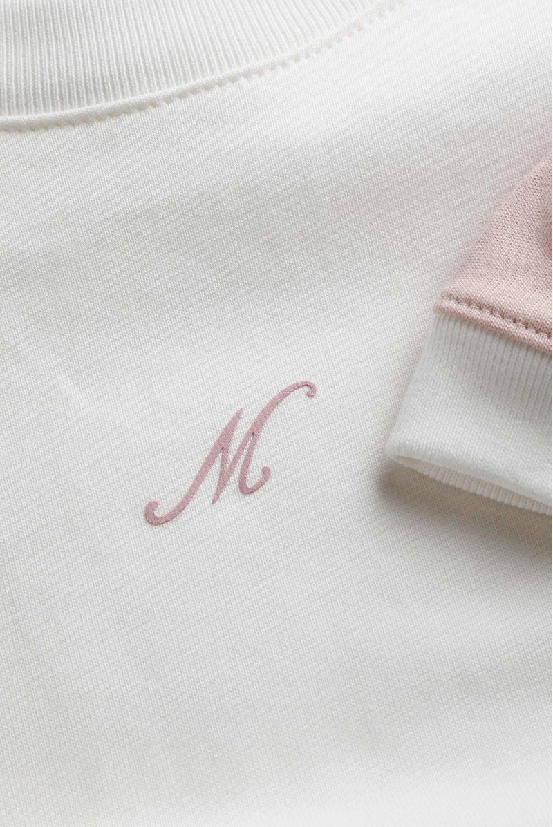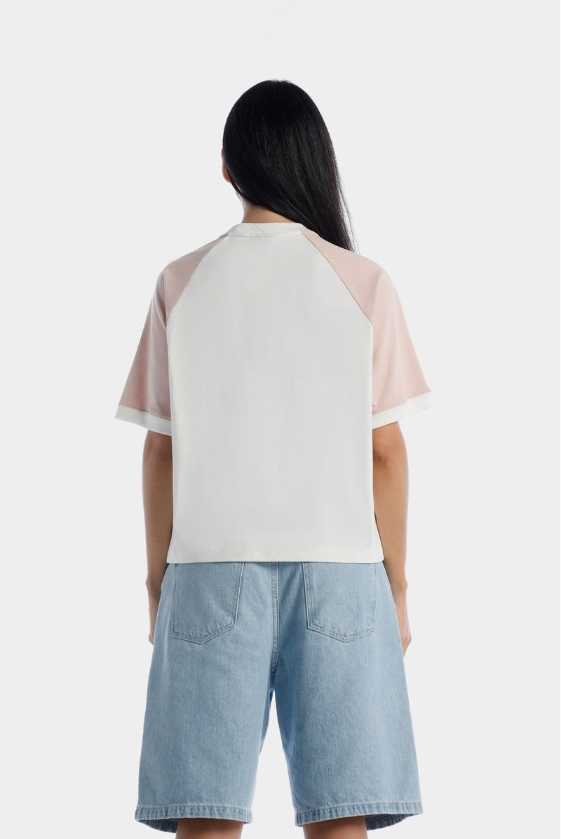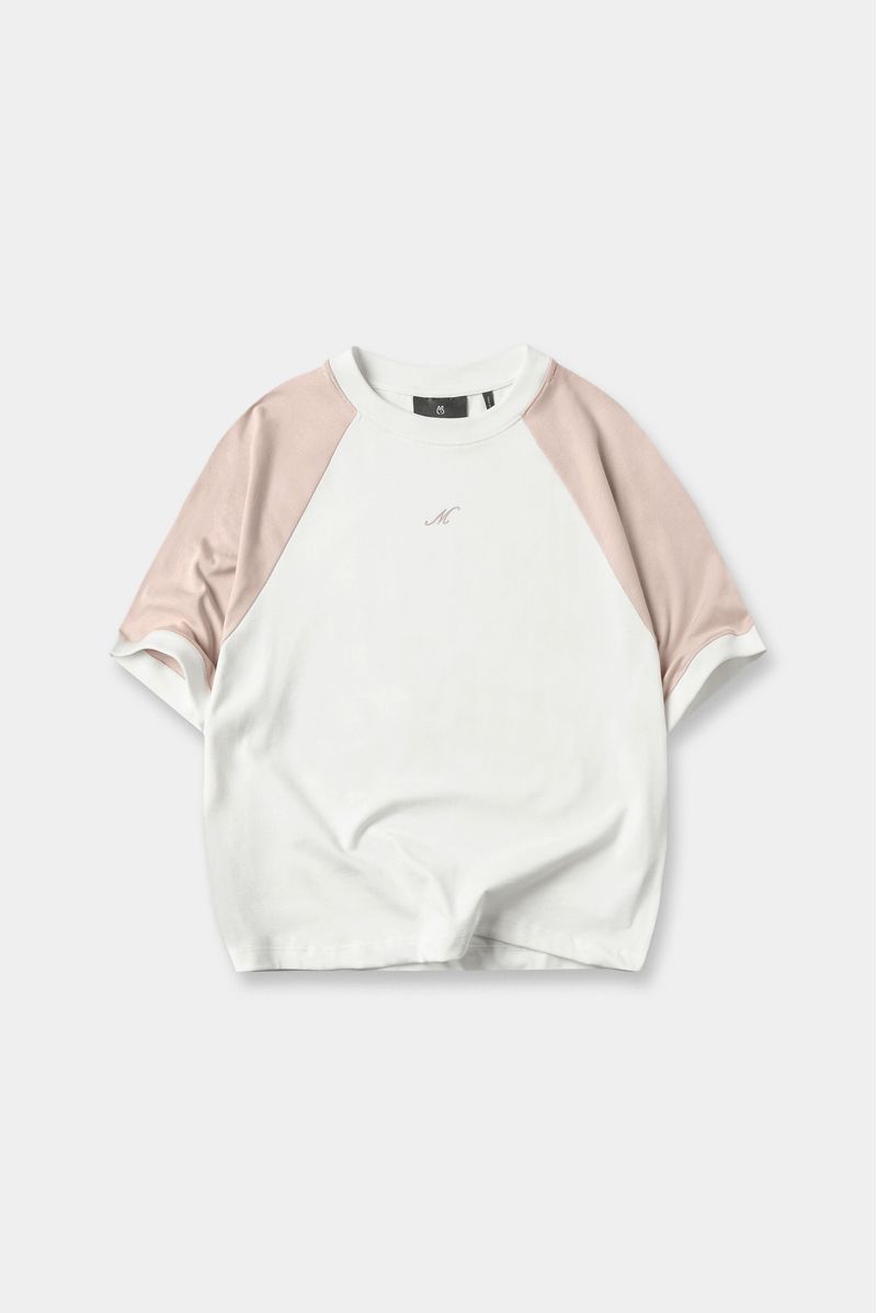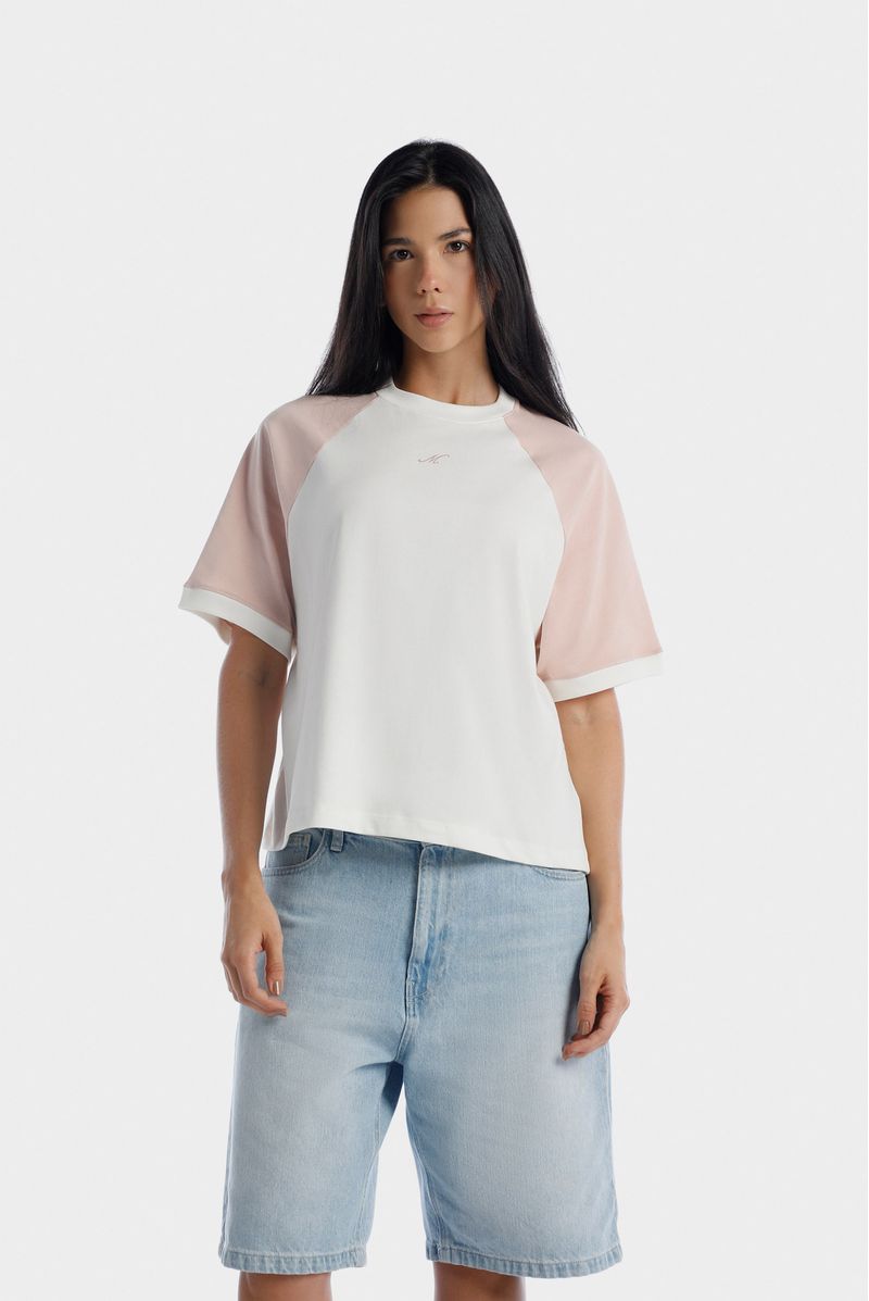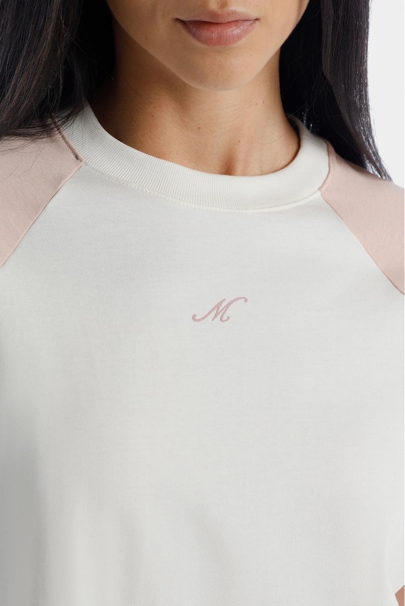 Camiseta blanca manga ranglan confeccionada en un jersey de 250 gramos. Mangas en jersey color rosado. Cuello y puños en rib color marfil. Letra M estampada en alta densidad en centro pecho en color rosa entonado a las mangas.