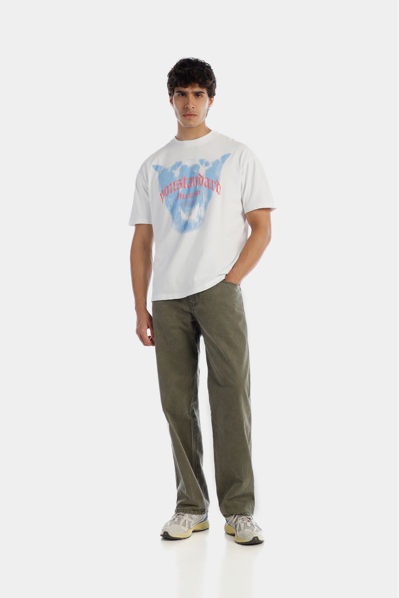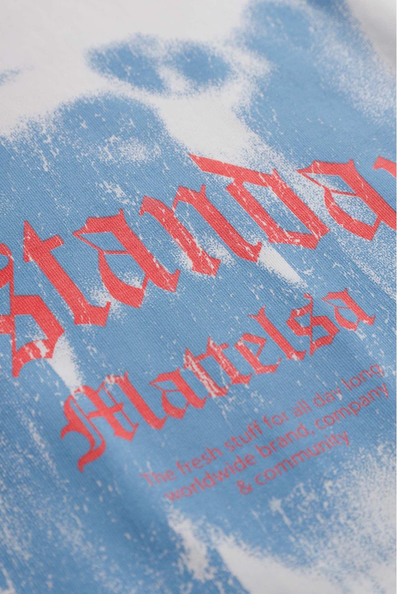 Camiseta Oversize confeccionada en un Jersey Premium de alto gramaje de 240gr de peso. Con estampación en frente y espalda en estampación textil. Además lleva el cuello y los ruedos rústicos con acabado en motortul y un banderín.
