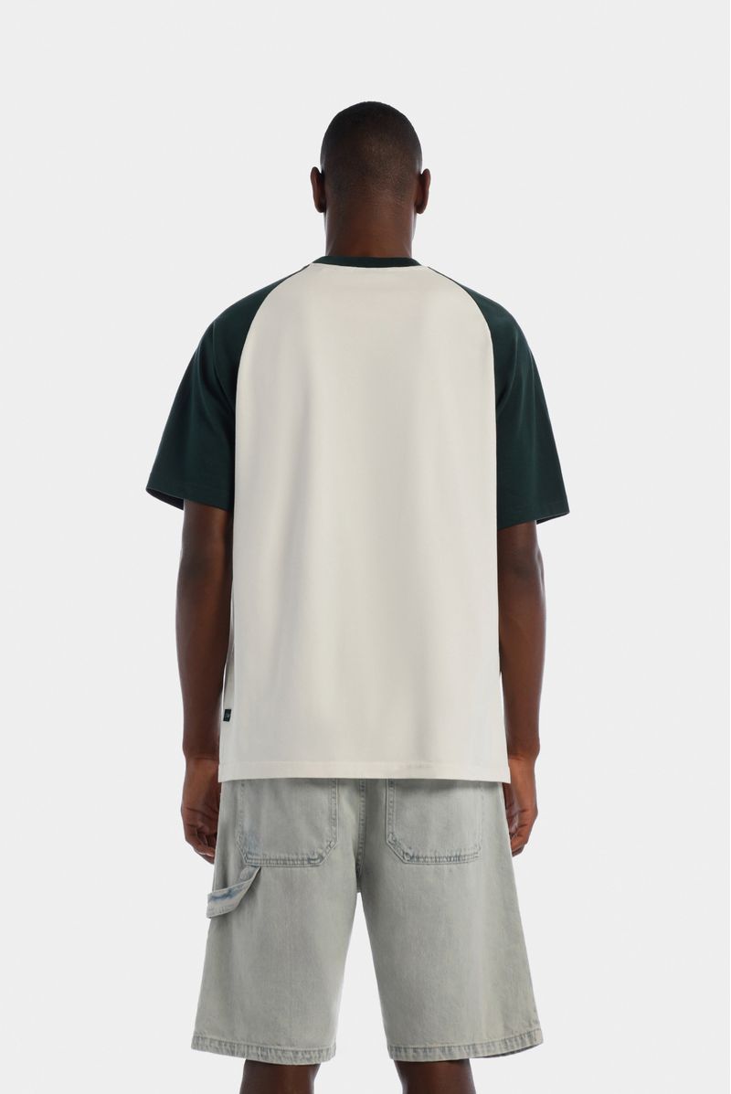 Camiseta Oversize confeccionada en un Jersey Premium de alto gramaje de 250gr de peso. Con estampación en frente en alta densidad. Tiene mangas tipo ranglan en contraste, un banderín en costado y en frente un aplique bordado con el logo de la marca.