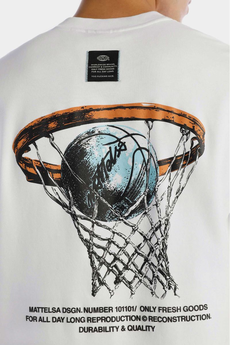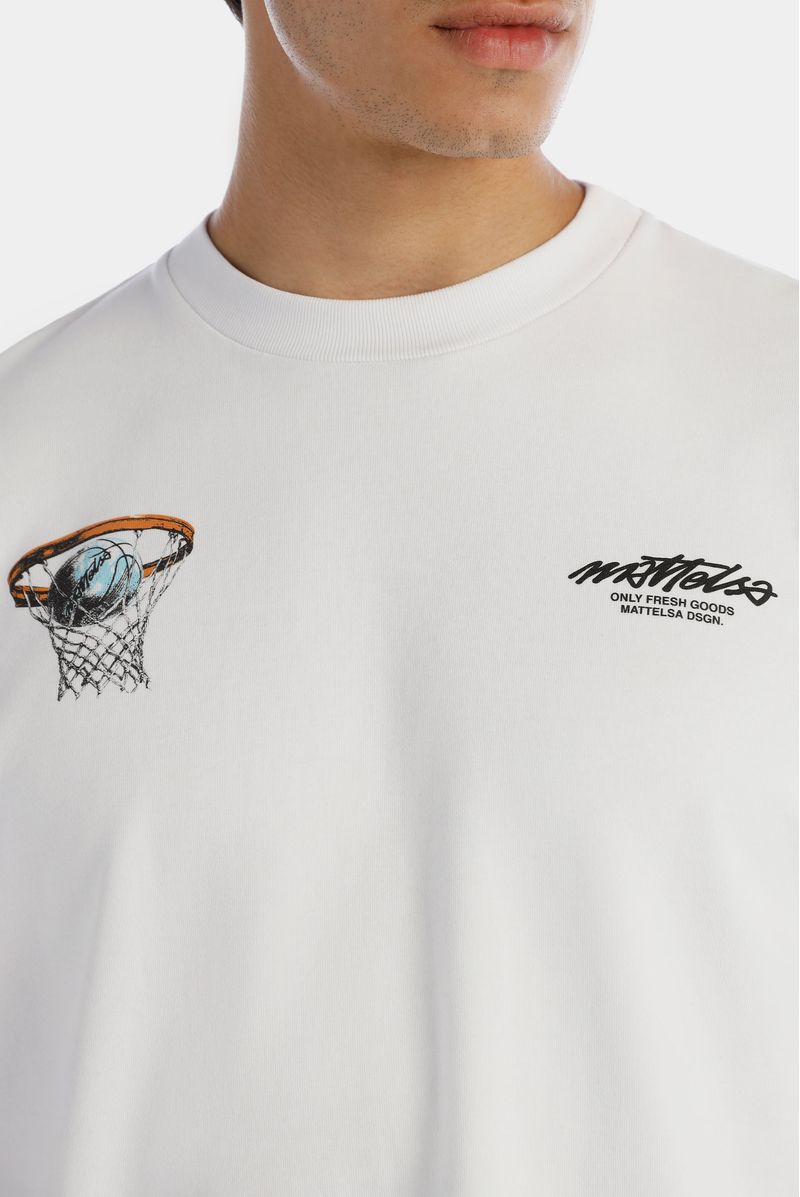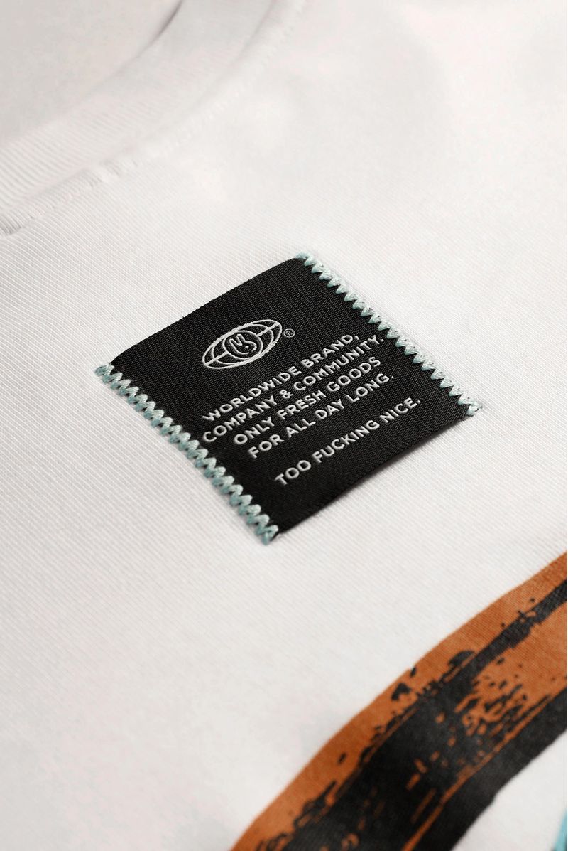 Camiseta Oversize confeccionada en un Jersey Premium de alto gramaje de 325gr de peso. Con estampación en frente en plastisol y en espalda combinando 2 técnicas, plastisol y alta densidad. Además lleva un banderín bordado en costados en zigzag.