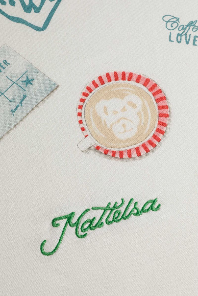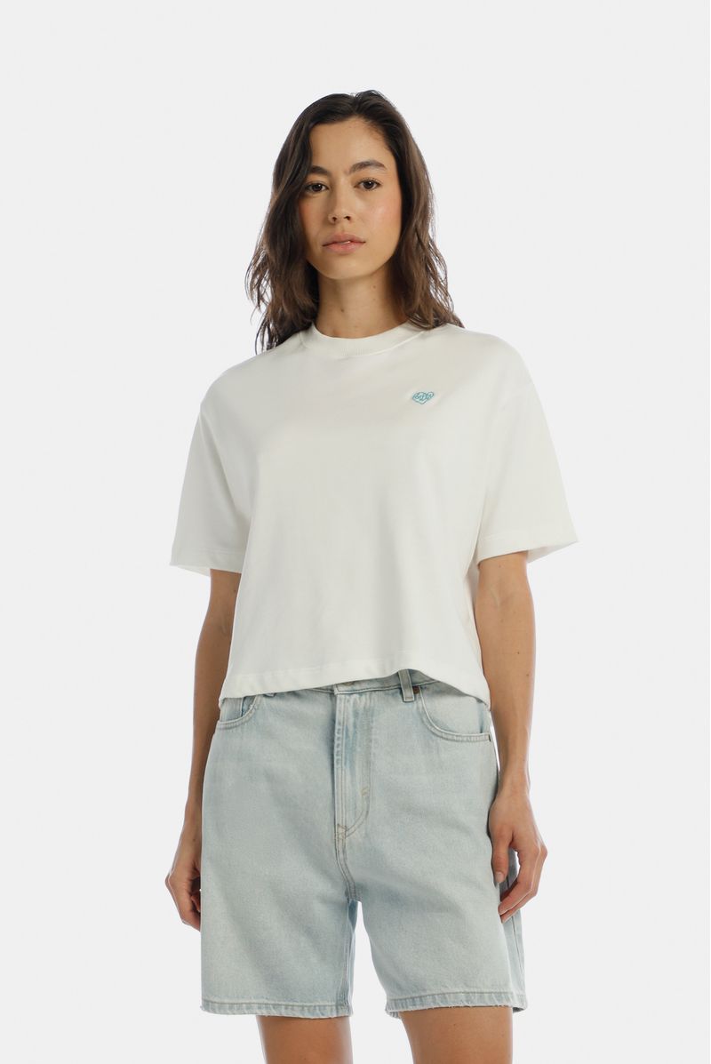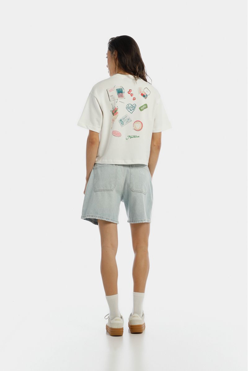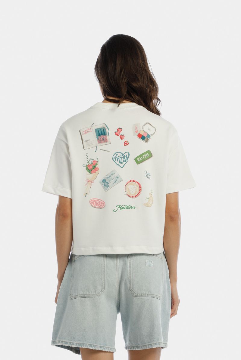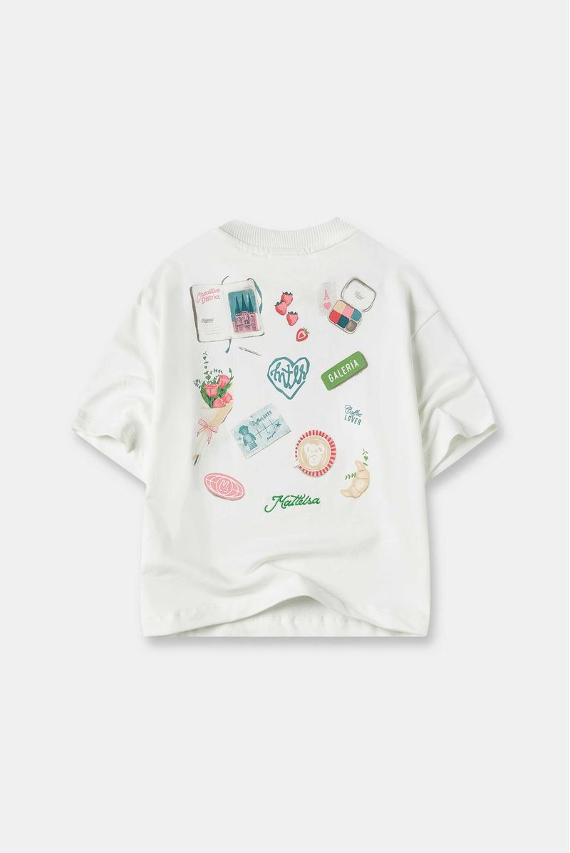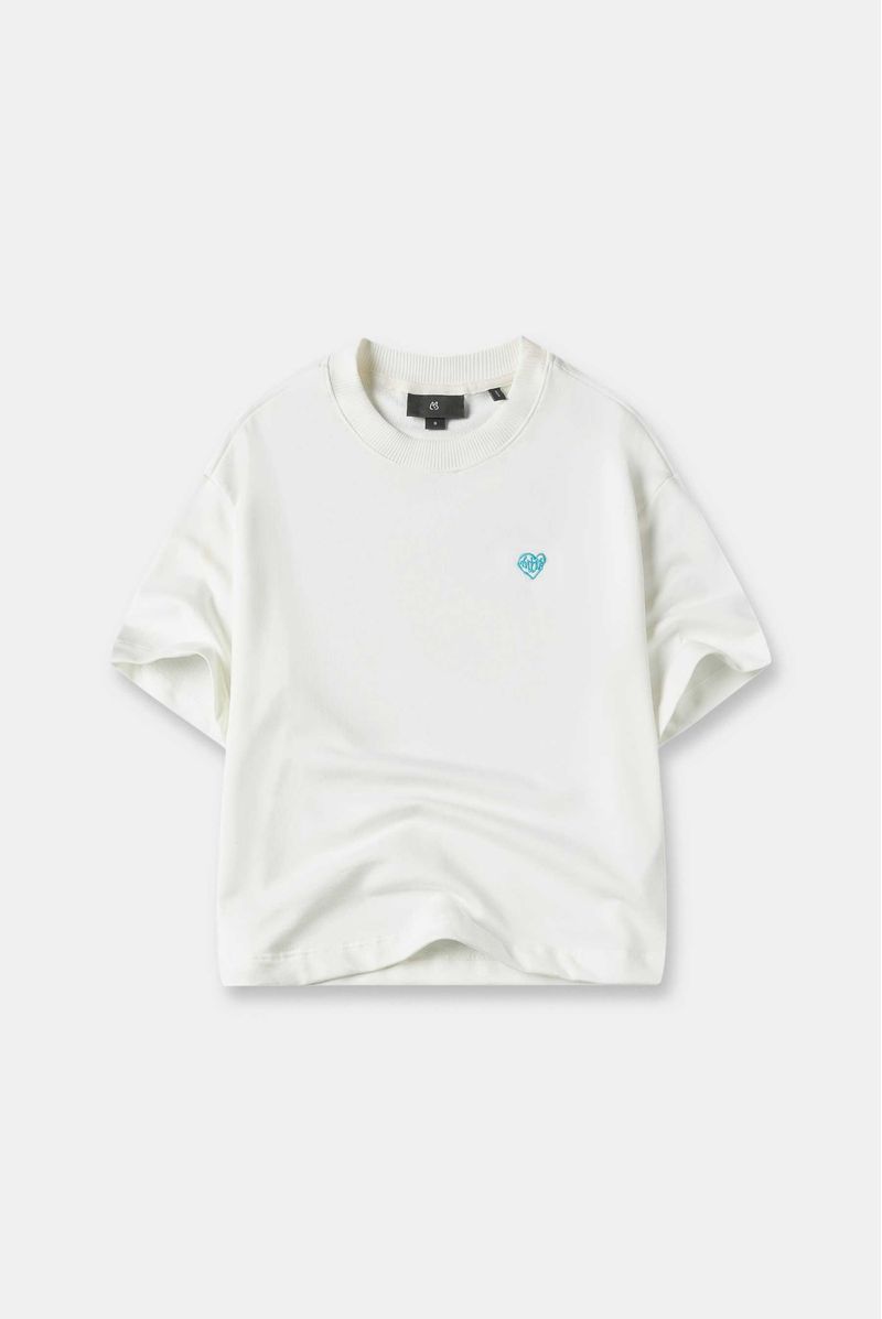 Camiseta marfil, confeccionada en una Burda de 240gr. Lleva cuello en Rib, bordado en punto corazón y en posterior bordado con estampación.