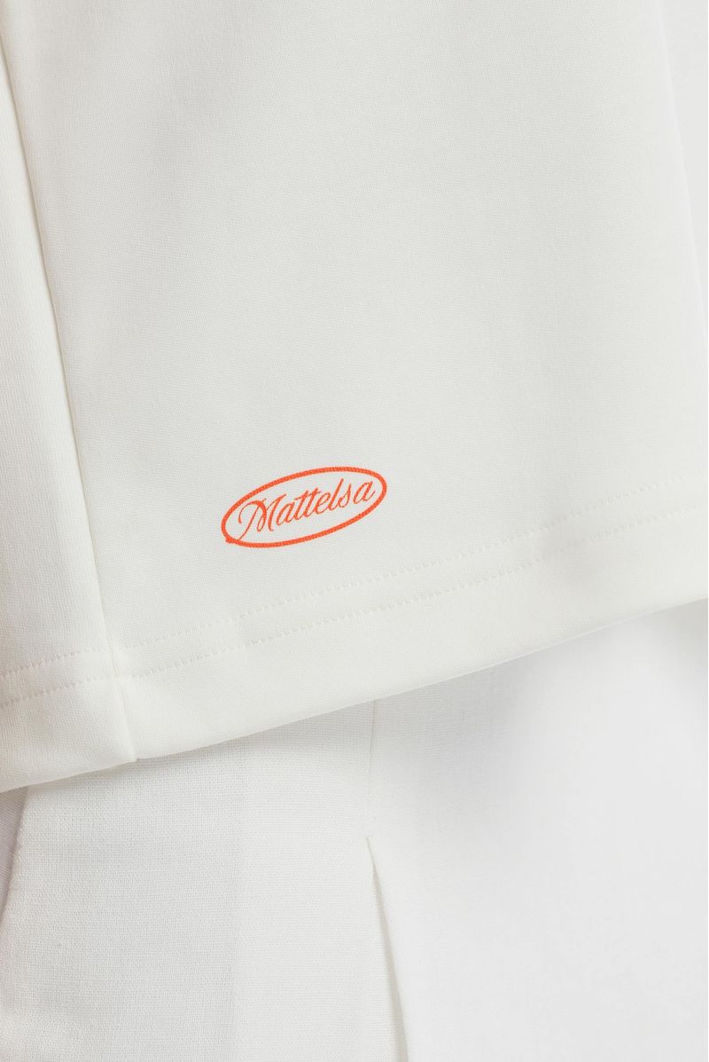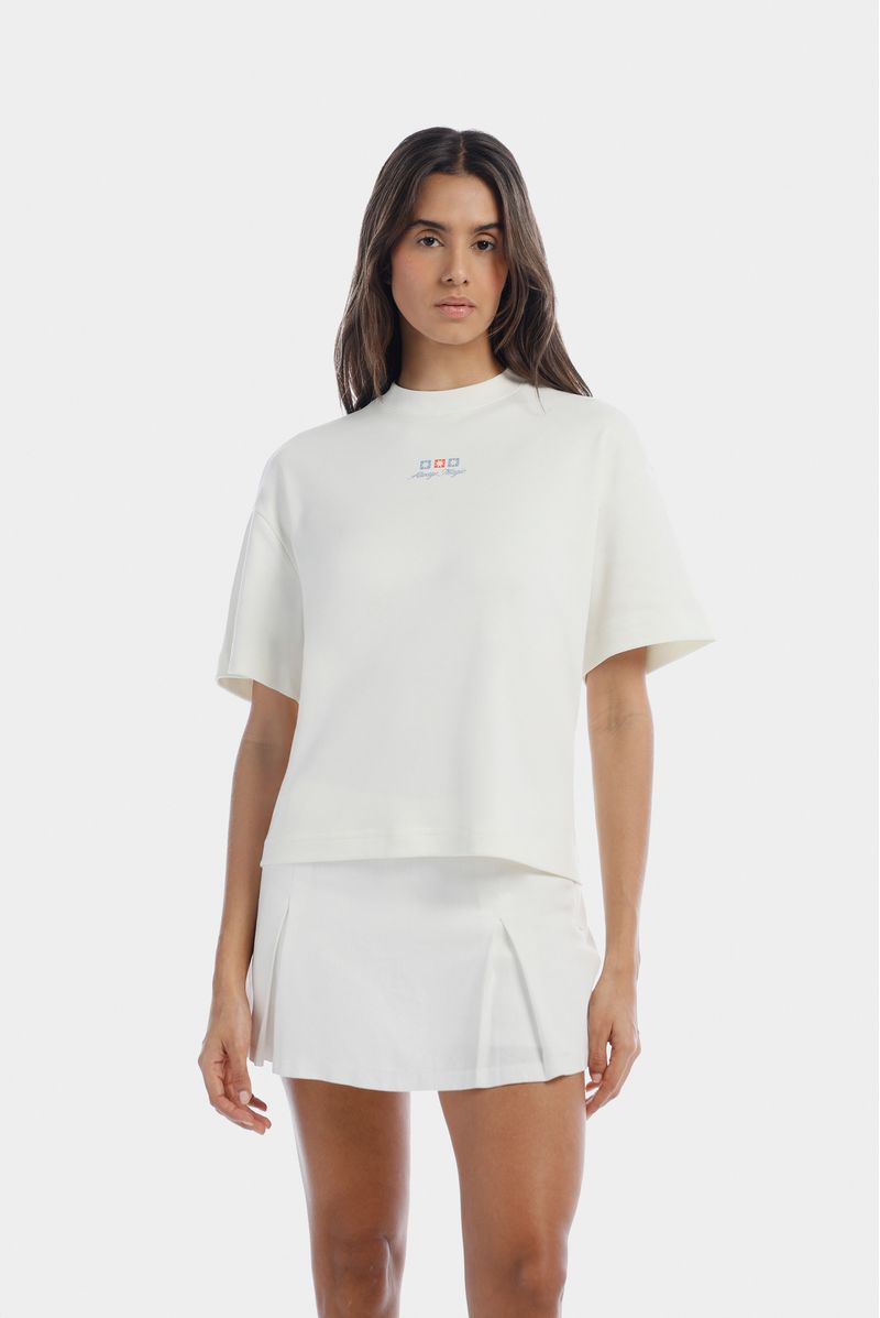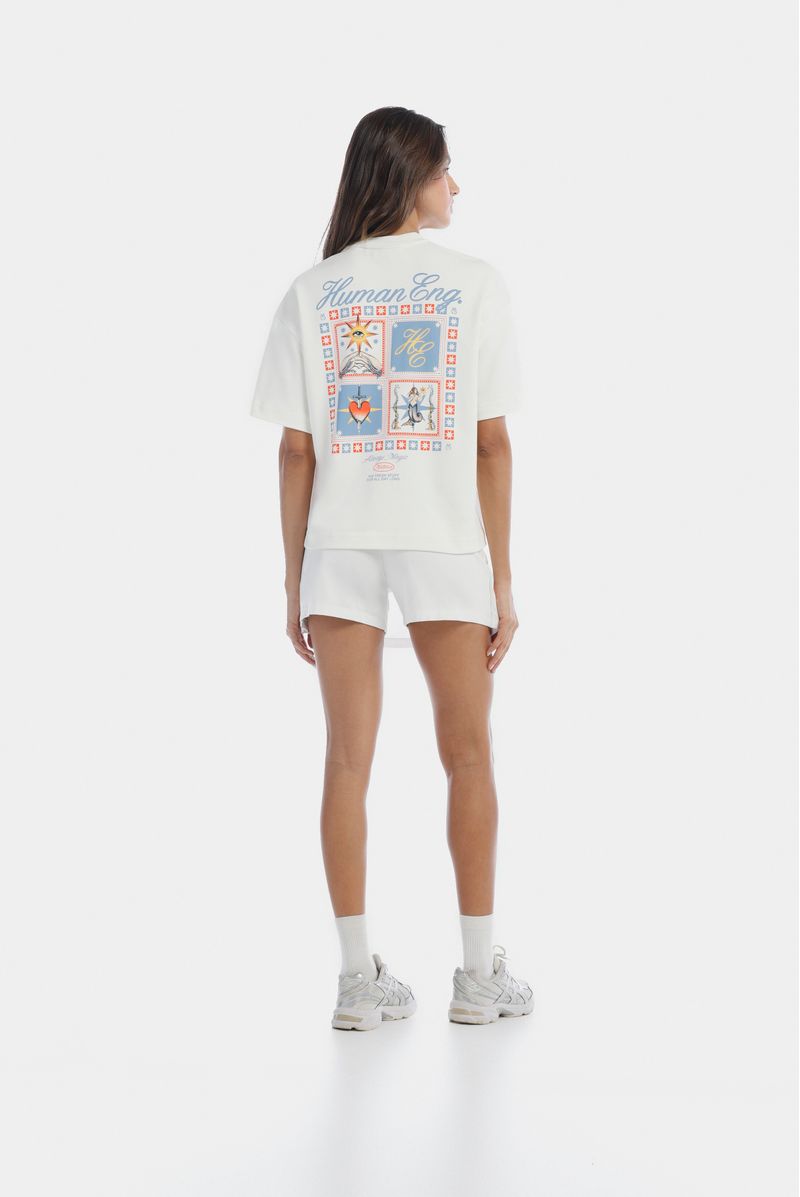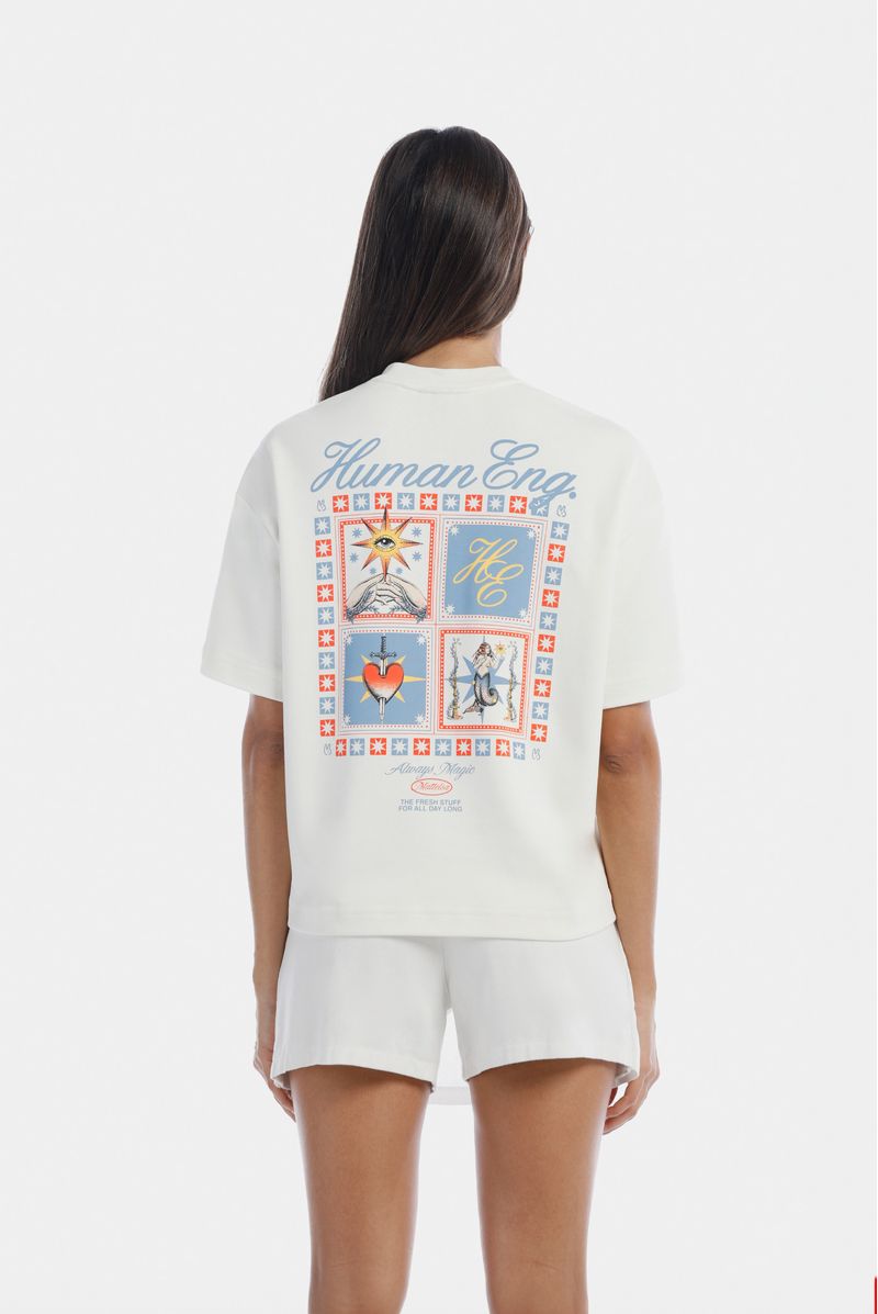 Camiseta color marfil confeccionada en tejido jersey 20/1 de 325 g. Presenta fit Oversize y lleva un texto en estampado textil ubicado en el centro del pecho, además de un estampado en gran formato en la misma técnica en la parte posterior.