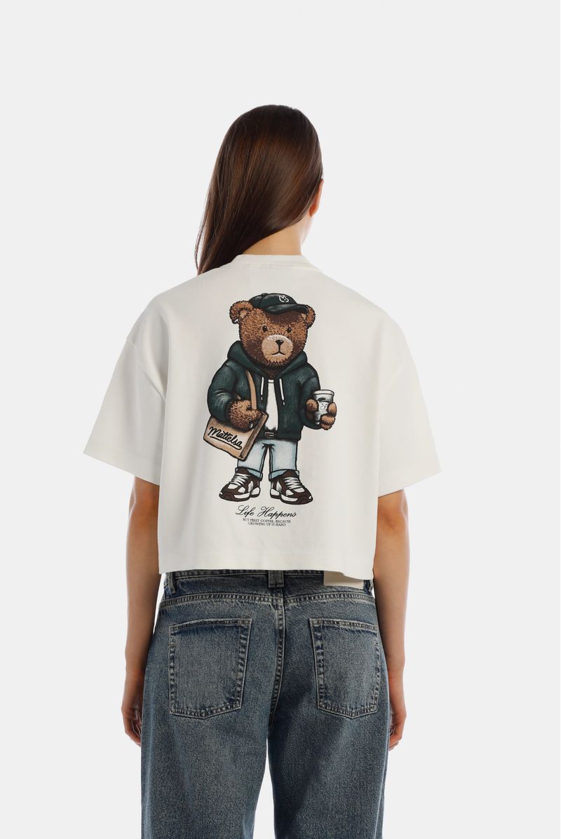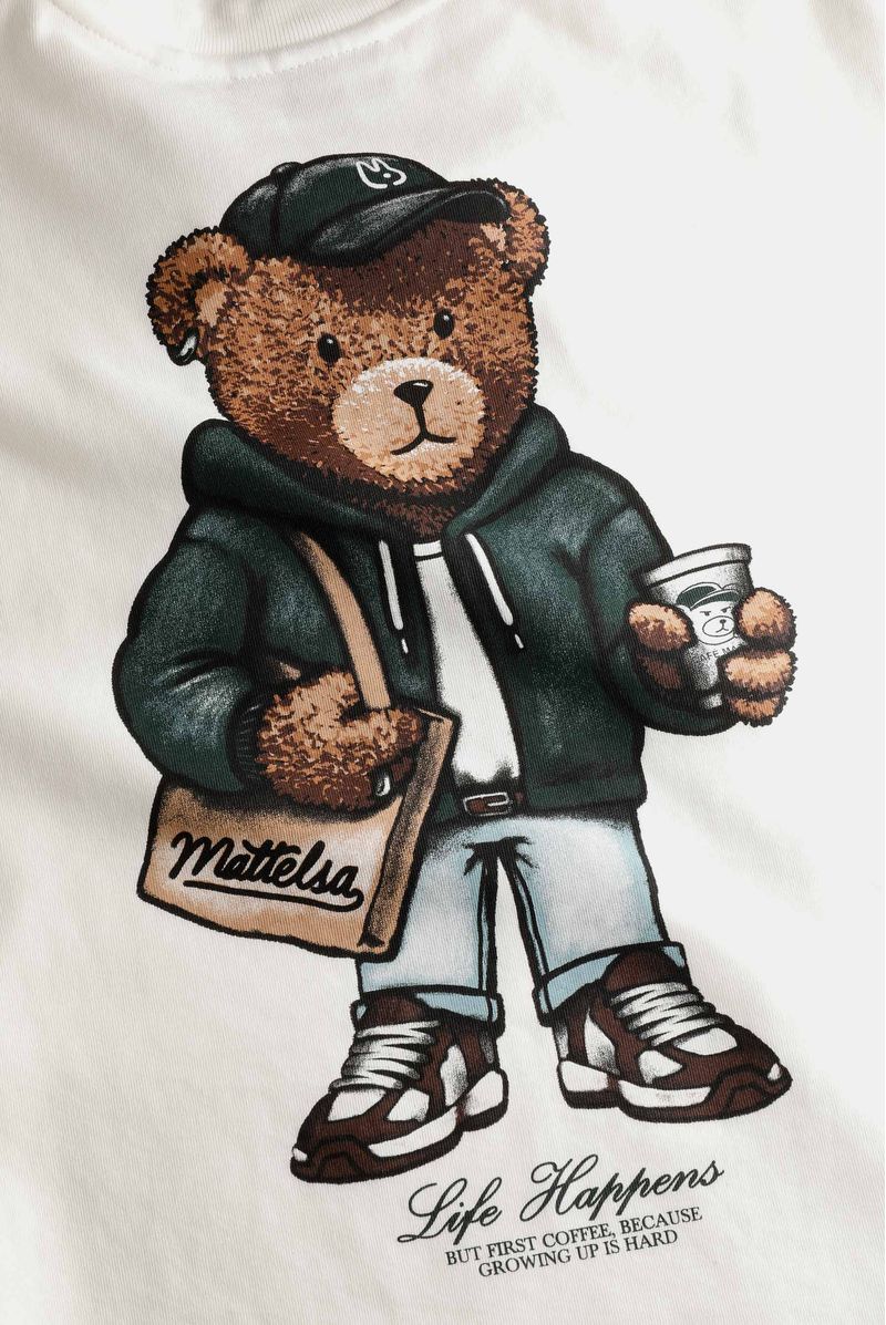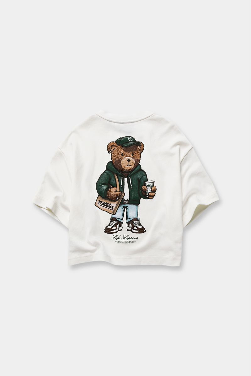 Camiseta marfil confeccionada en un de 325 gramos. Ilustración de oso en gran formato en espalda en estampación textil. Texto en delantero en plastisol en alta densidad. Banderín bordado en parte baja del delantero. Molde amplio, largo regular.